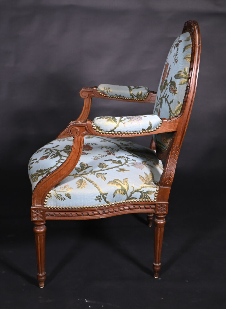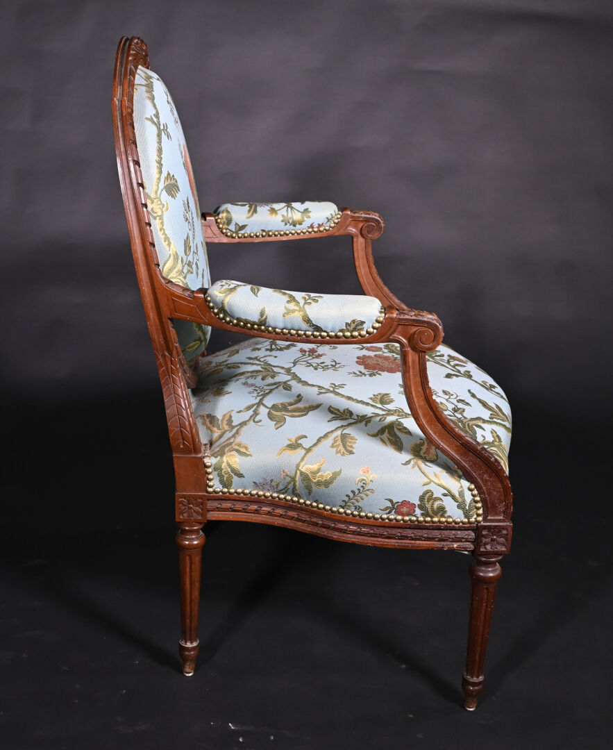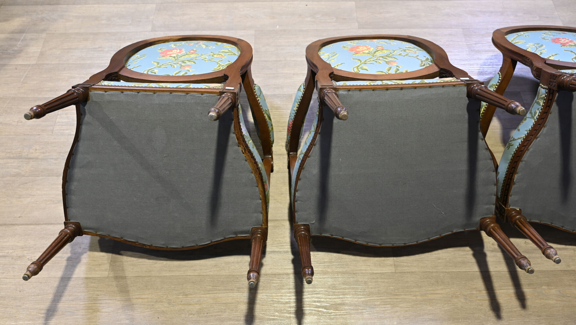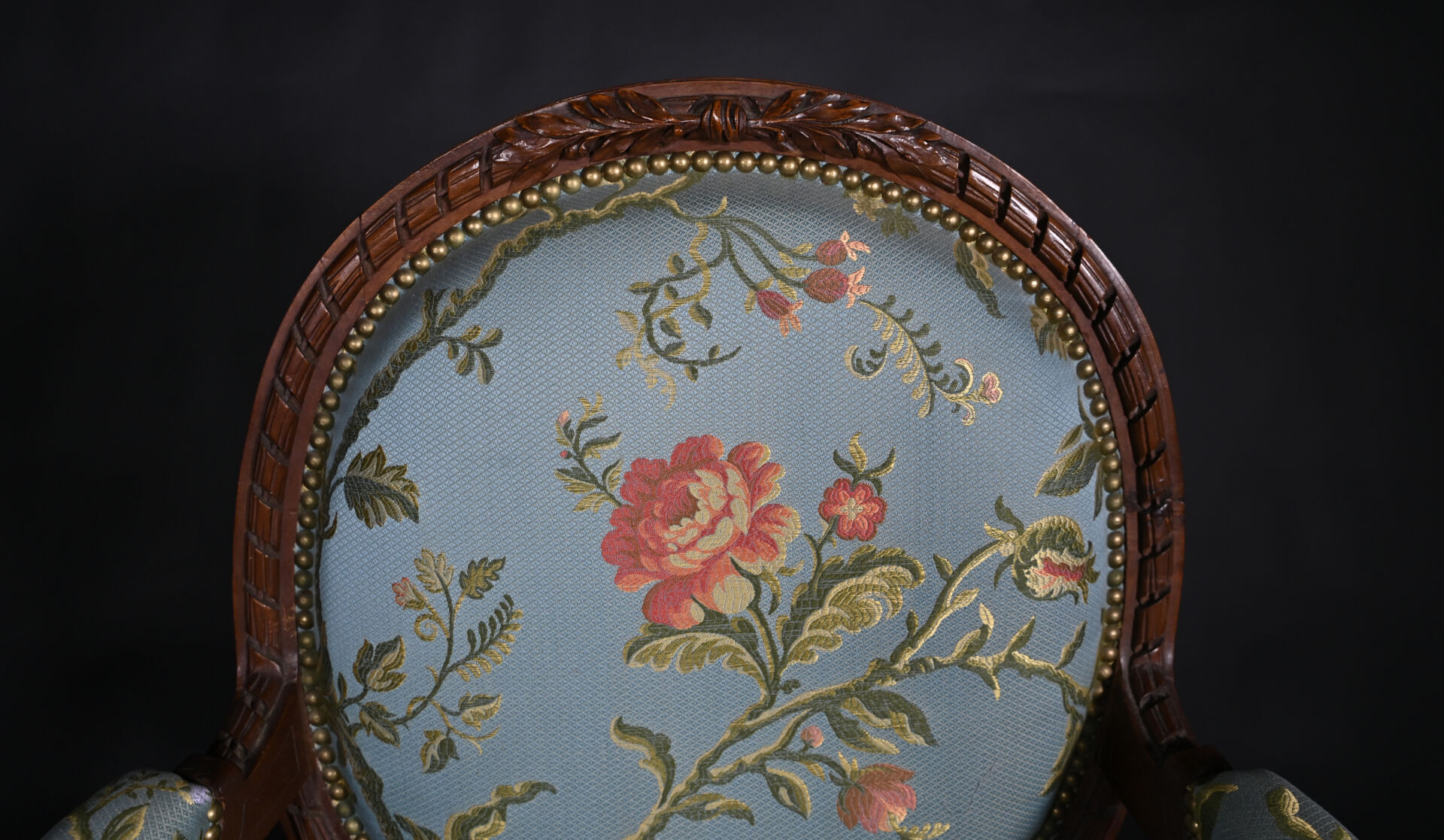 Suite de 4 fauteuils médaillon en bois mouluré sculpté de rubans tors. Les accotoirs à manchettes, les pieds fuselés cannelés. Garniture de tissu fleuri sur fond bleu. Style Louis XVI, XXe siècle. Haut. : 98 cm.