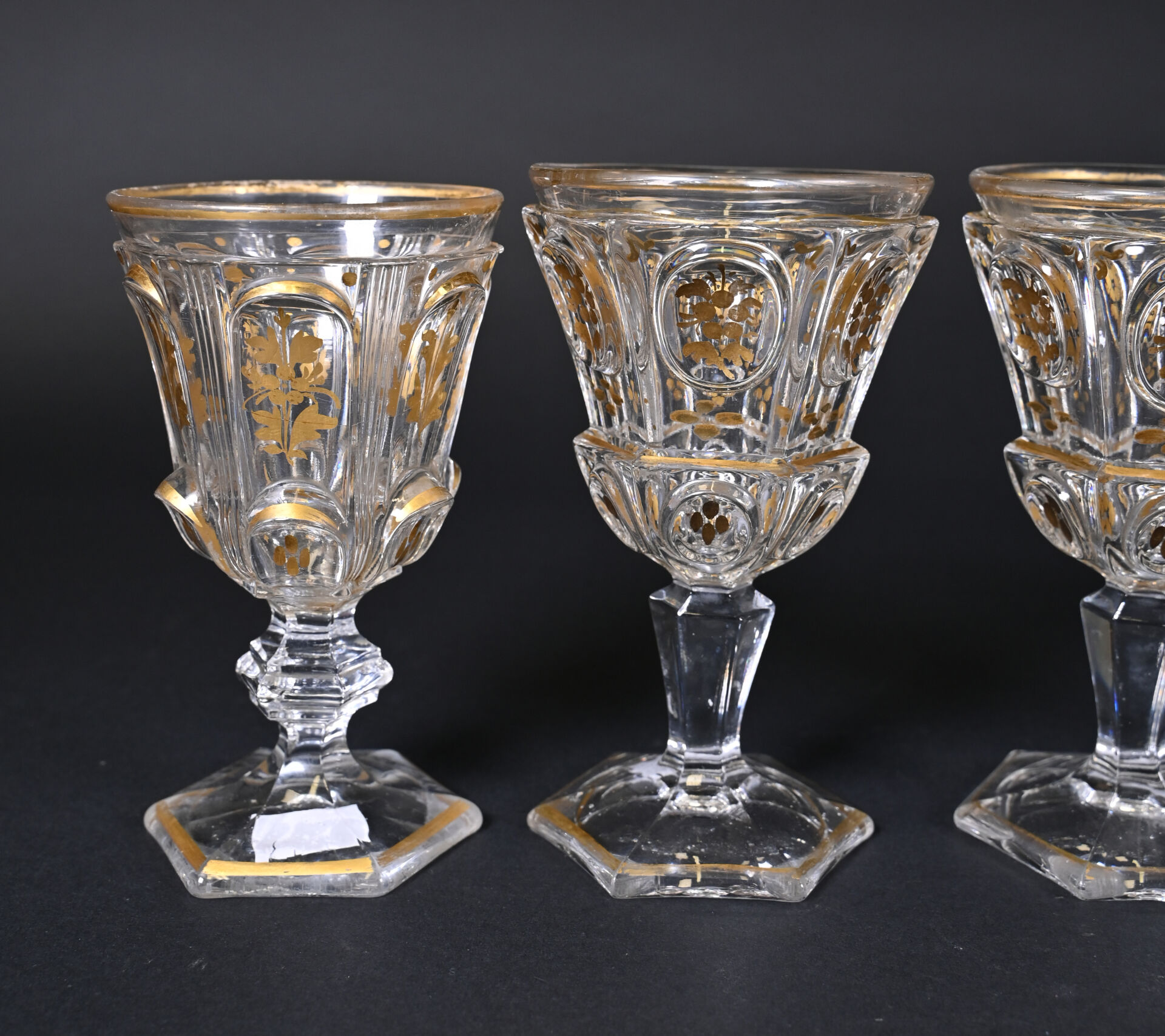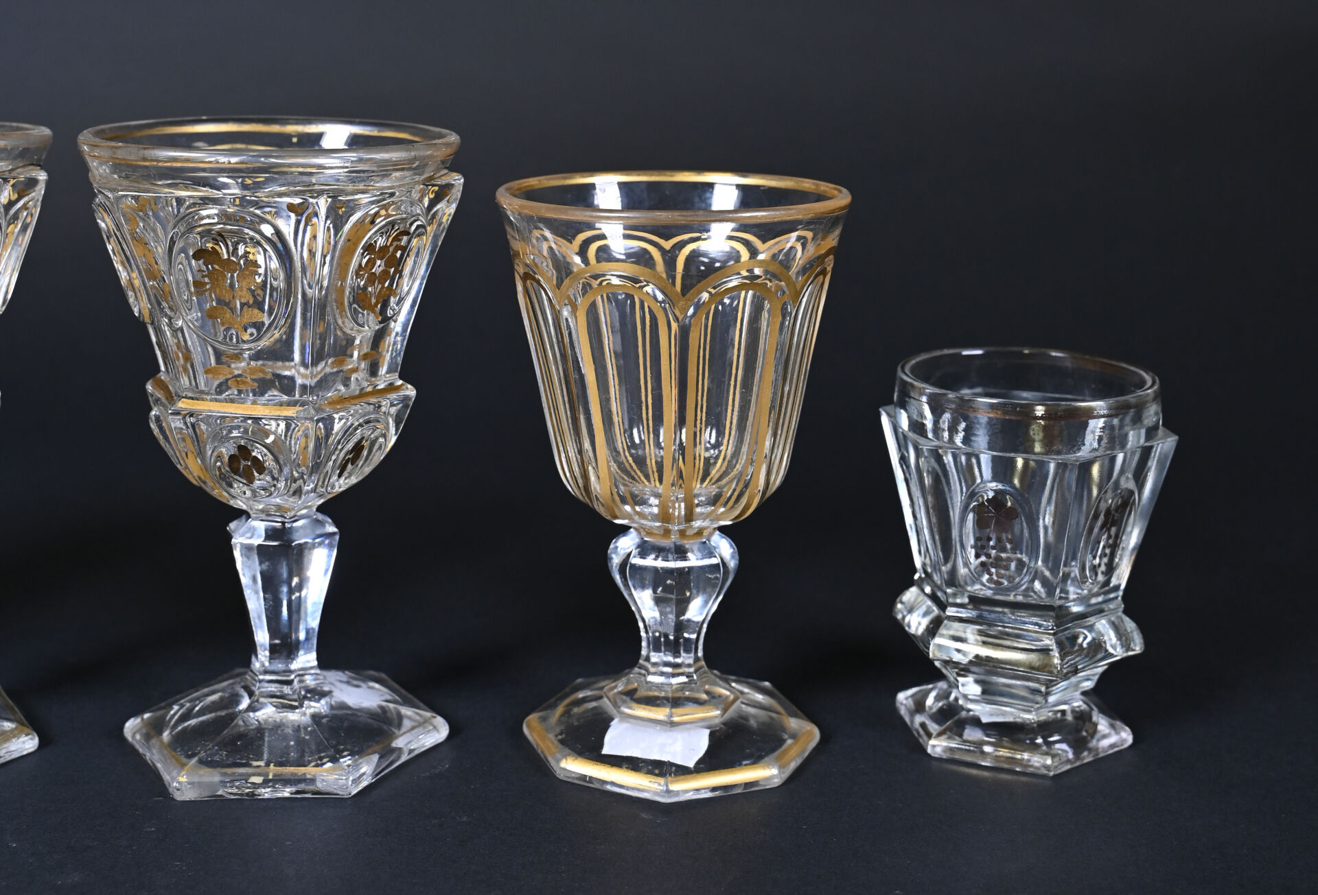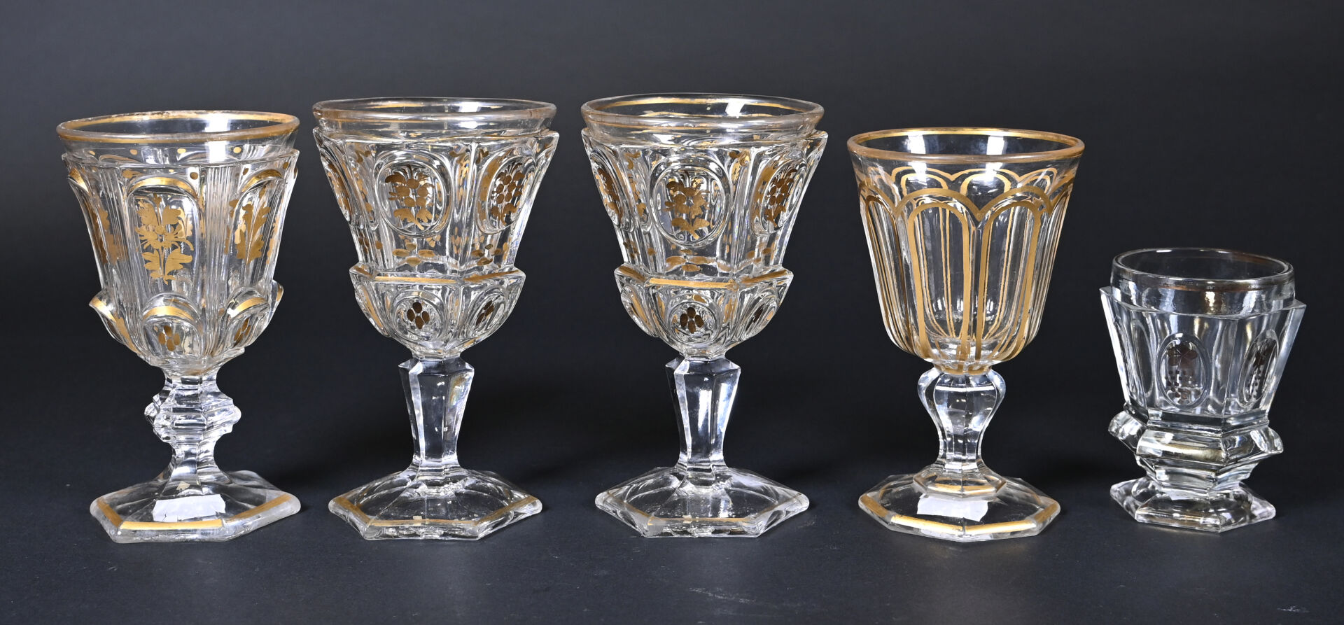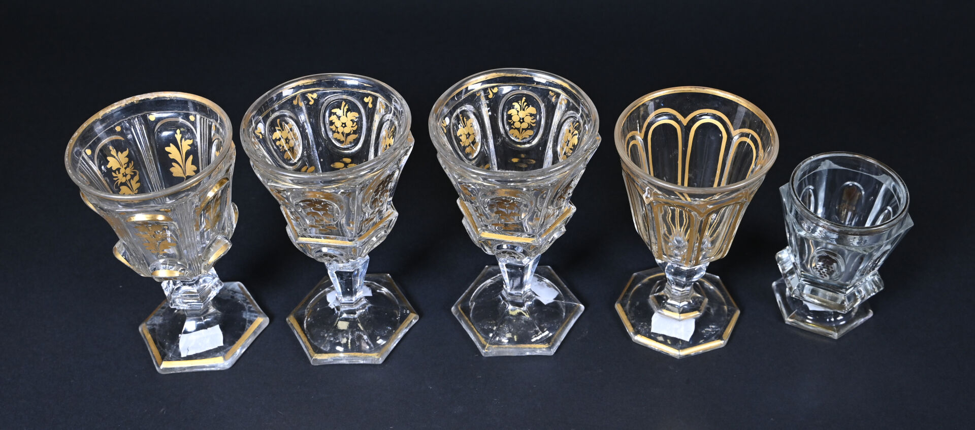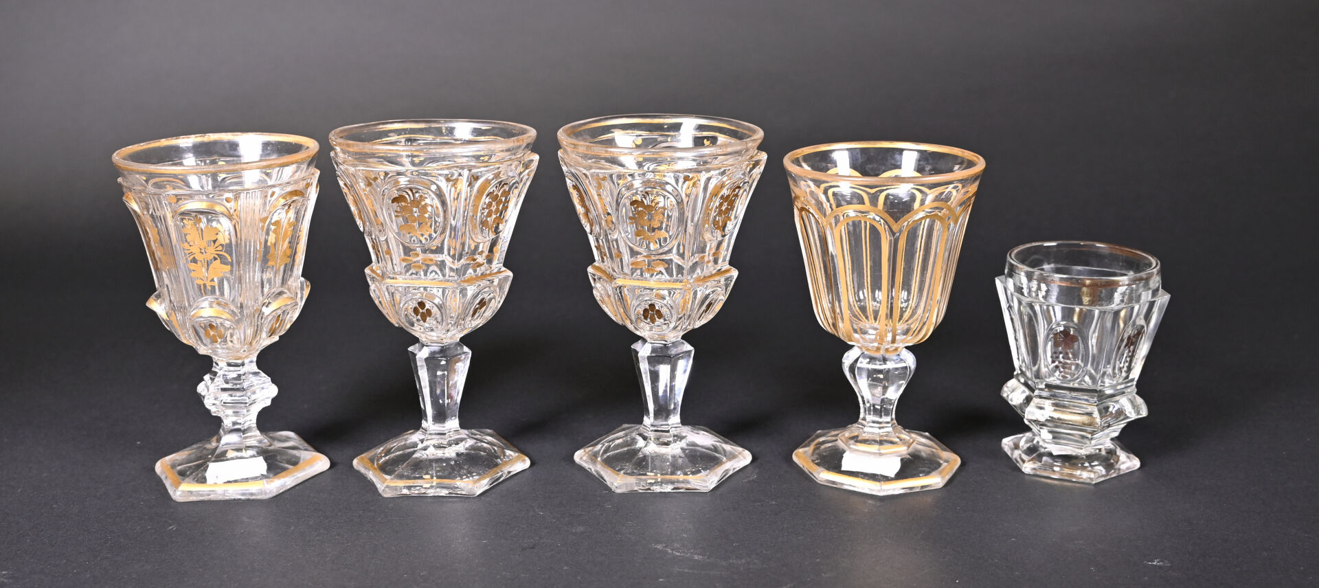 Suite de 4 verres dépareillés en cristal à décor en dorure (usures). On joint un petit d’un modèle approchant. XIXe siècle. Haut. des plus grands : 16 cm.