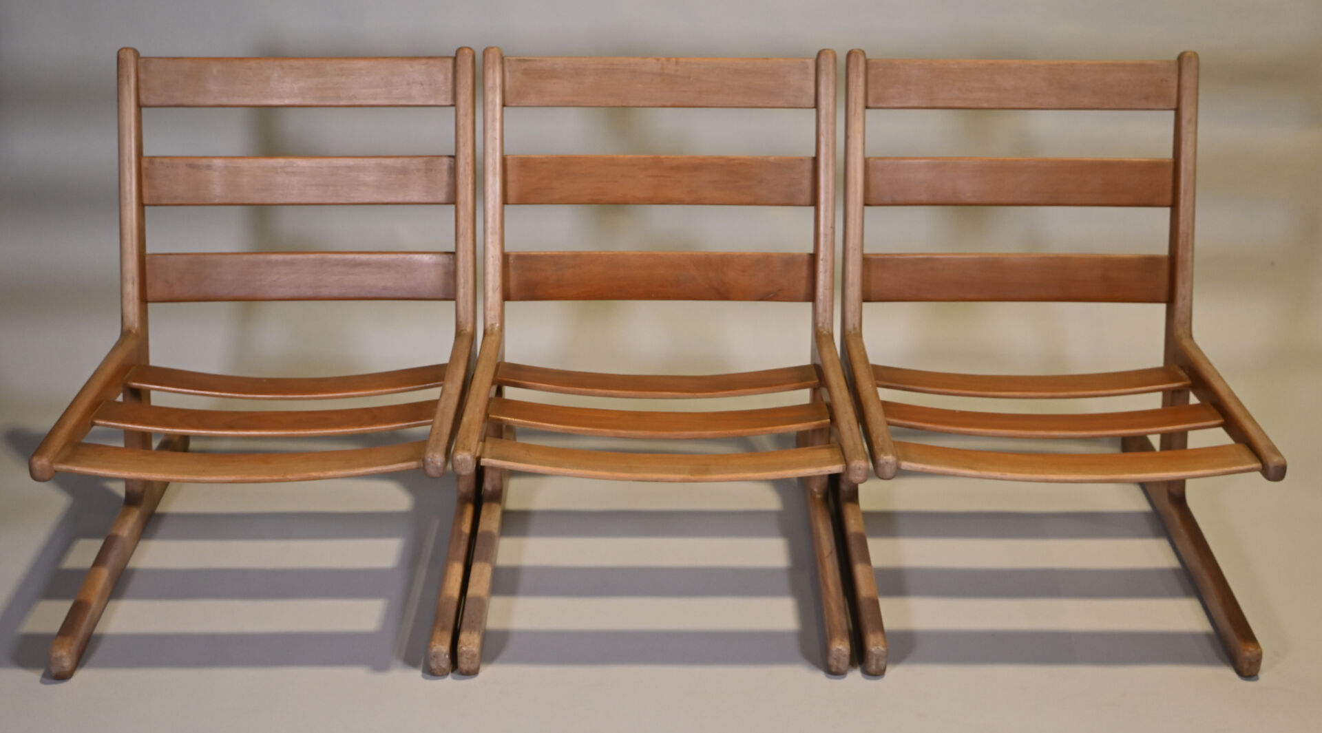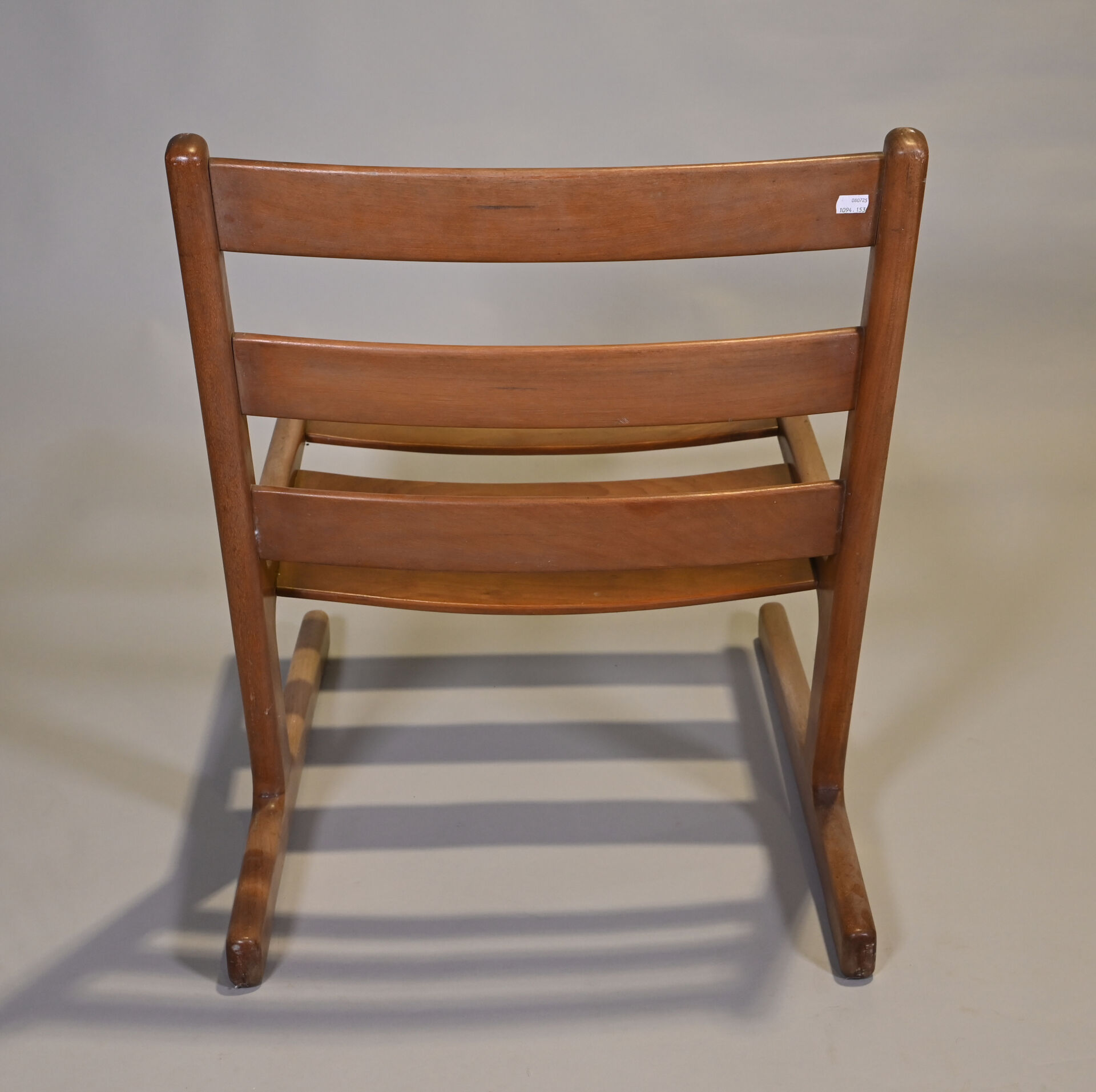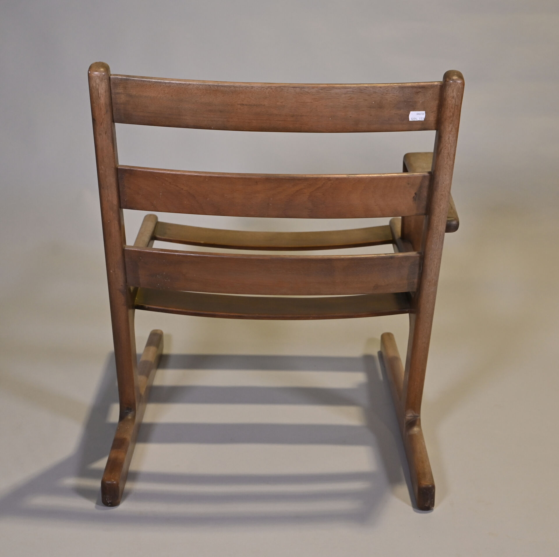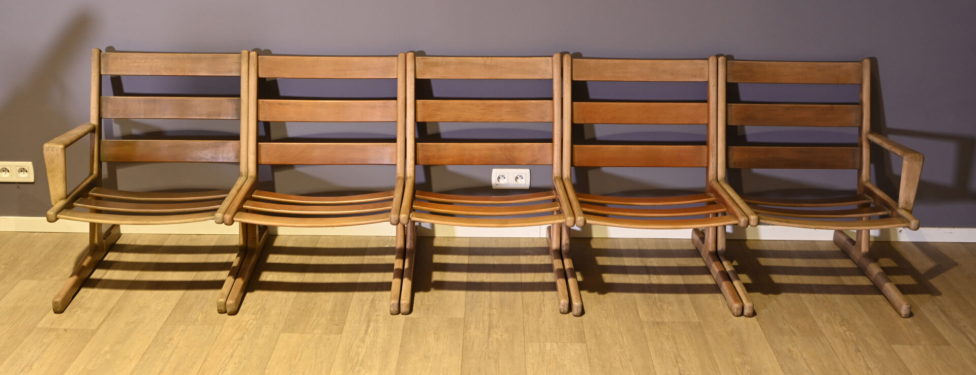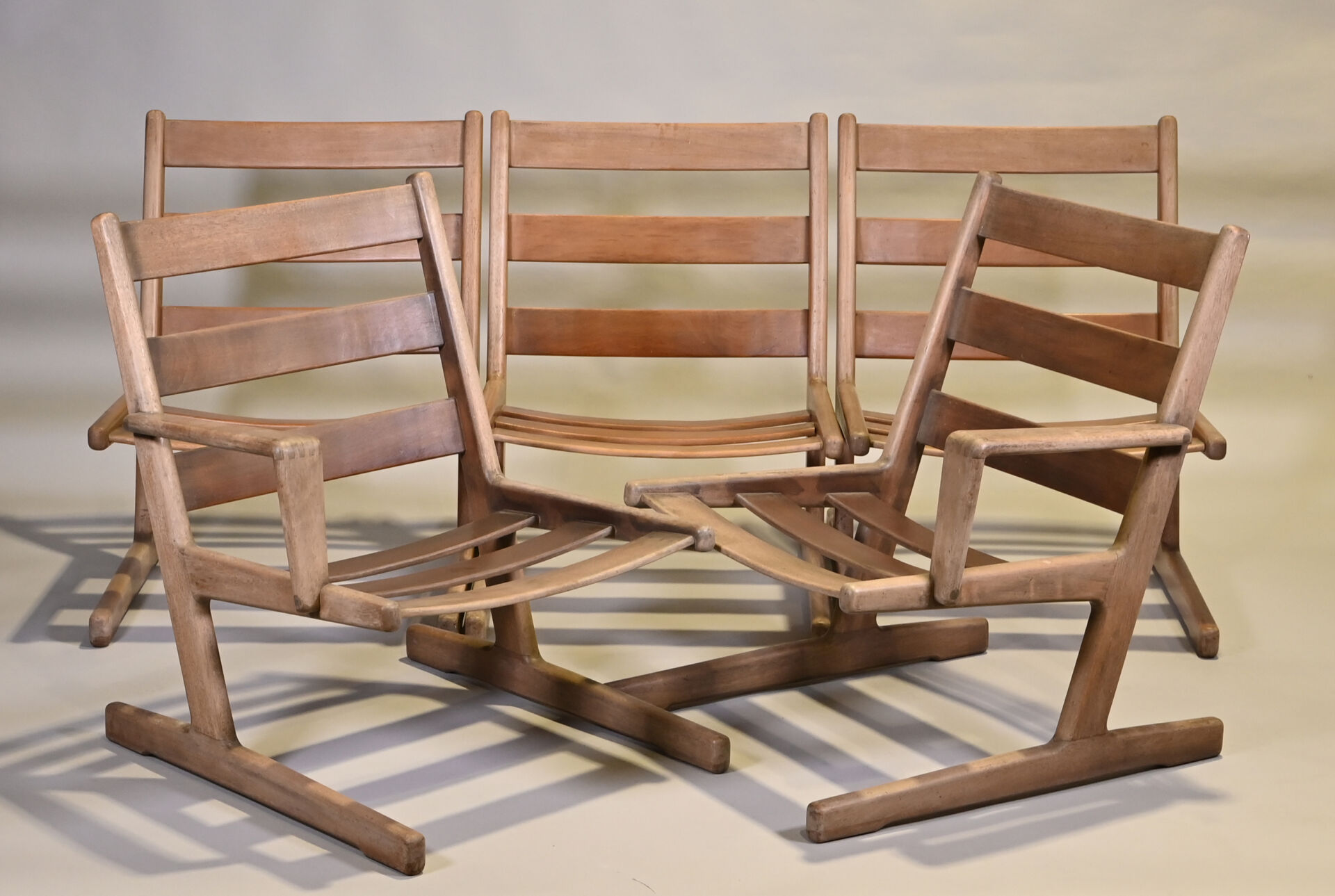 Suite de 5 fauteuils en bois exotique, le dossier et l’assise à bandeaux (insolés). Le piétement en port à faux inversé. Travail probablement scandinave, vers 1960/1970. Haut. : 77 cm.