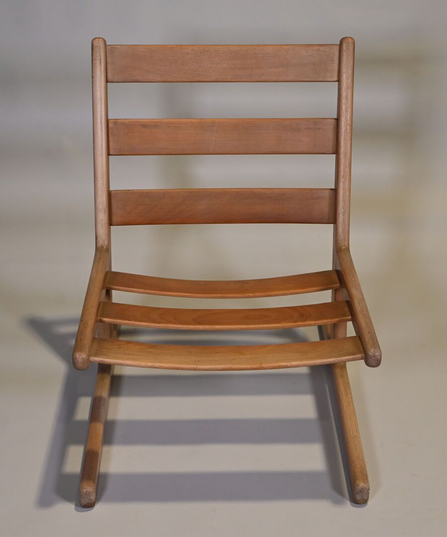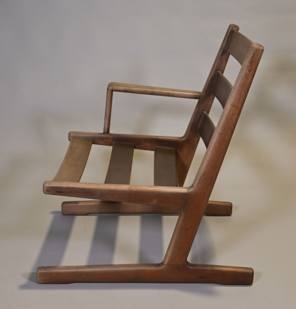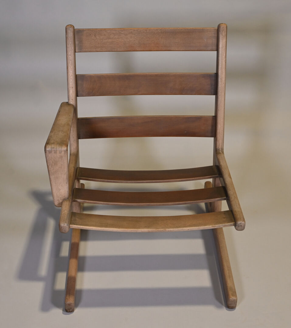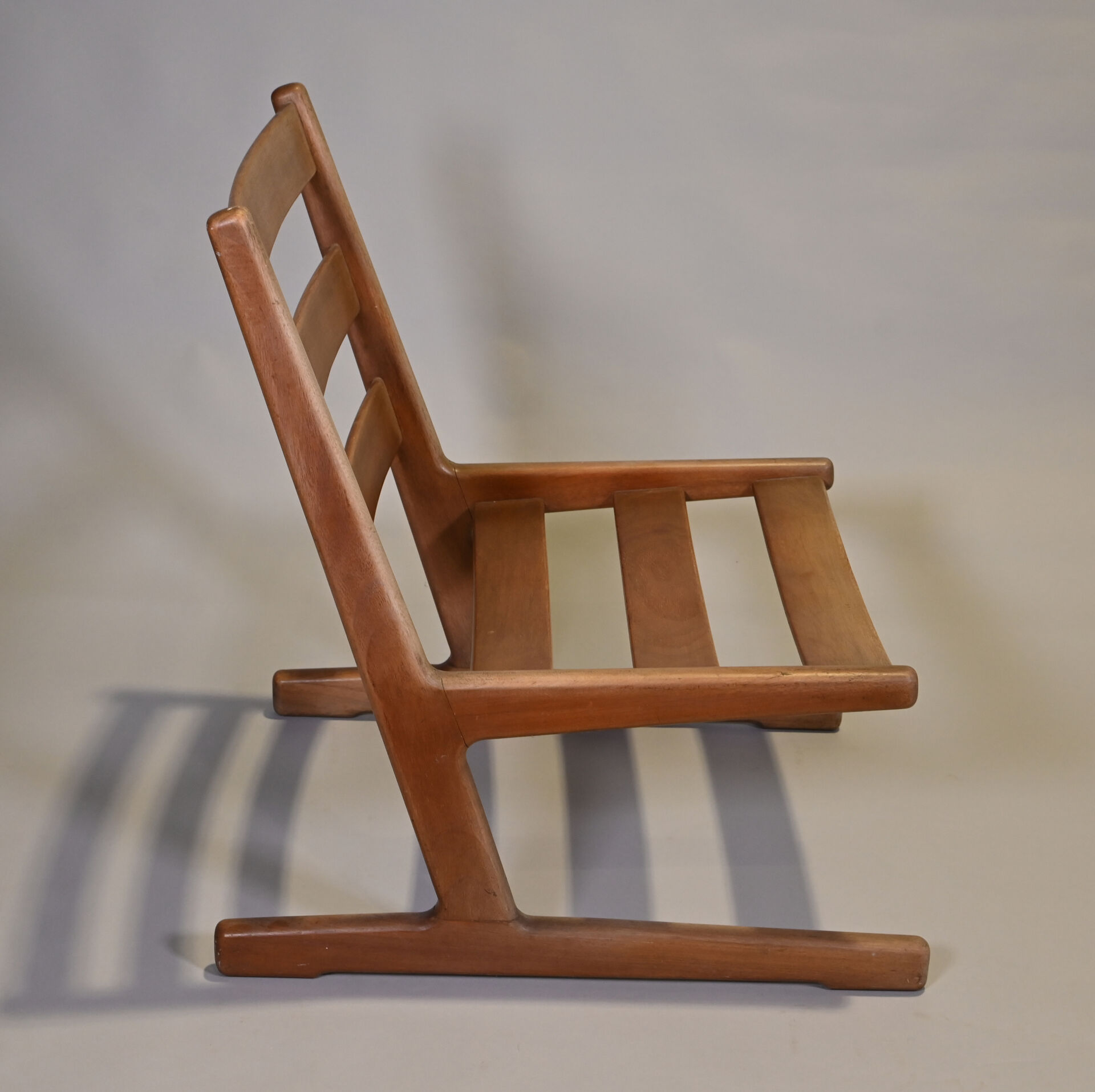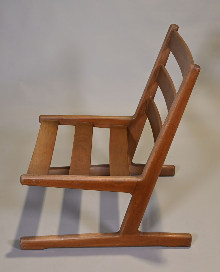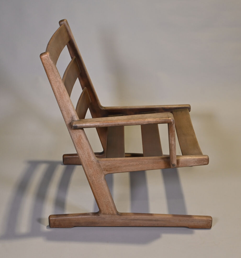 Suite de 5 fauteuils en bois exotique, le dossier et l’assise à bandeaux (insolés). Le piétement en port à faux inversé. Travail probablement scandinave, vers 1960/1970. Haut. : 77 cm.
