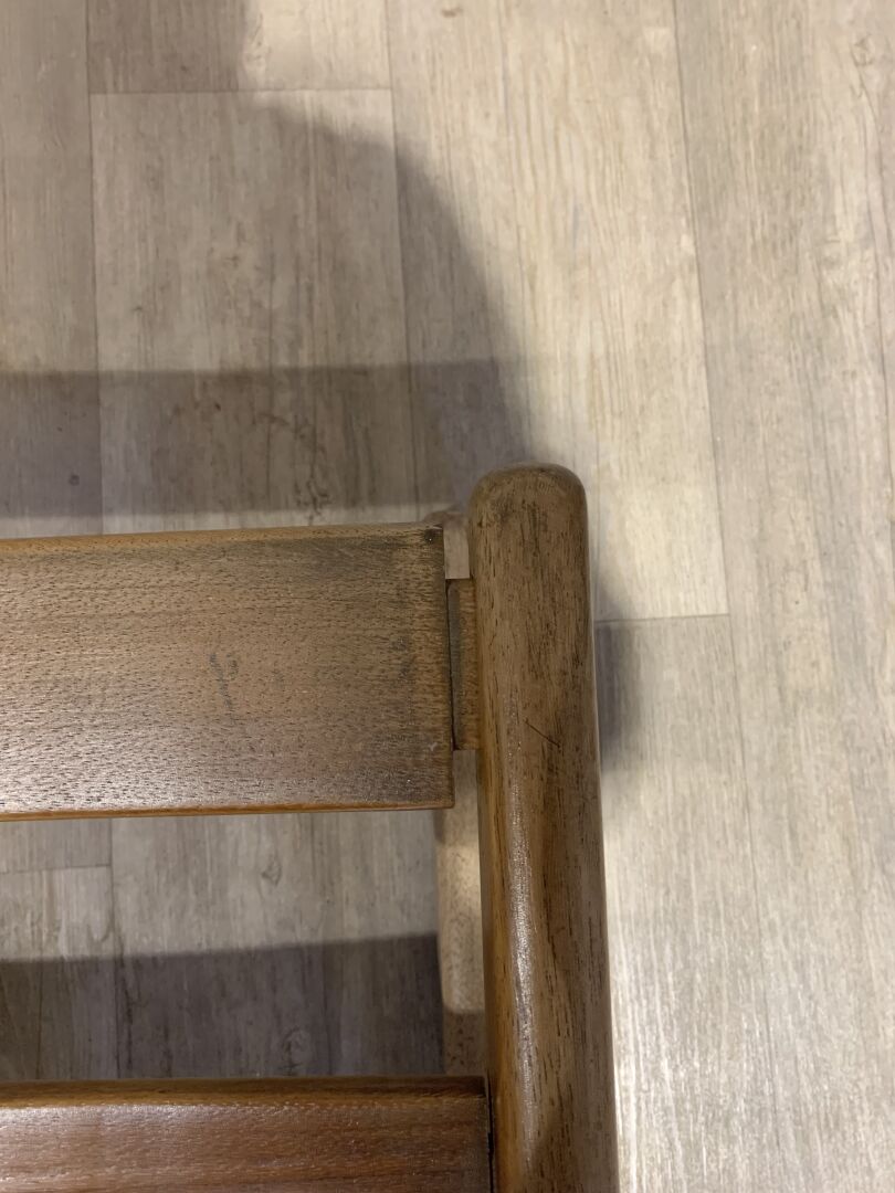 Suite de 5 fauteuils en bois exotique, le dossier et l’assise à bandeaux (insolés). Le piétement en port à faux inversé. Travail probablement scandinave, vers 1960/1970. Haut. : 77 cm.