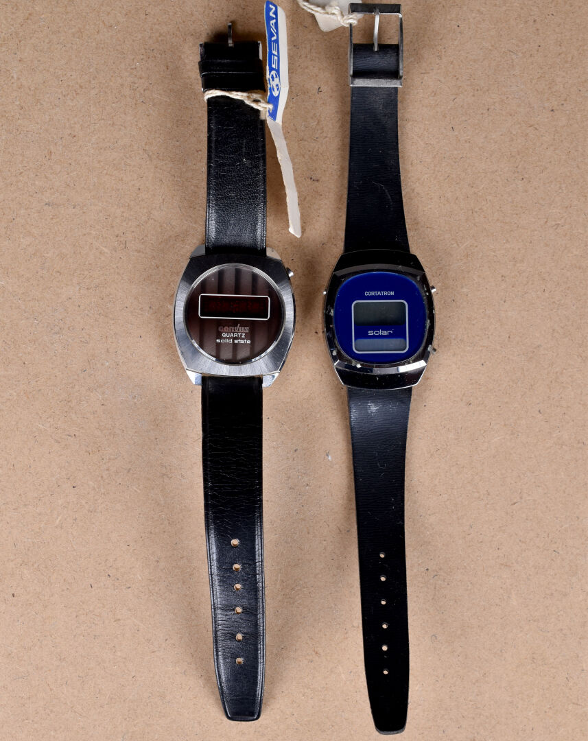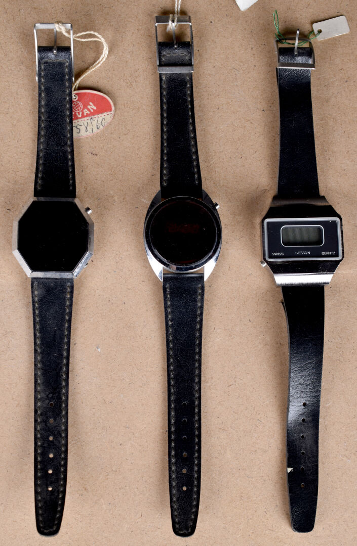 Suite de 5 montres bracelet à affichage digital de marque SEVAN, SOLAR, CONVUS (état d’usure).