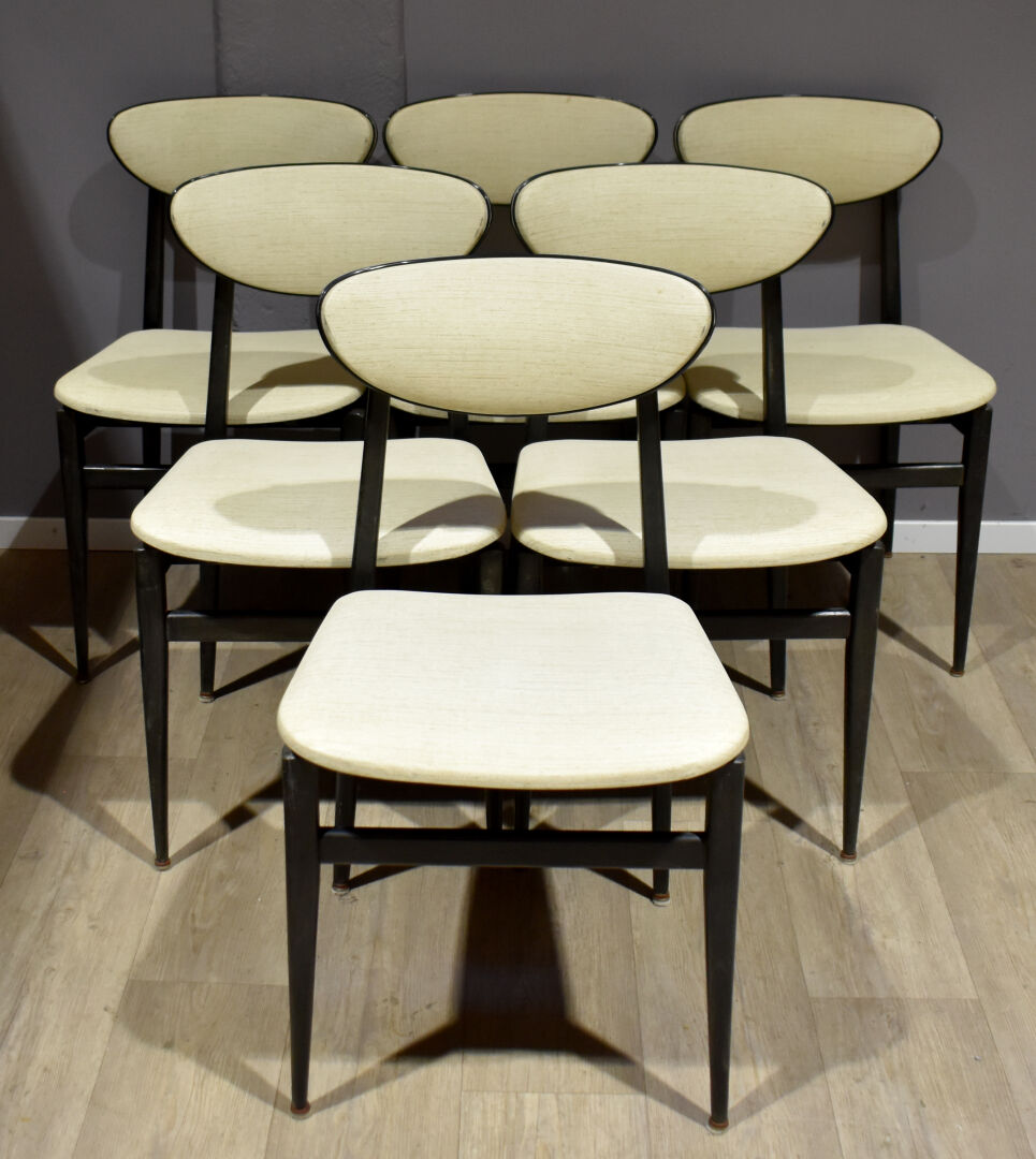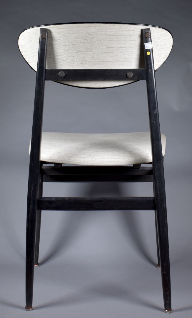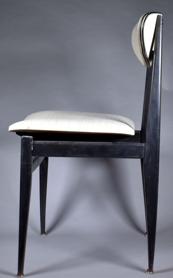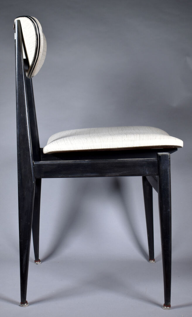 Suite de 6 chaises à garniture de skaï beige, piètement en bois laqué noir. Vers 1960. Etiquettes « ameublement NF – Siège 33 ». Haut. : 82 cm.