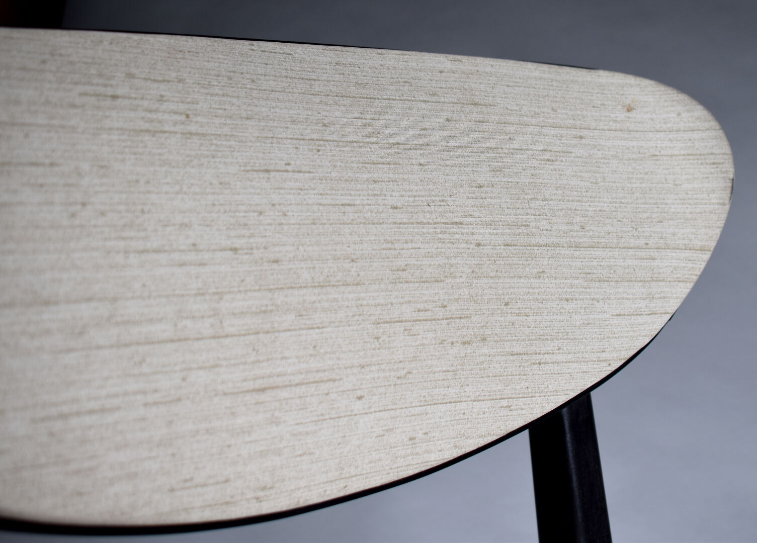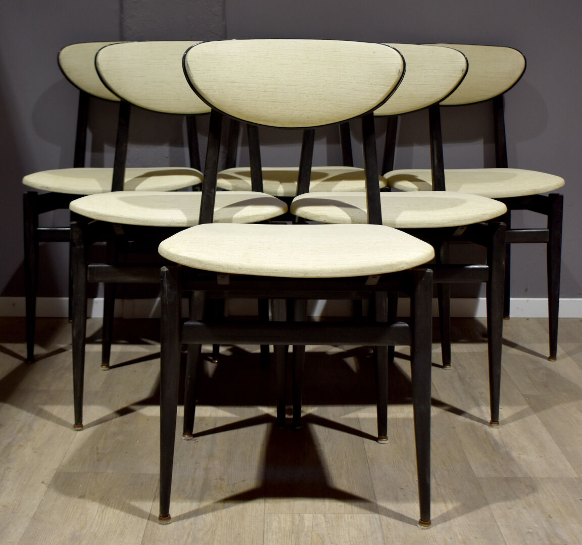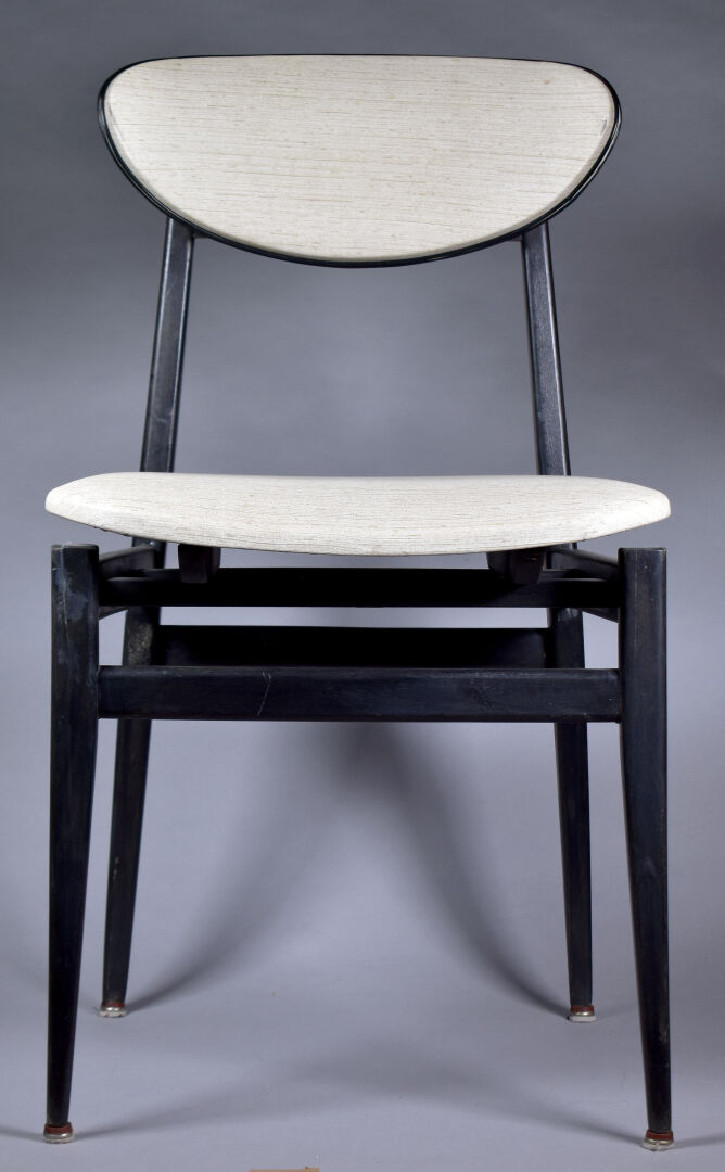 Suite de 6 chaises à garniture de skaï beige, piètement en bois laqué noir. Vers 1960. Etiquettes « ameublement NF – Siège 33 ». Haut. : 82 cm.