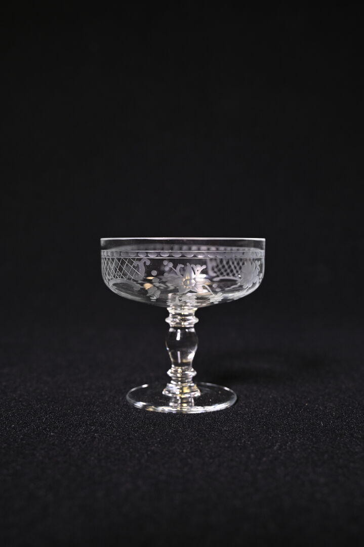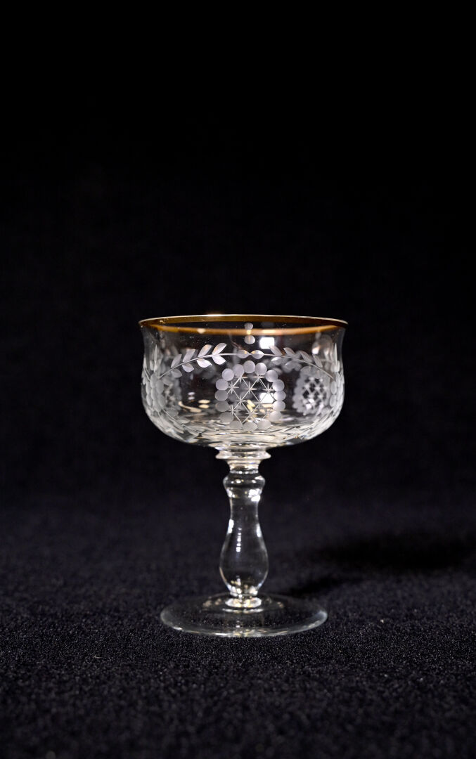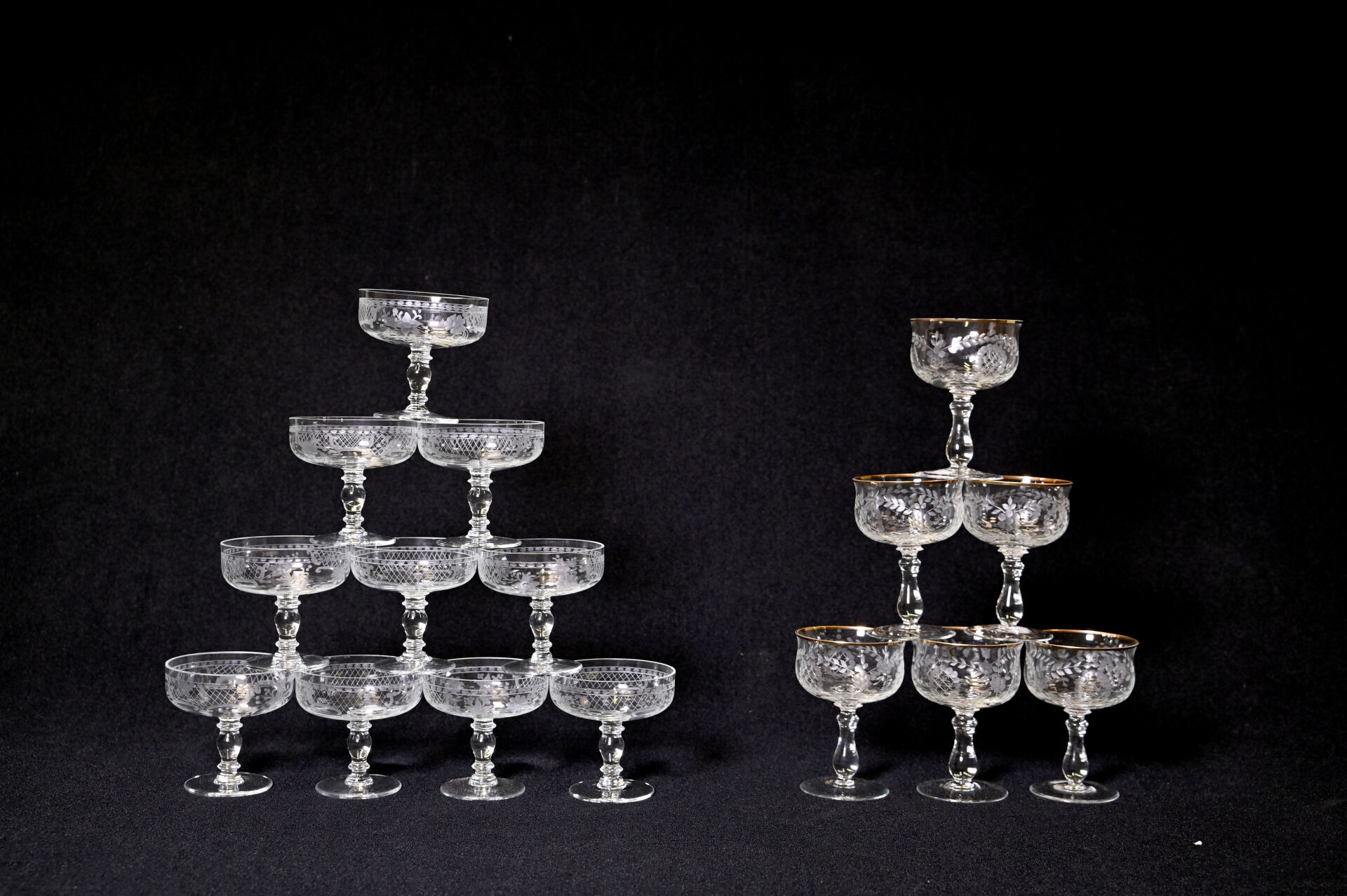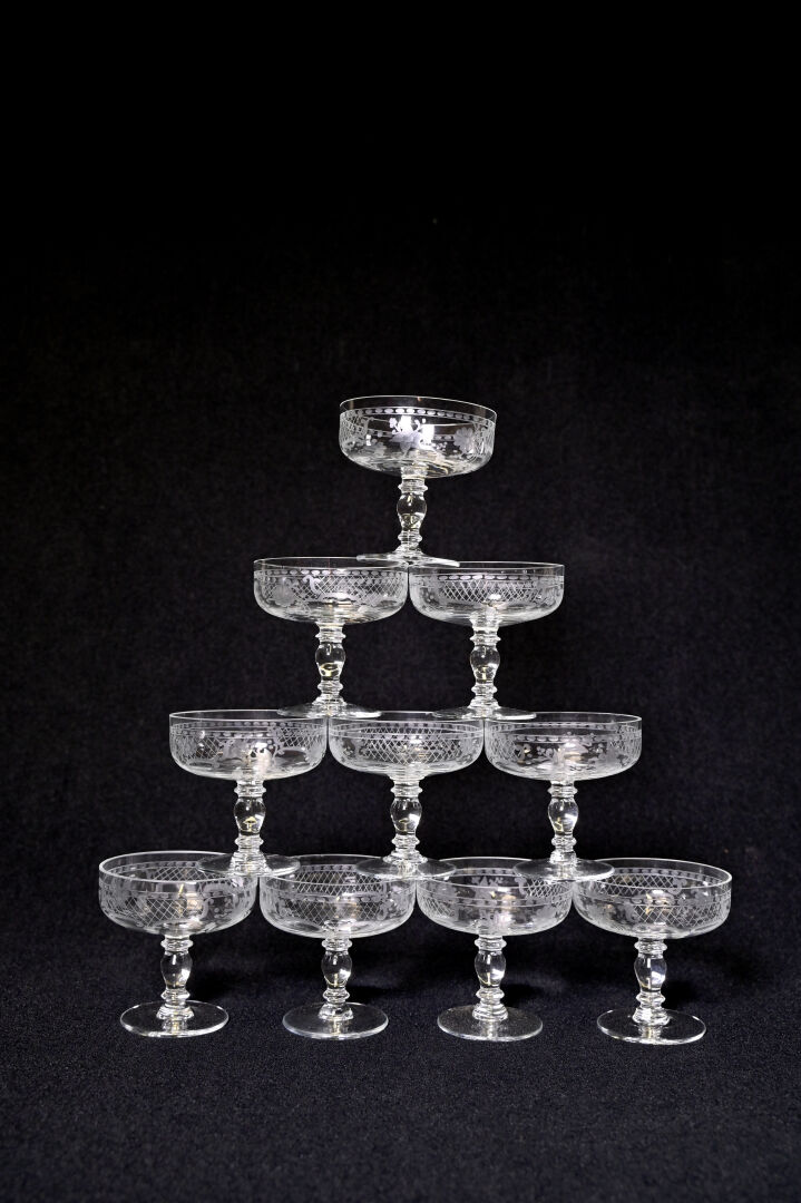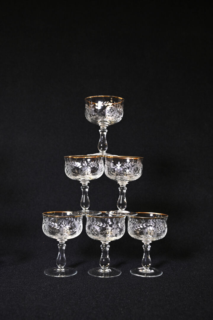 Suite de 6 coupes en verre gravé de feuillage et croisillons, la bordure dorée (un éclat). Haut. : 13,7 cm. On joint 10 autres d’un modèle approchant.
