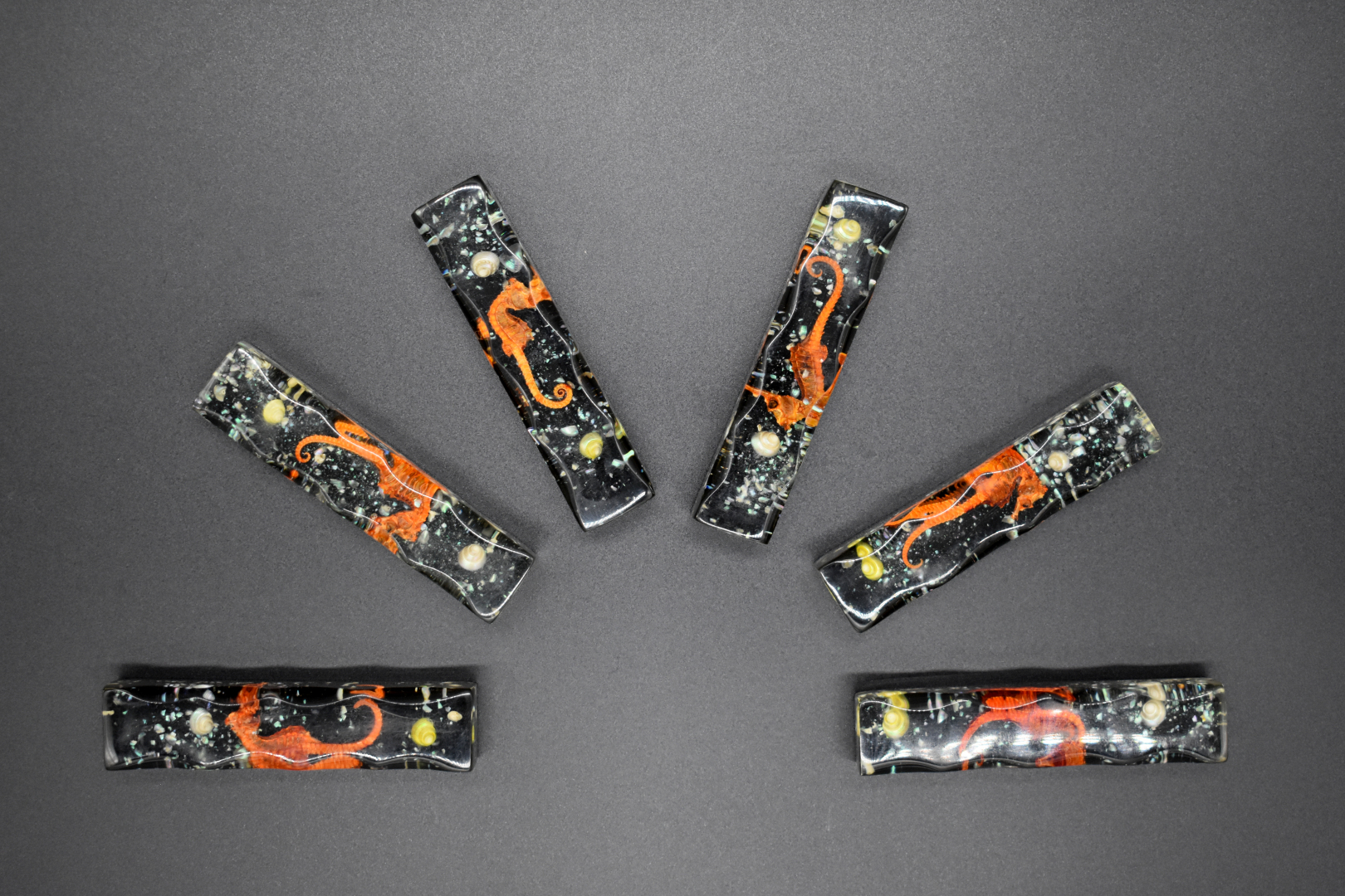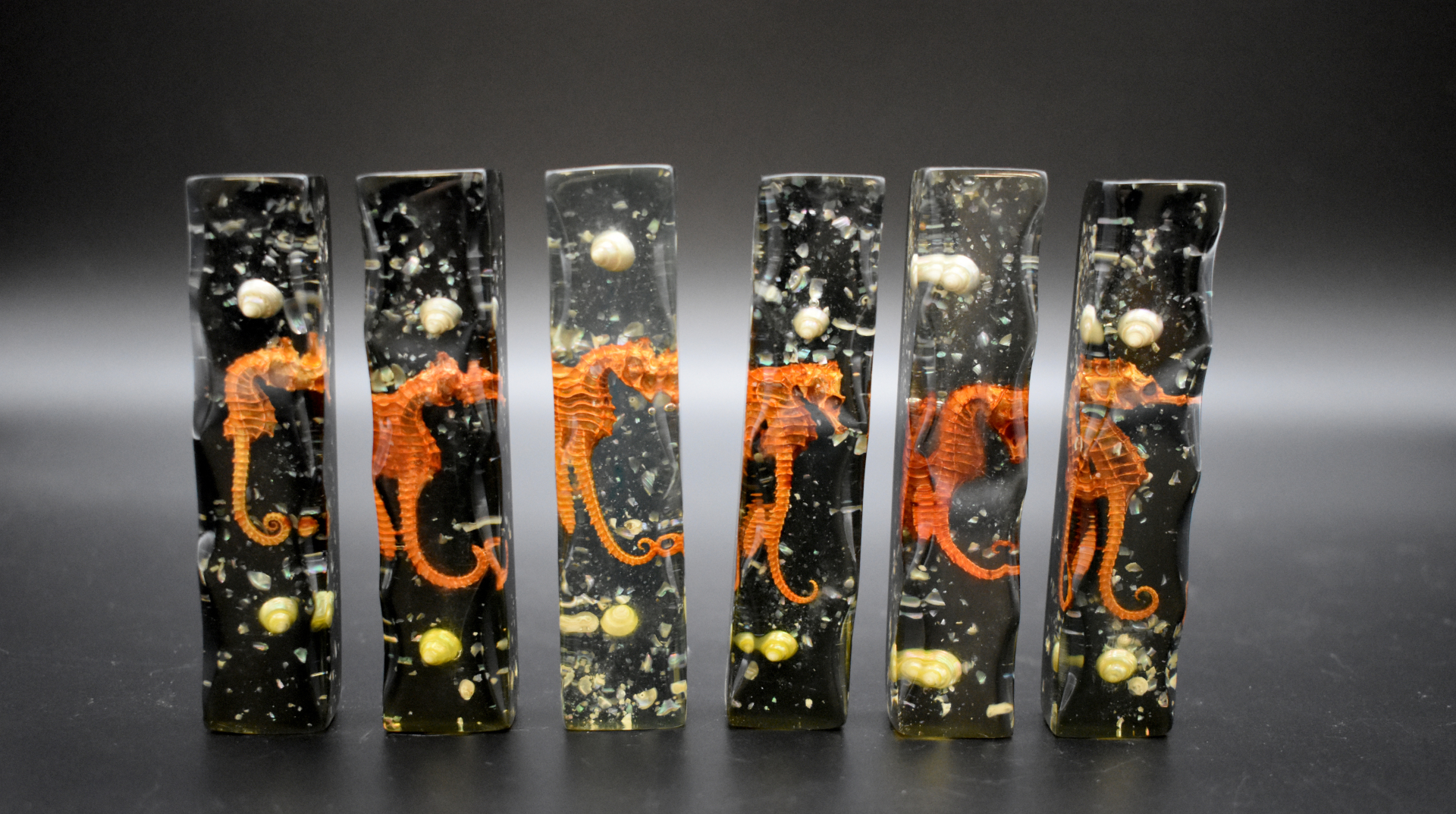 Suite de 6 porte-couteaux en résine à décor d’hypocampes et coquillages. Seconde moitié du XXe siècle.