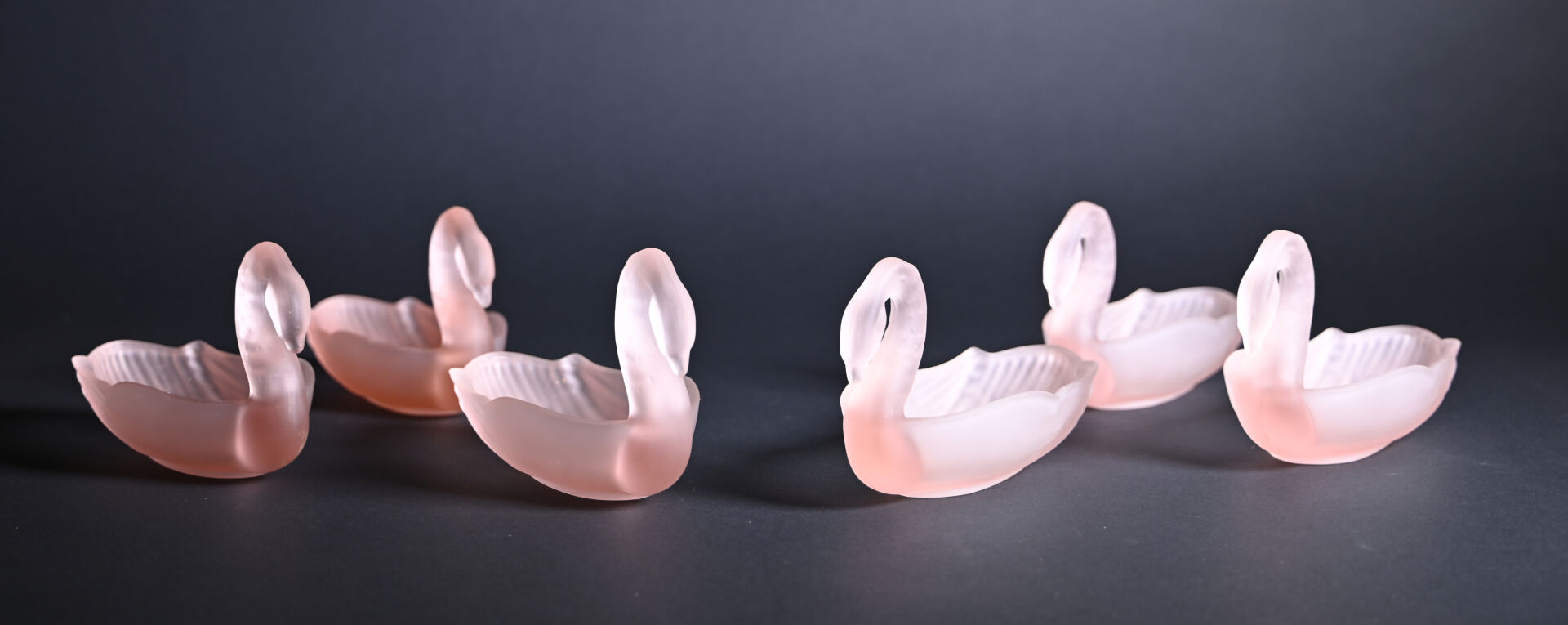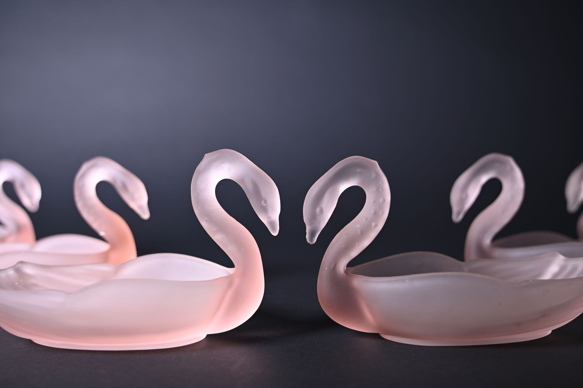 Suite de 6 raviers ? en forme de cygnes en verre rose dépoli. Début du XXe siècle.