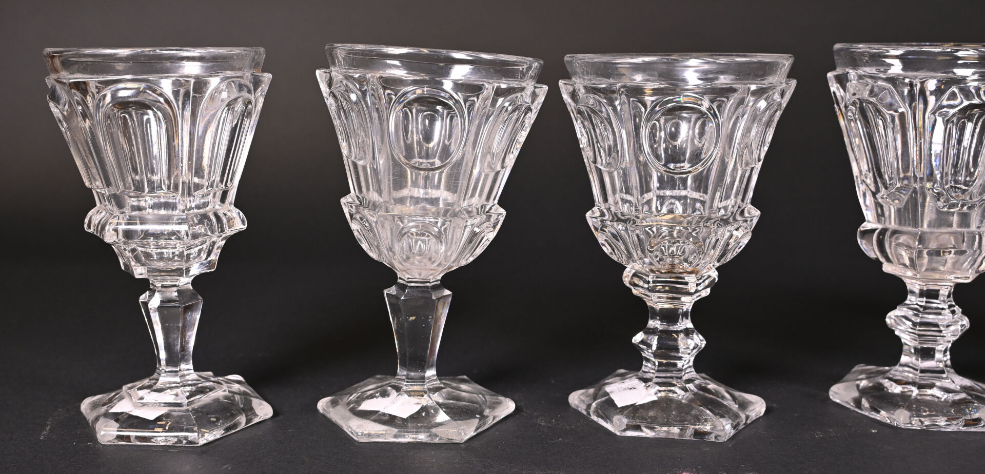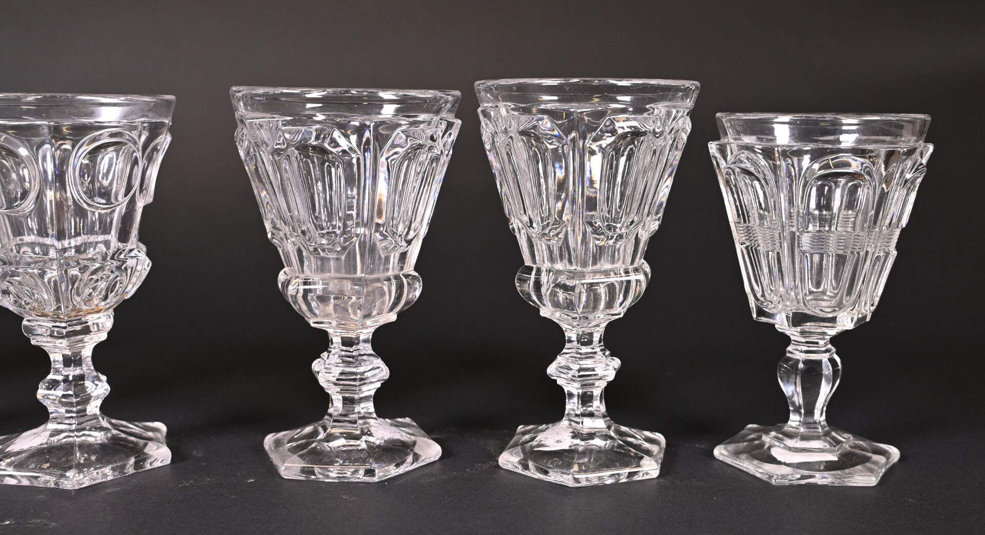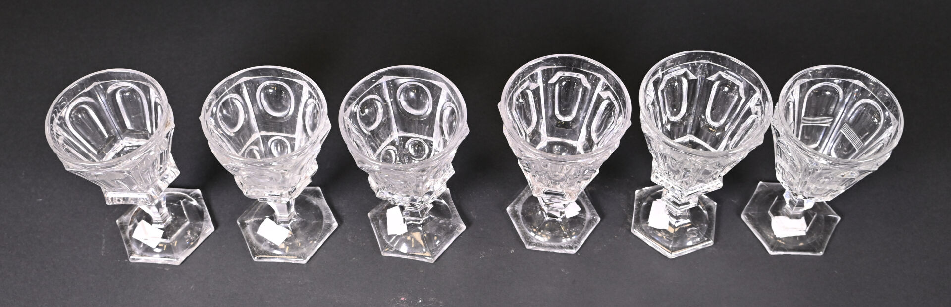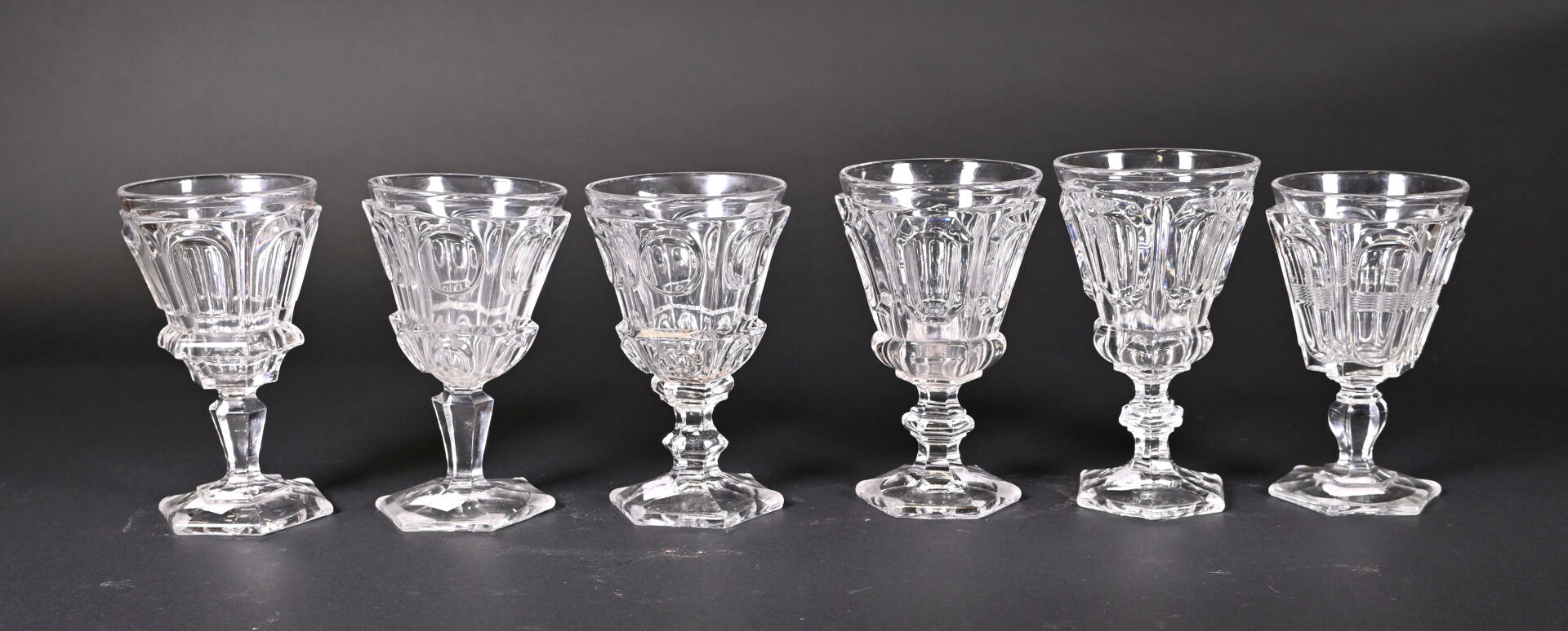 Suite de 6 verres à pied en cristal (petites égrenures sur un pied et un avec un choc en bordure). XIXe siècle. Haut. du plus grand. : 16,5 cm.