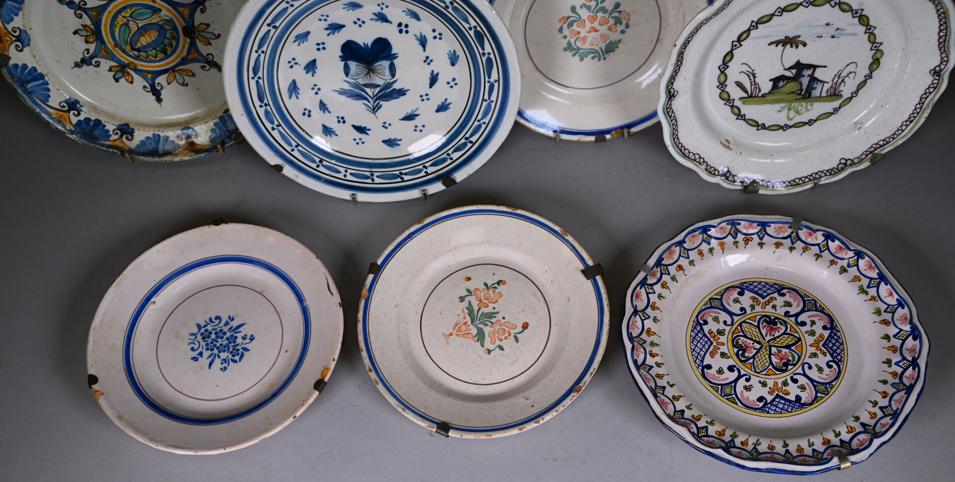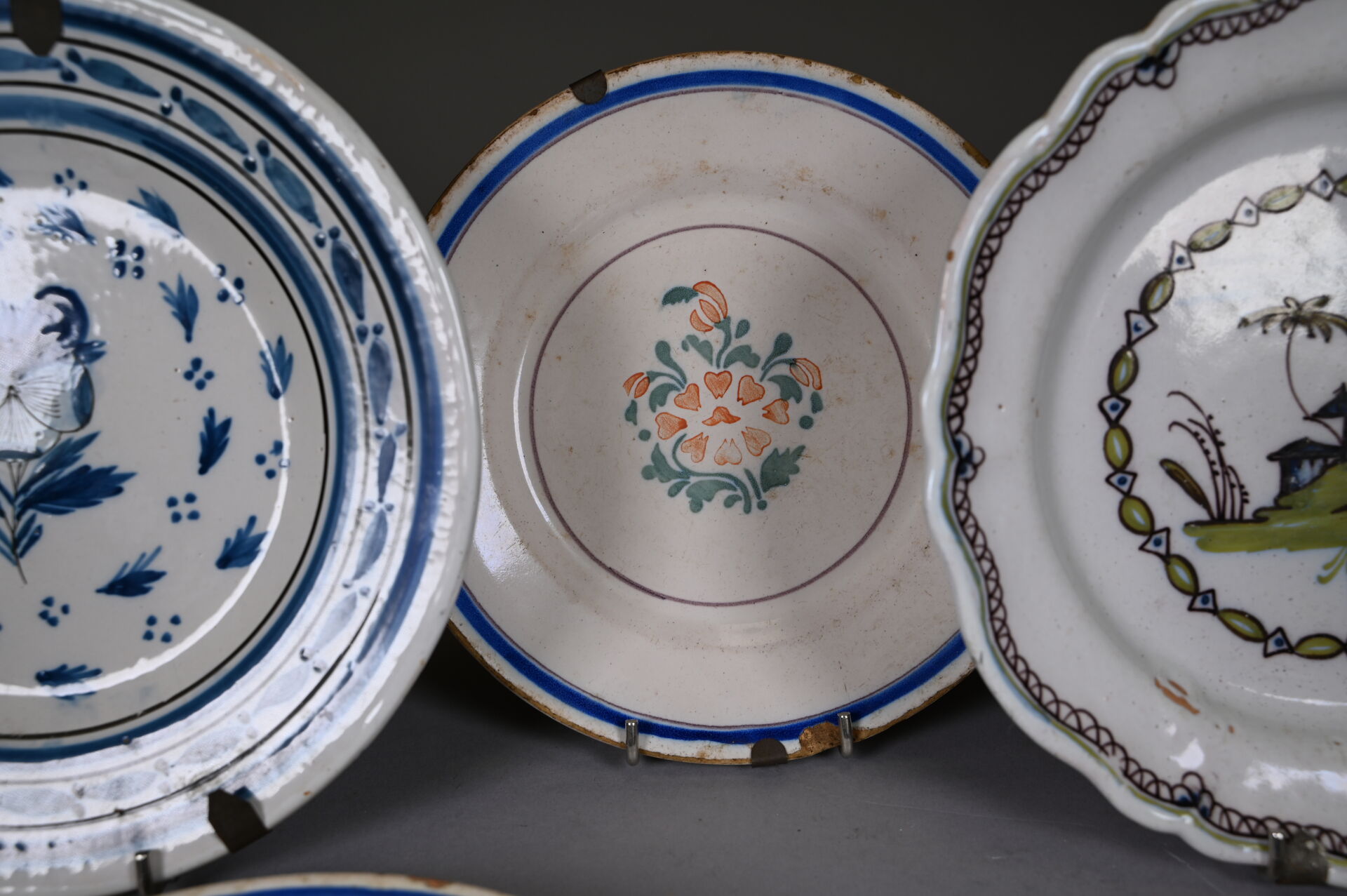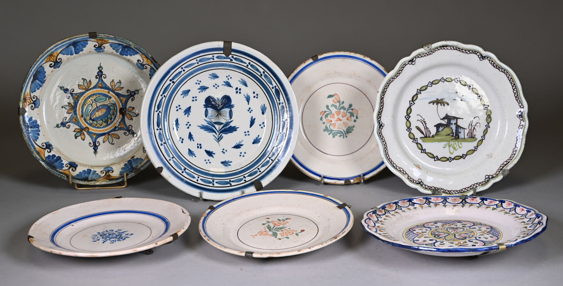 Suite de 7 assiettes en faïence, principalement de grand feu (usures, éclats). XVIIIe et XIXe siècle. Diam. moyen : 23 cm.