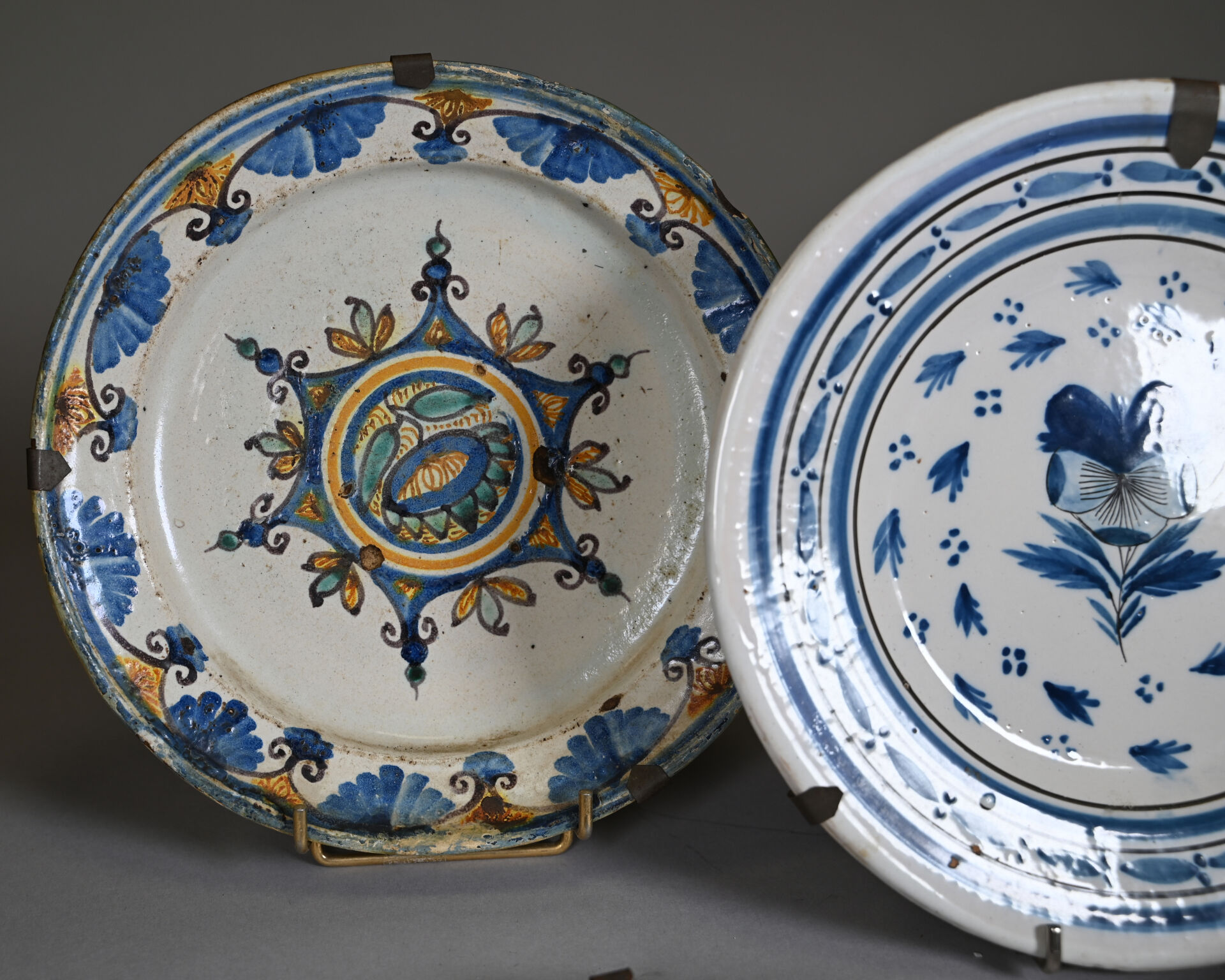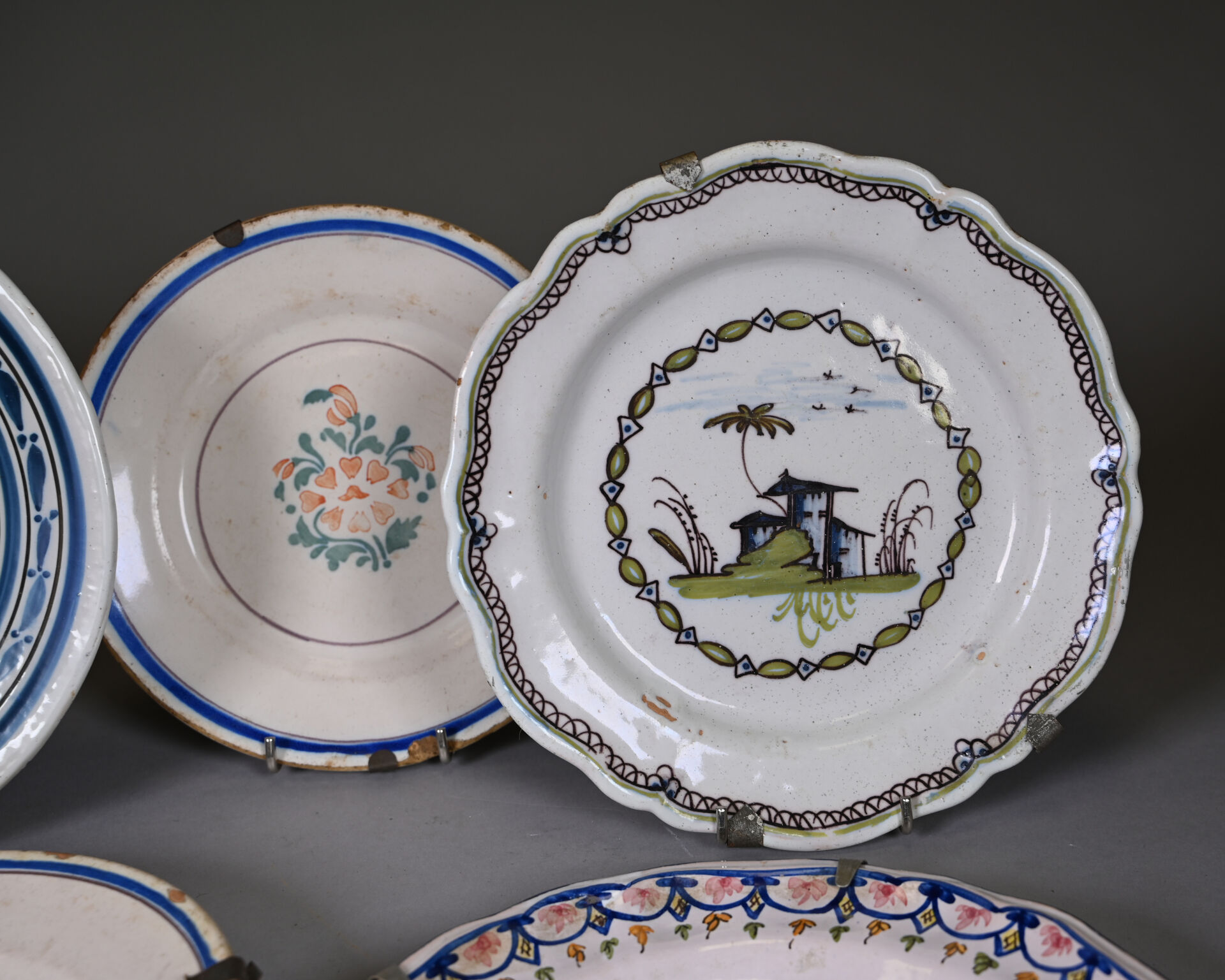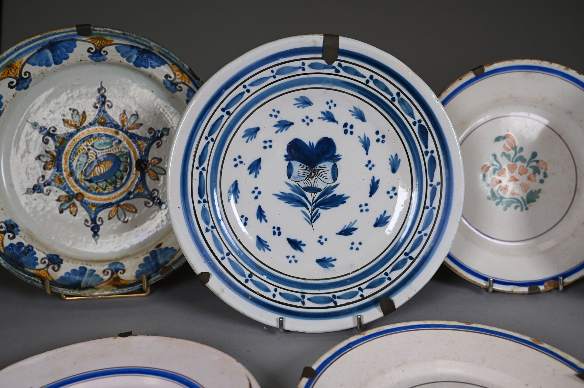 Suite de 7 assiettes en faïence, principalement de grand feu (usures, éclats). XVIIIe et XIXe siècle. Diam. moyen : 23 cm.