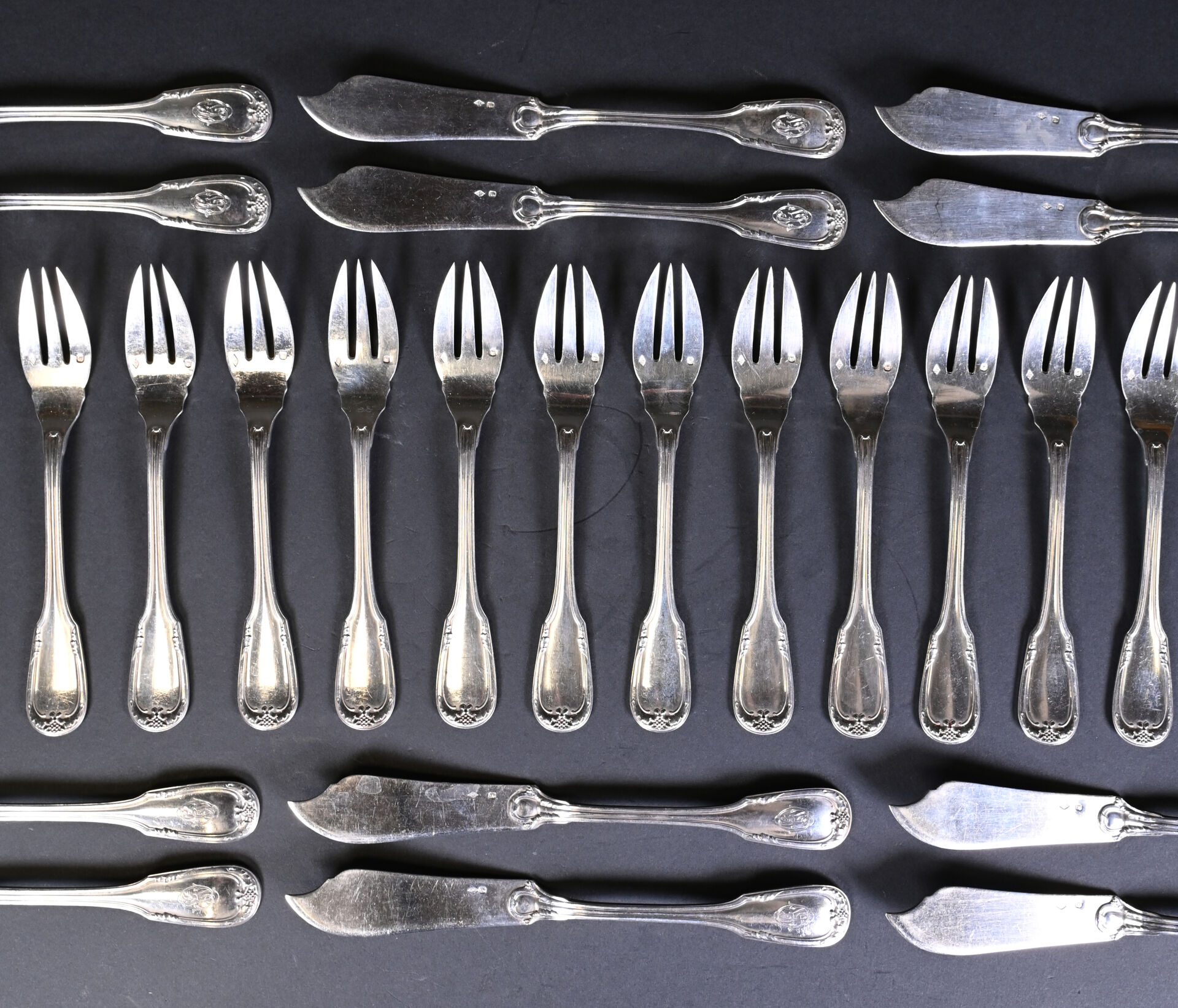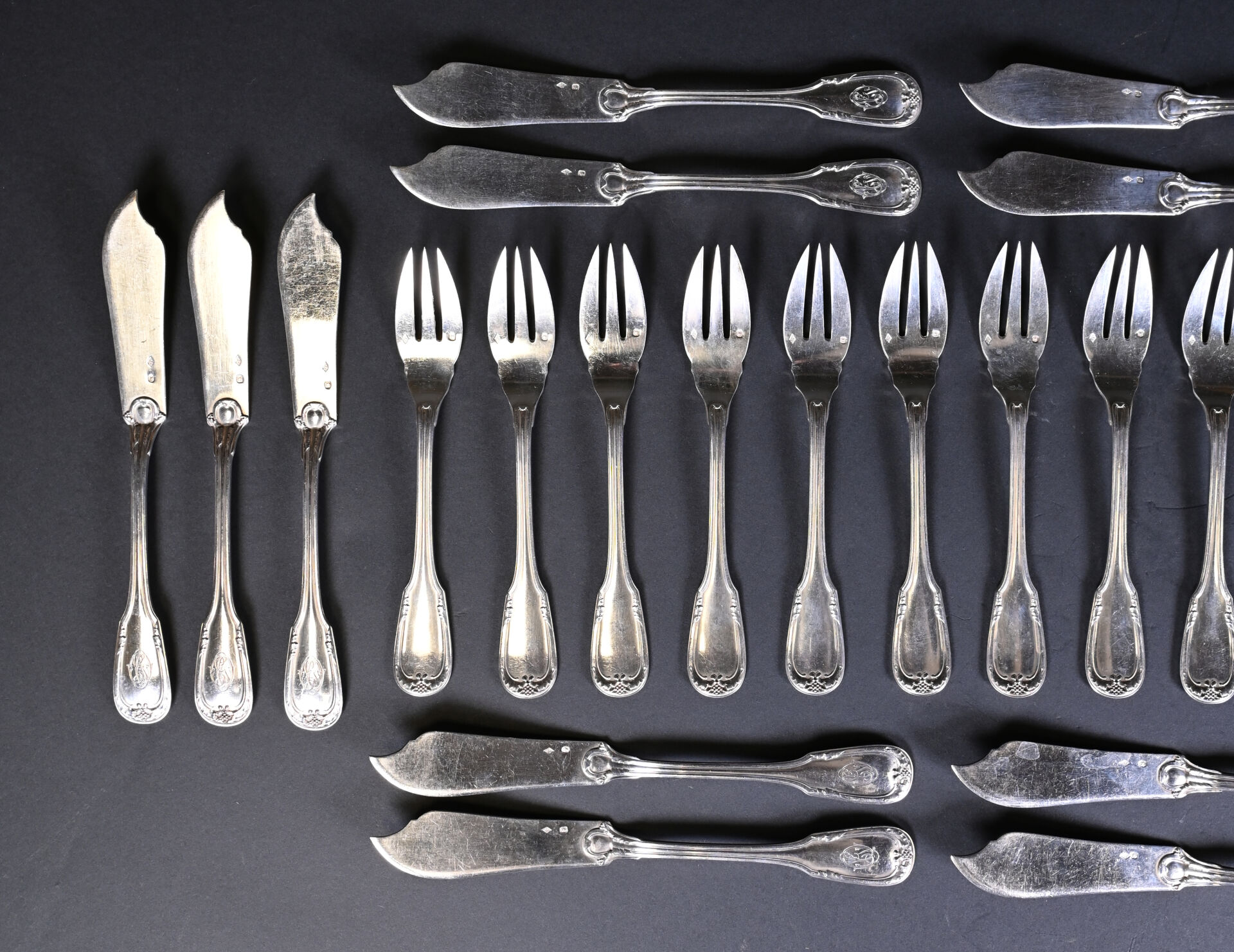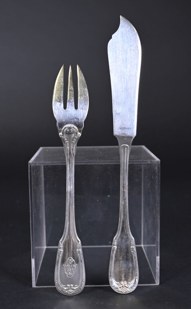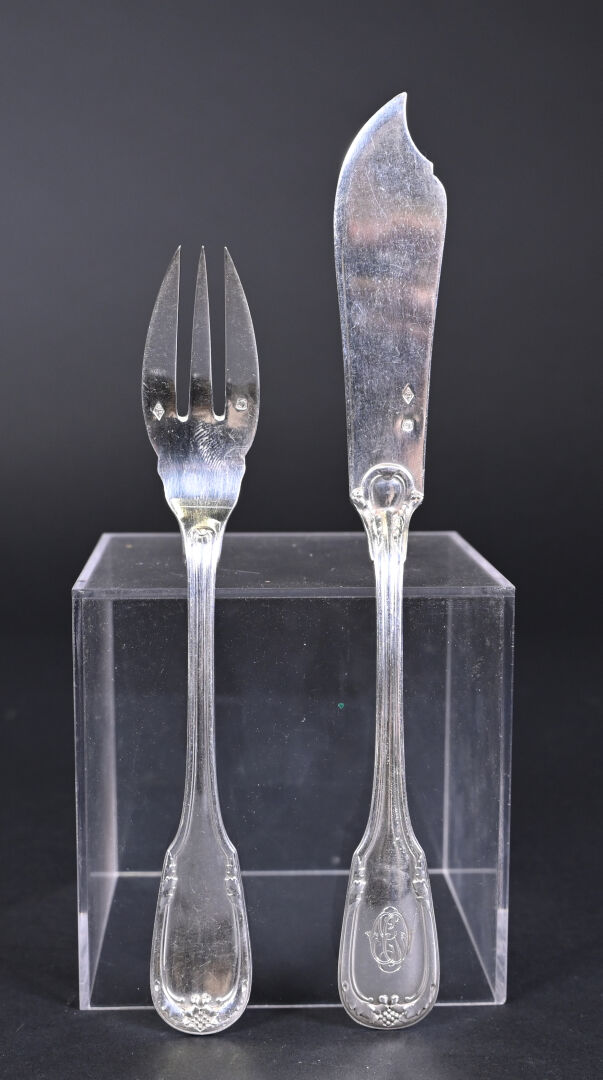 Suite de dix-huit couverts à poisson en argent 925/1000e, la spatule à acanthes et grappe de raisin, chiffrée. Poids total. : 2 269 g.