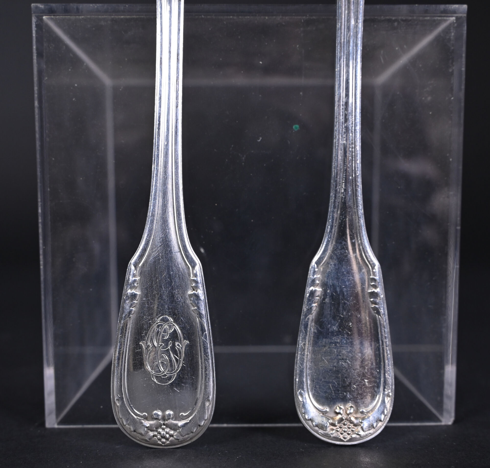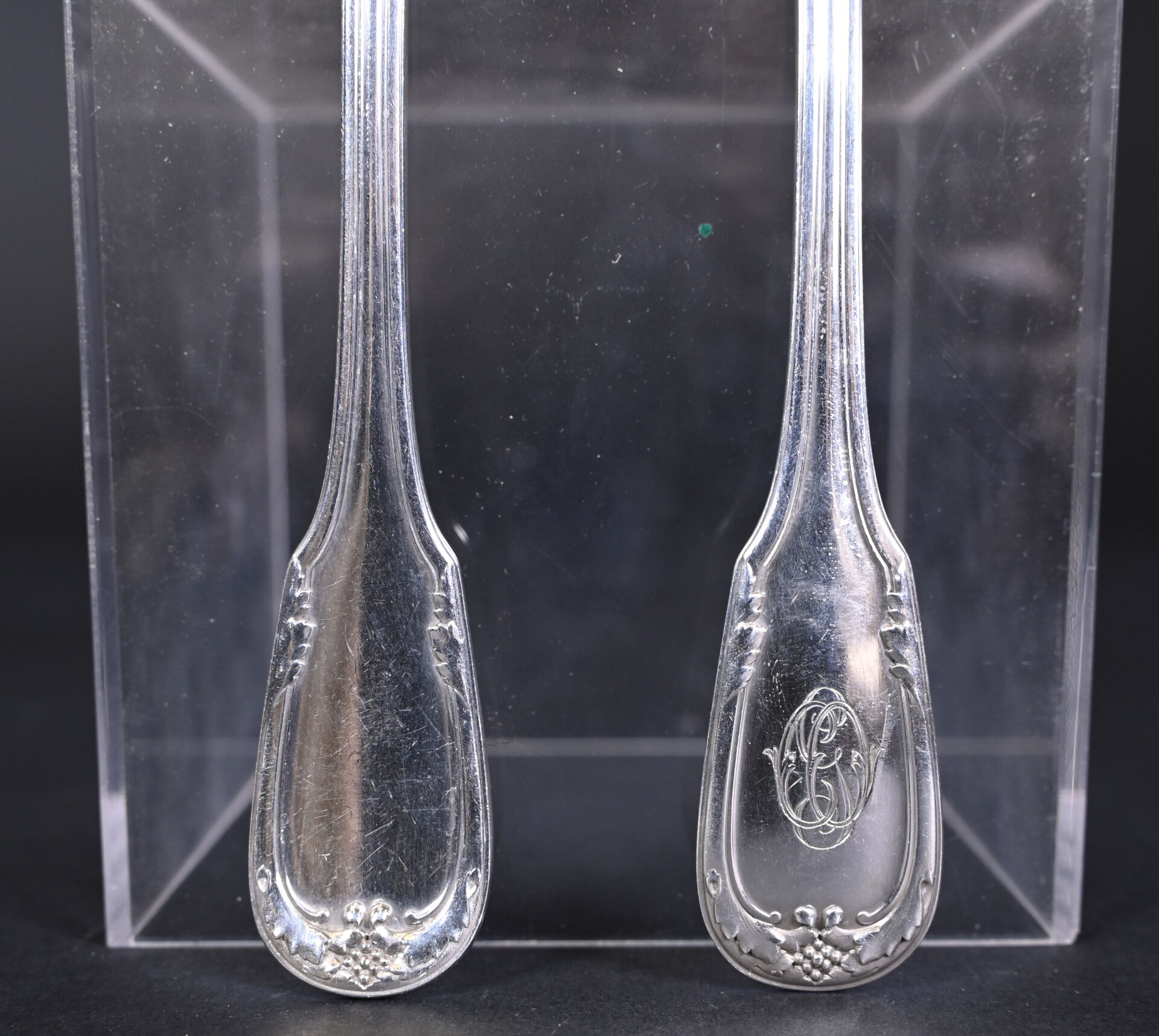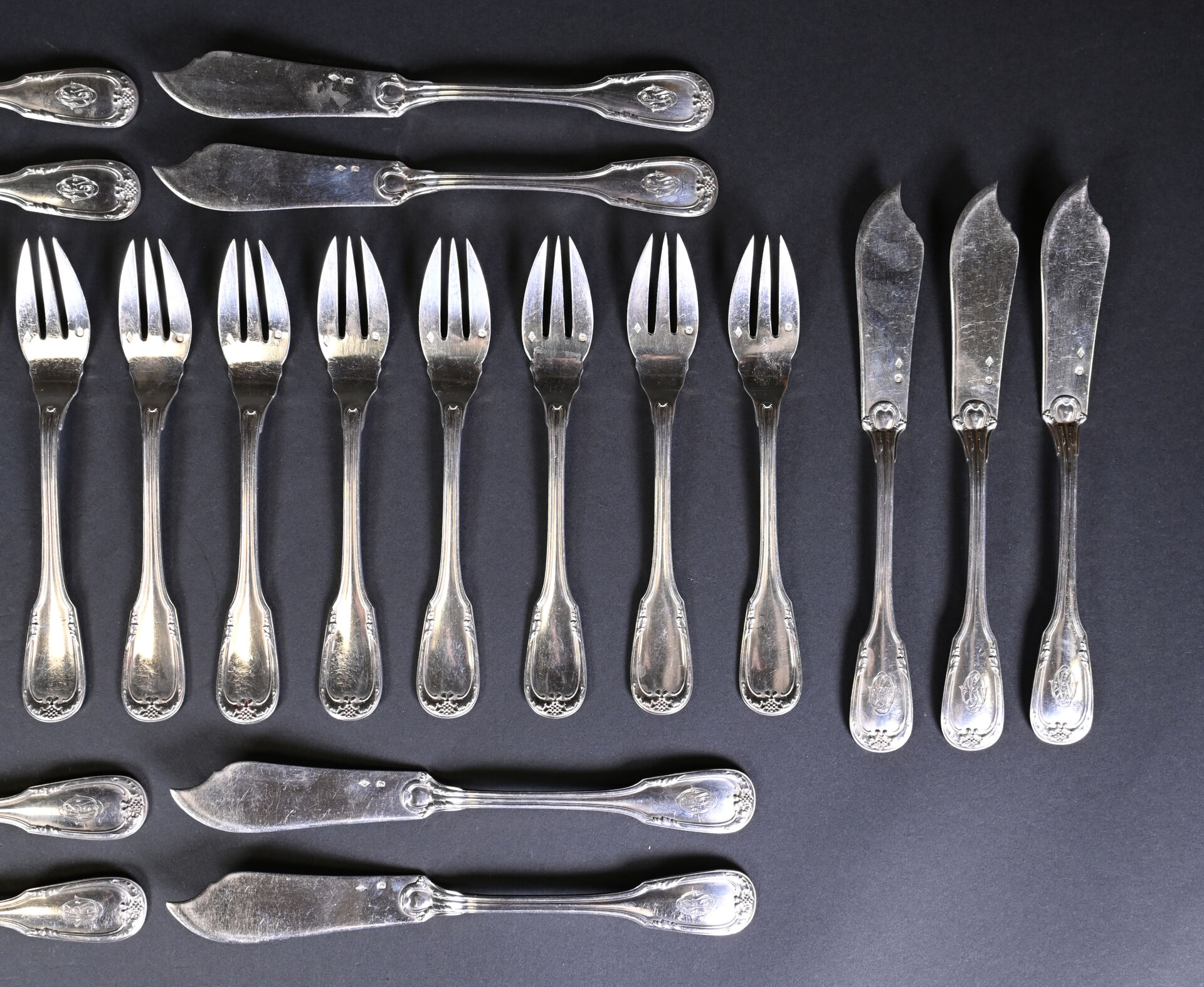 Suite de dix-huit couverts à poisson en argent 925/1000e, la spatule à acanthes et grappe de raisin, chiffrée. Poids total. : 2 269 g.