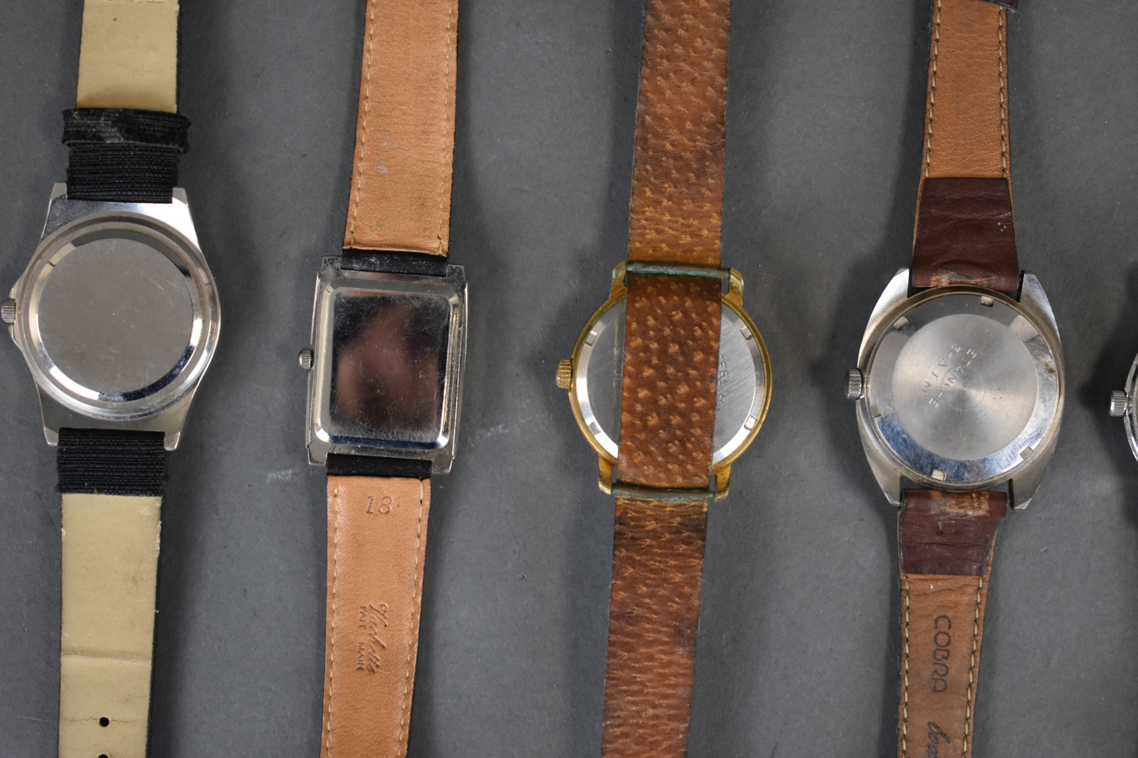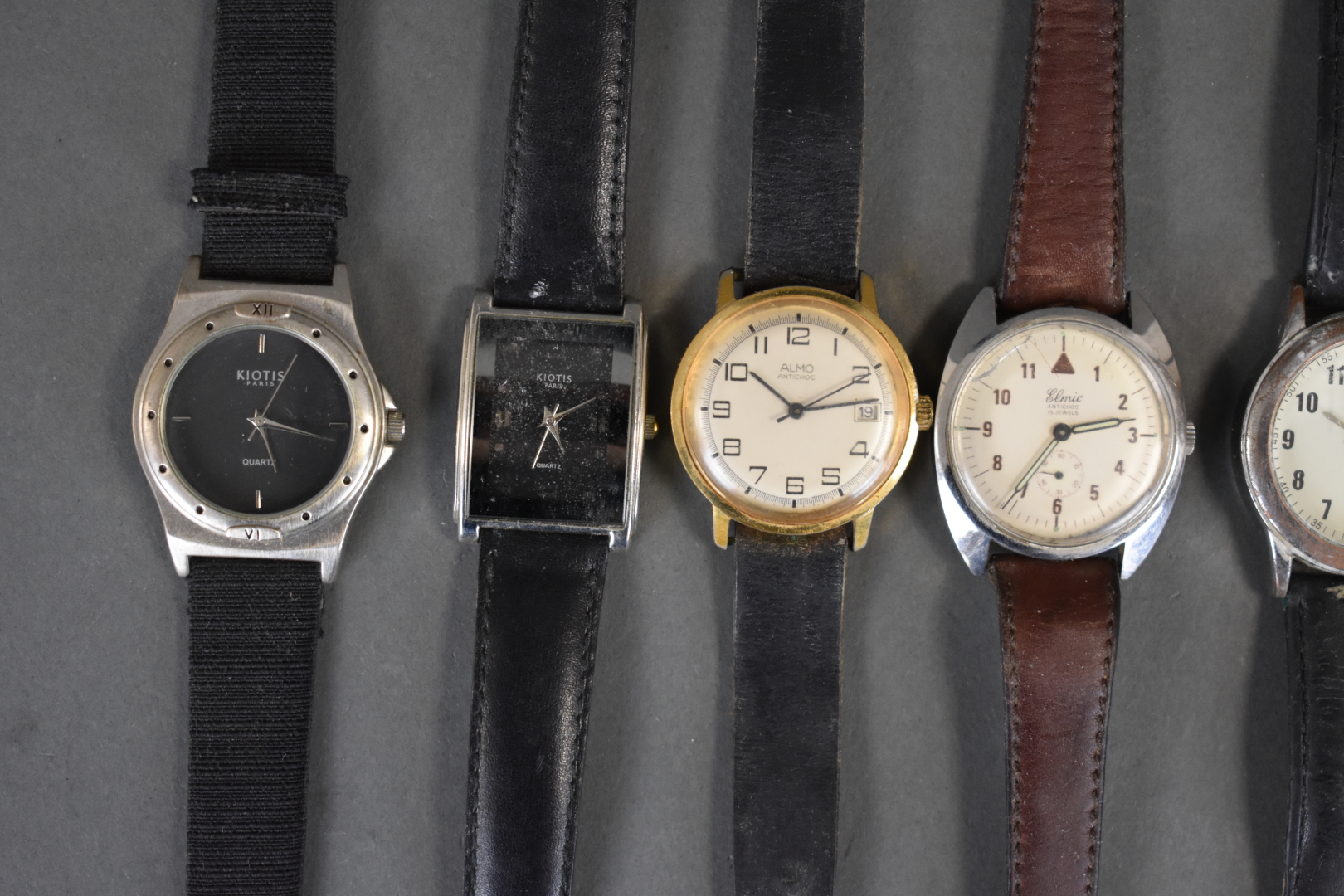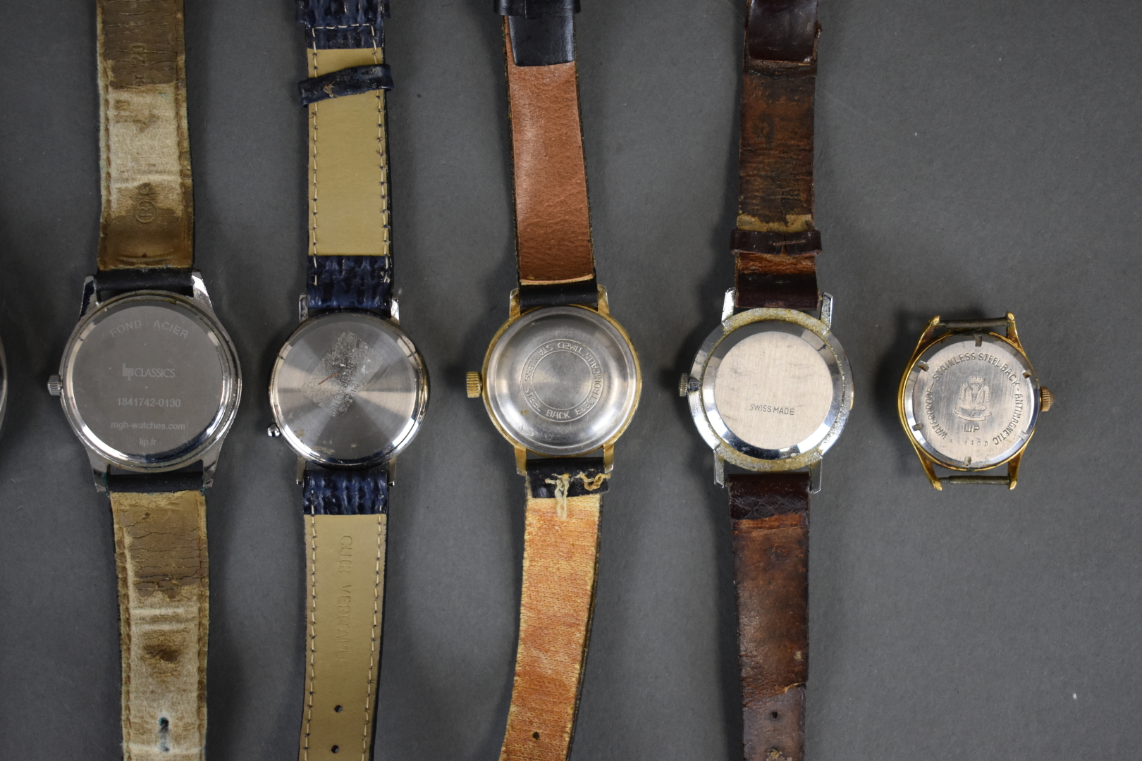 Suite de neuf montres bracelet d’homme (une sans bracelet) dont LIP, STEFF, KIOTIS (usures, rayures). Vers 1970/1980.