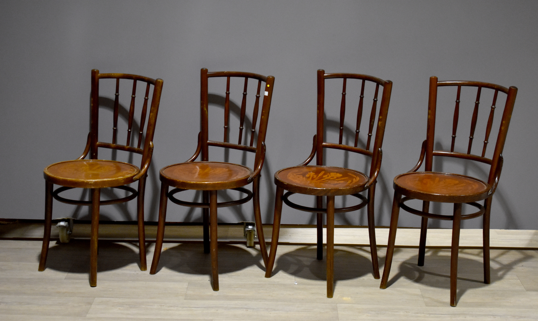 Suite de quatre chaises en hêtre courbé, l’assise à décor de fleurs. Dans le goût de Khon. Vers 1900 (usures).
