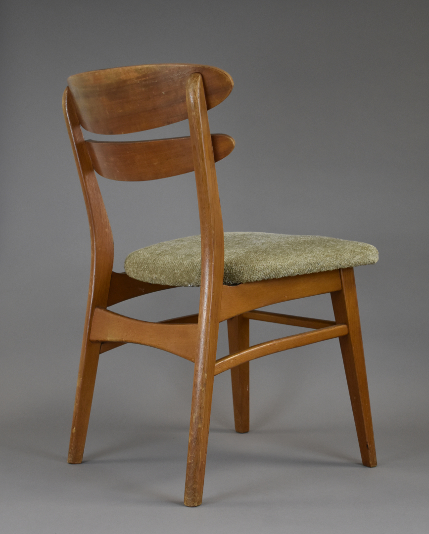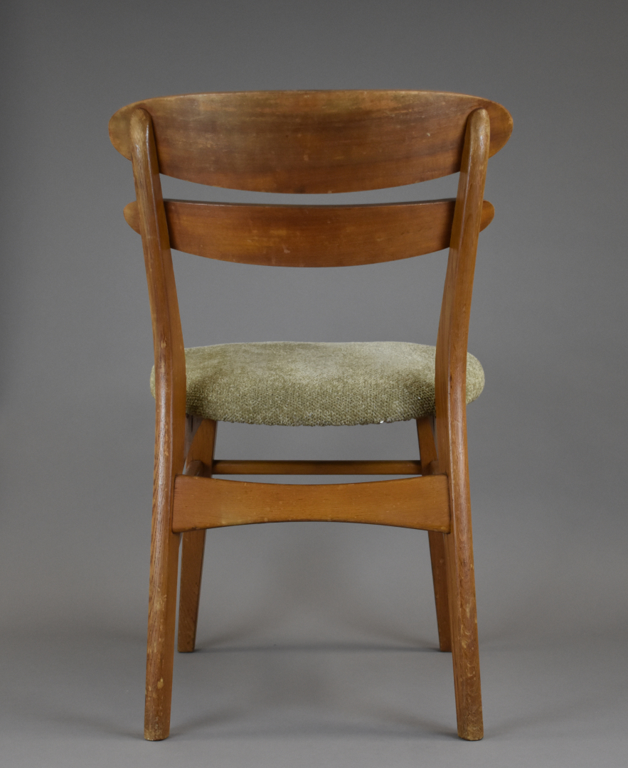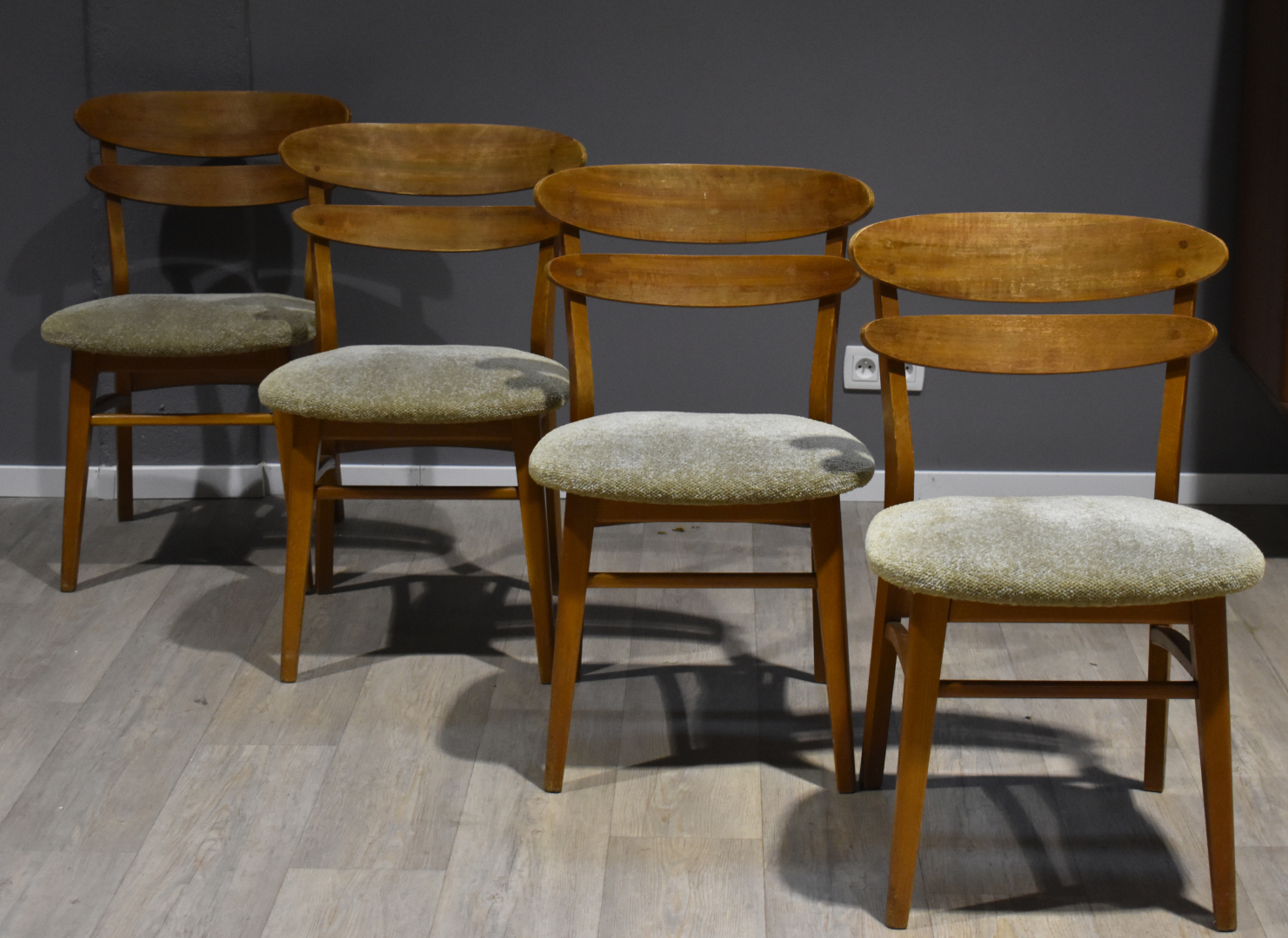 Suite de quatre chaises en placage de teck, les assises garnies de tissu crème (petits éclats, insolées, une restauration). Travail des années 1950/1960 dans le goût scandinave. Haut. : 79 cm.