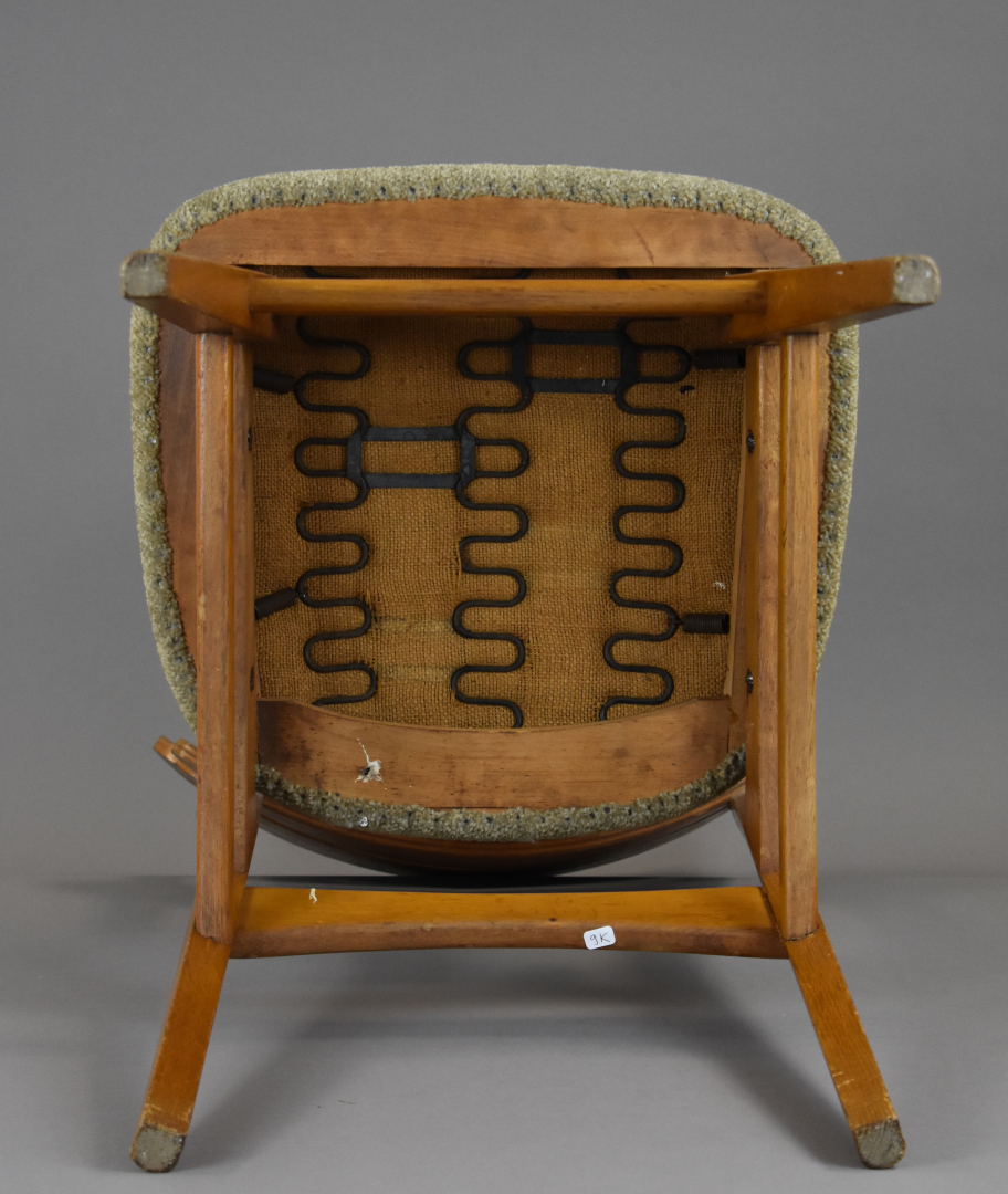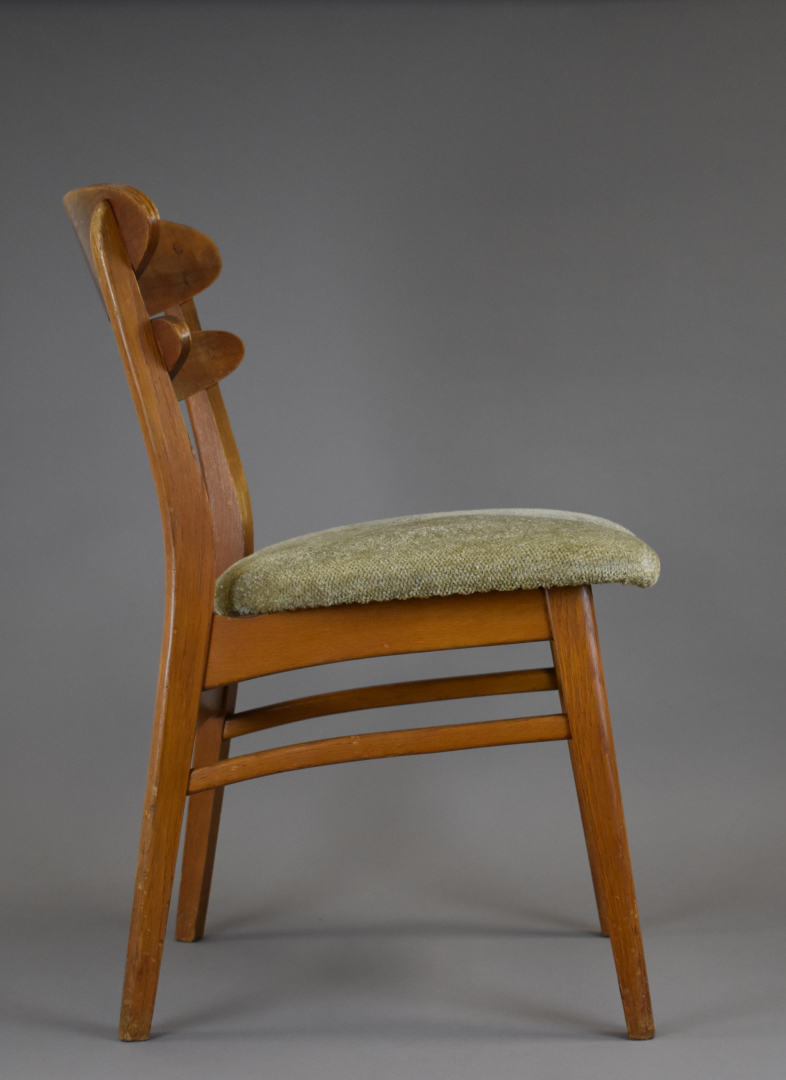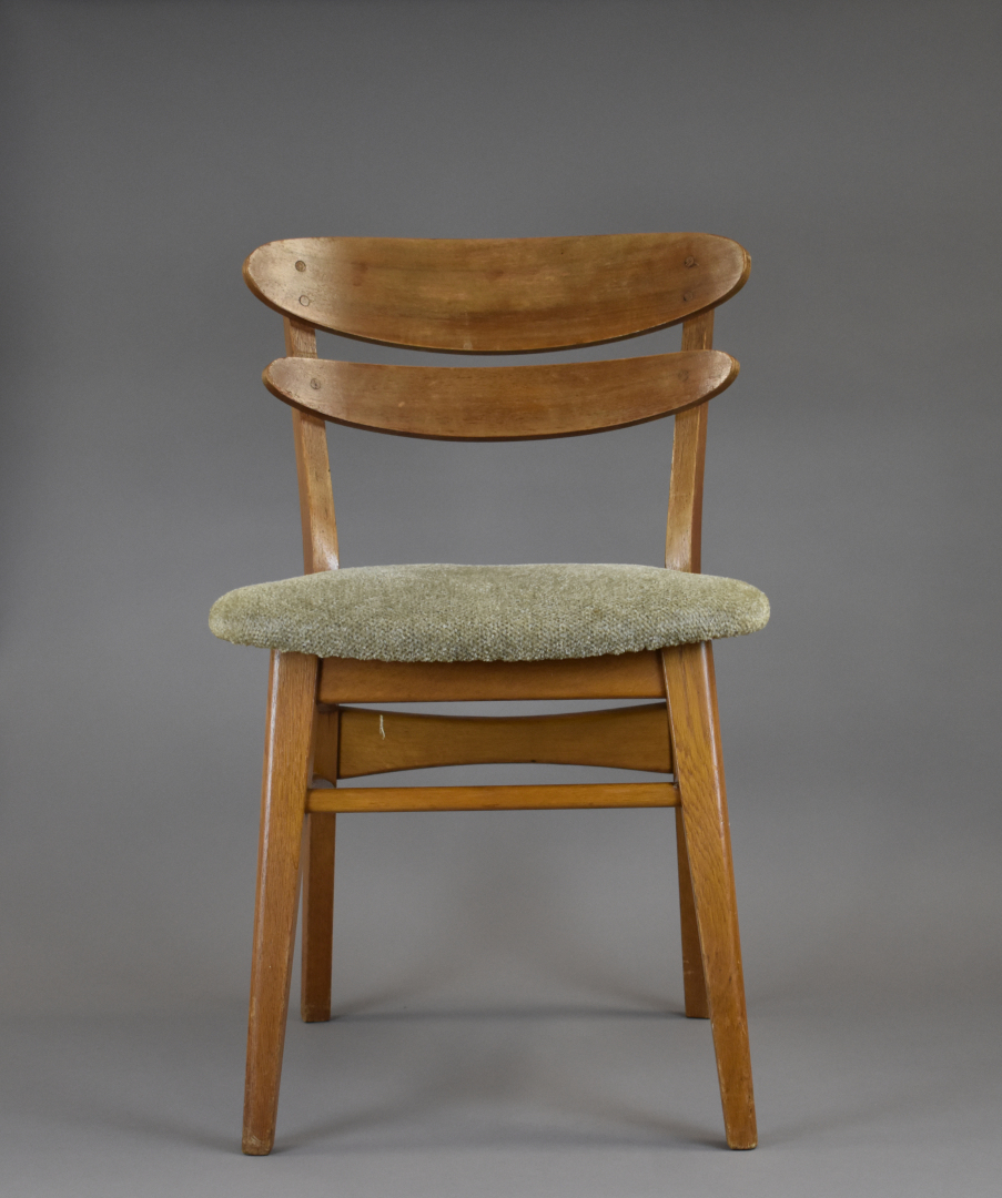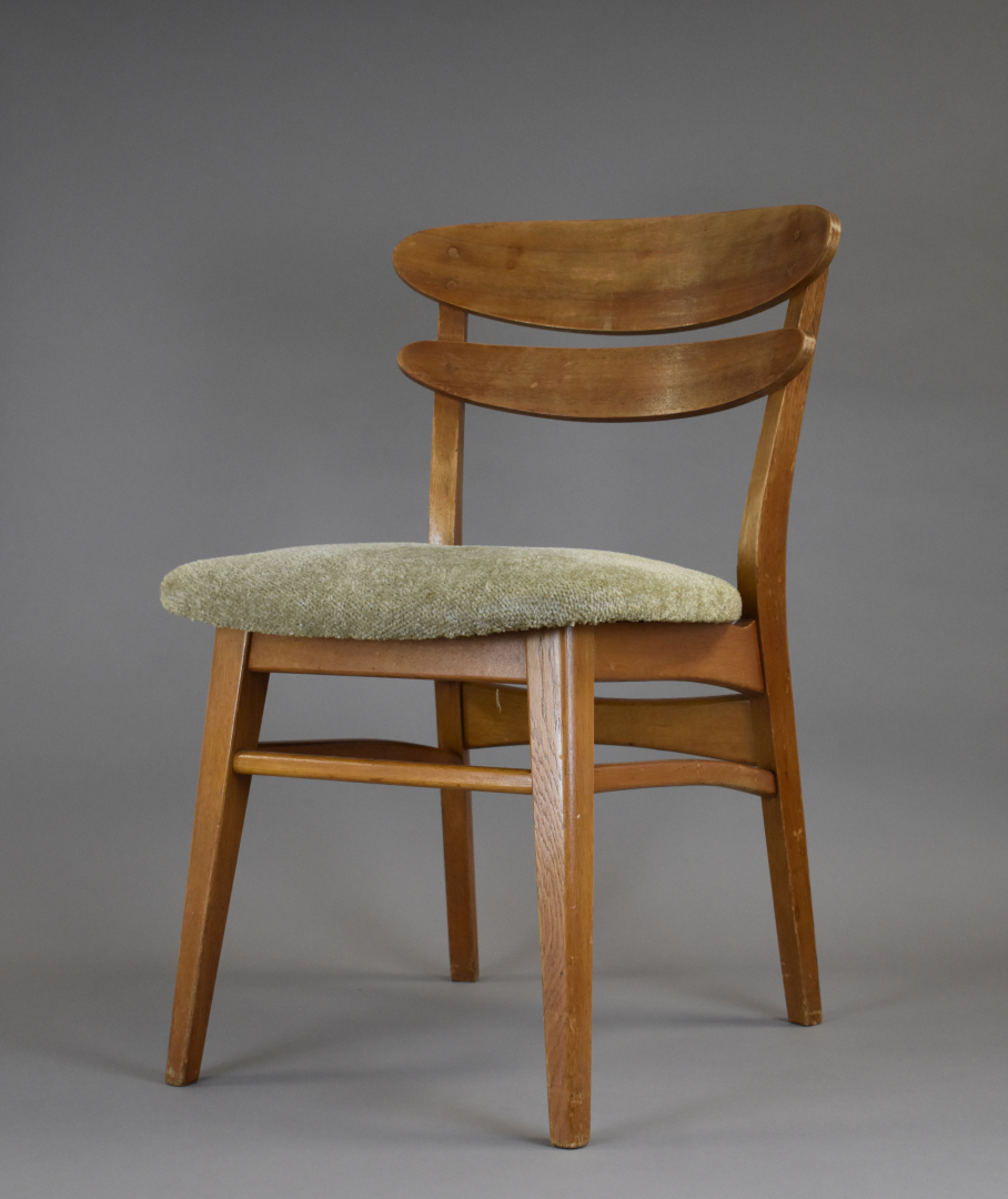 Suite de quatre chaises en placage de teck, les assises garnies de tissu crème (petits éclats, insolées, une restauration). Travail des années 1950/1960 dans le goût scandinave. Haut. : 79 cm.