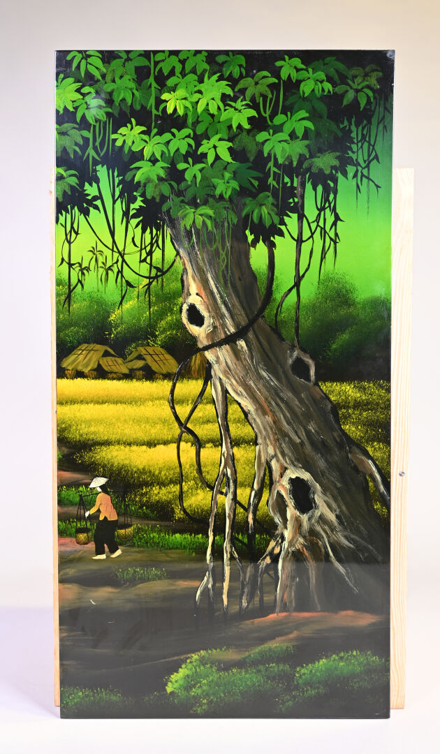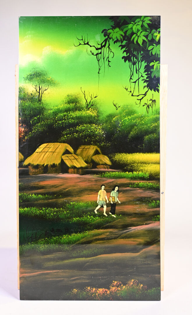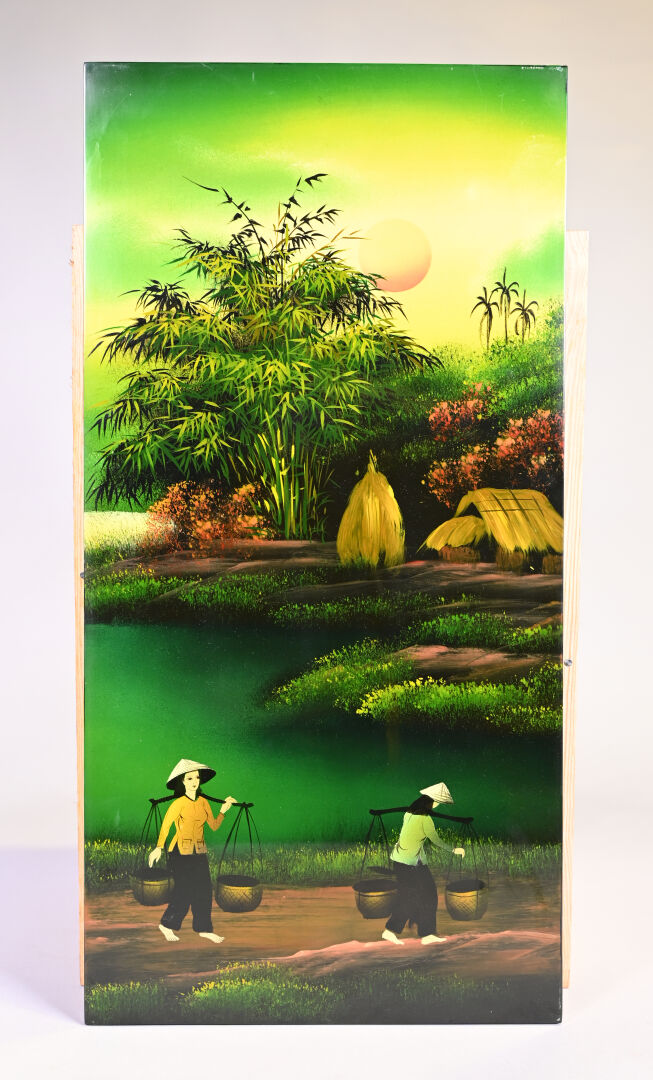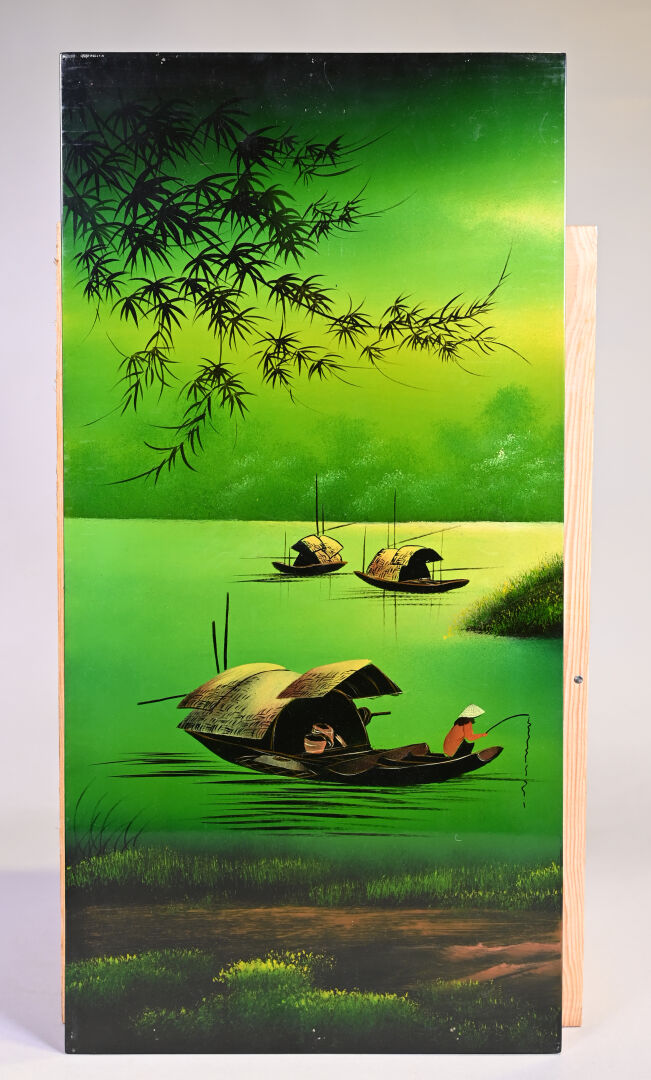Suite de quatre panneaux laqués à décor d’un paysage animé aux jonques et village. Asie du Sud-Est. XXe siècle. Dim. d’un panneau : 60,5 x 30 cm.