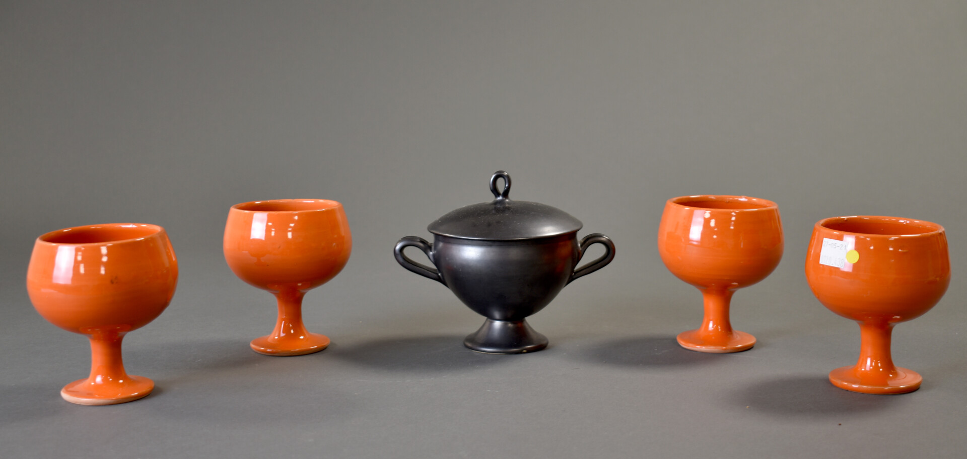 Suite de quatre verres à pieds en céramique orange. Vers 1970. Haut. : 10,5 cm. On joint un pot à sucre en céramique émaillée noire métallique (égrenures).