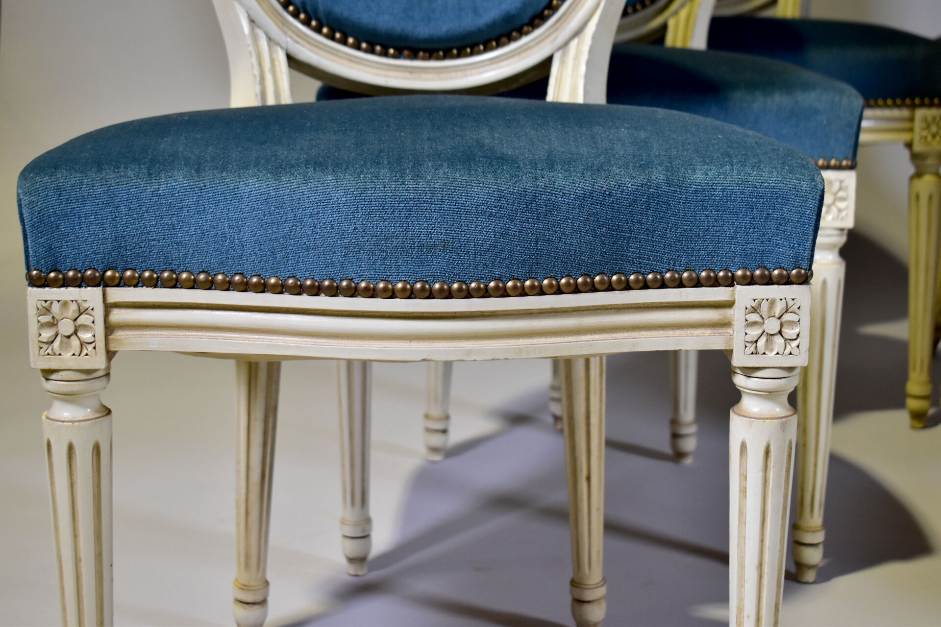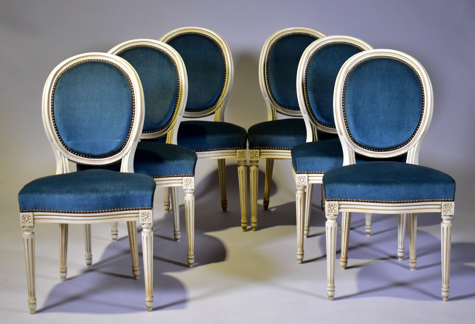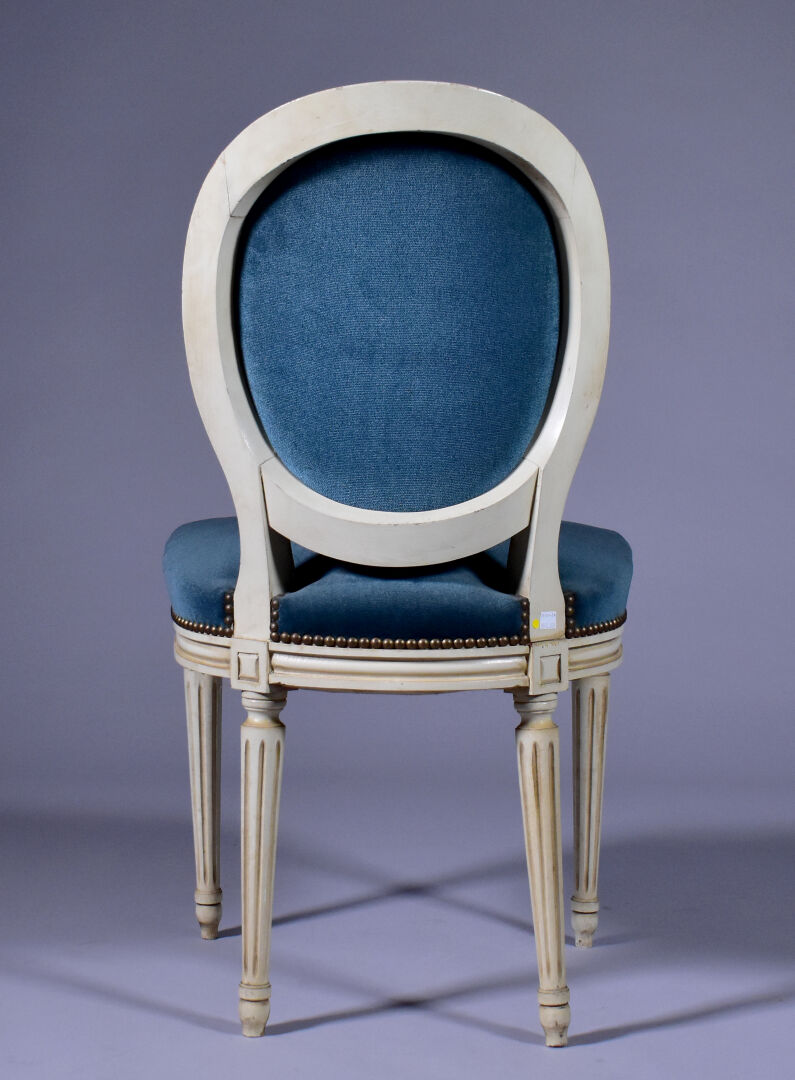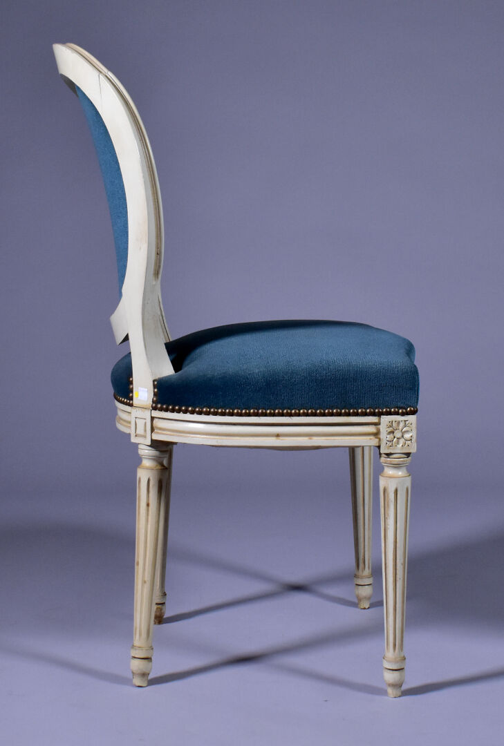 Suite de six chaises à dossier médaillon en bois mouluré laqué crème. Garniture de velours bleu. Style Louis XVI. Haut. : 90,5 cm.