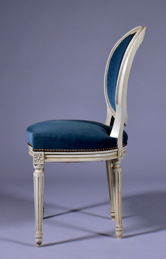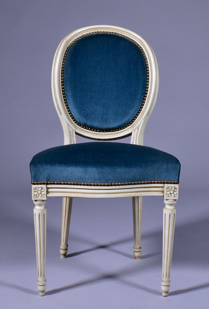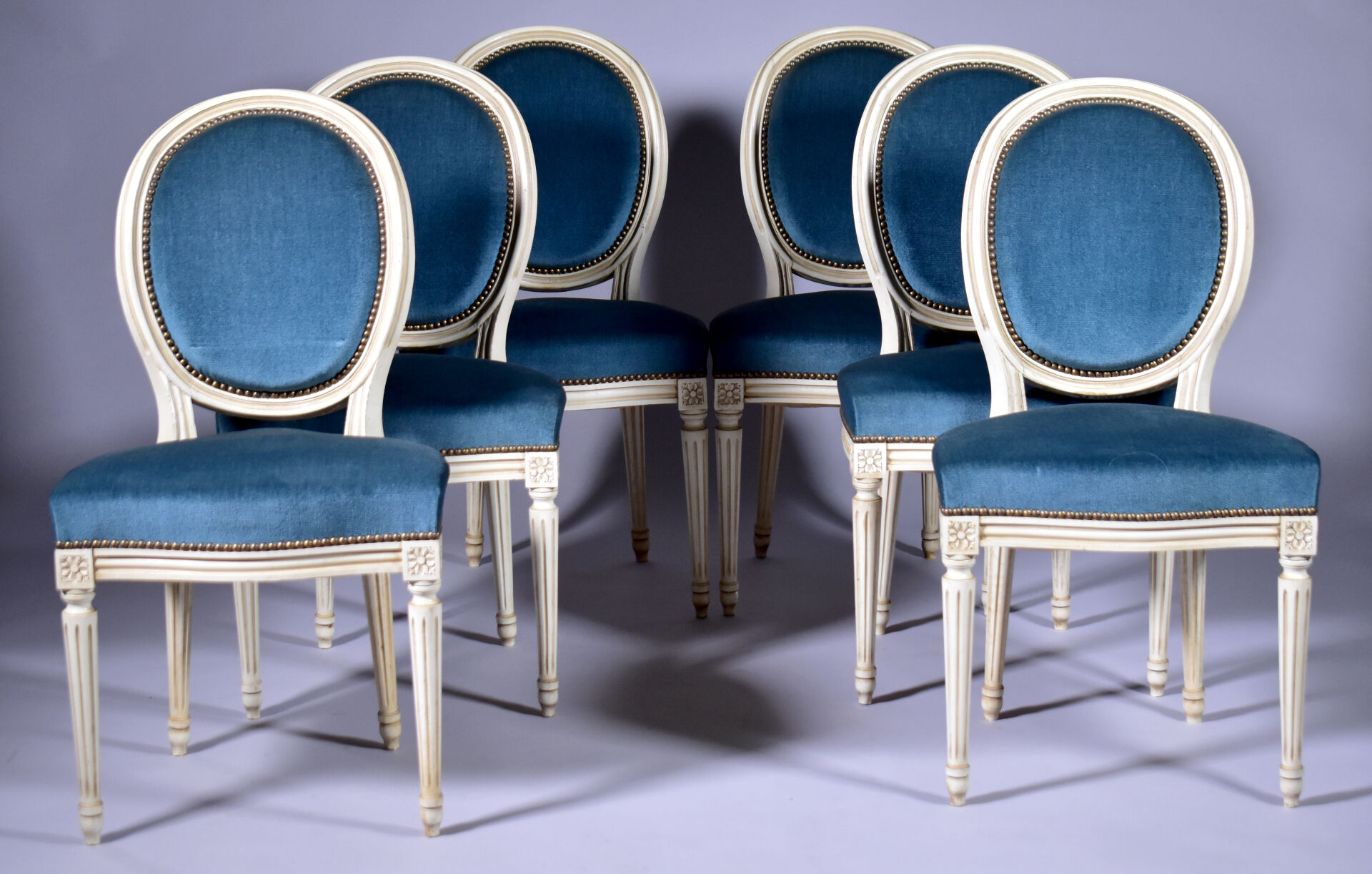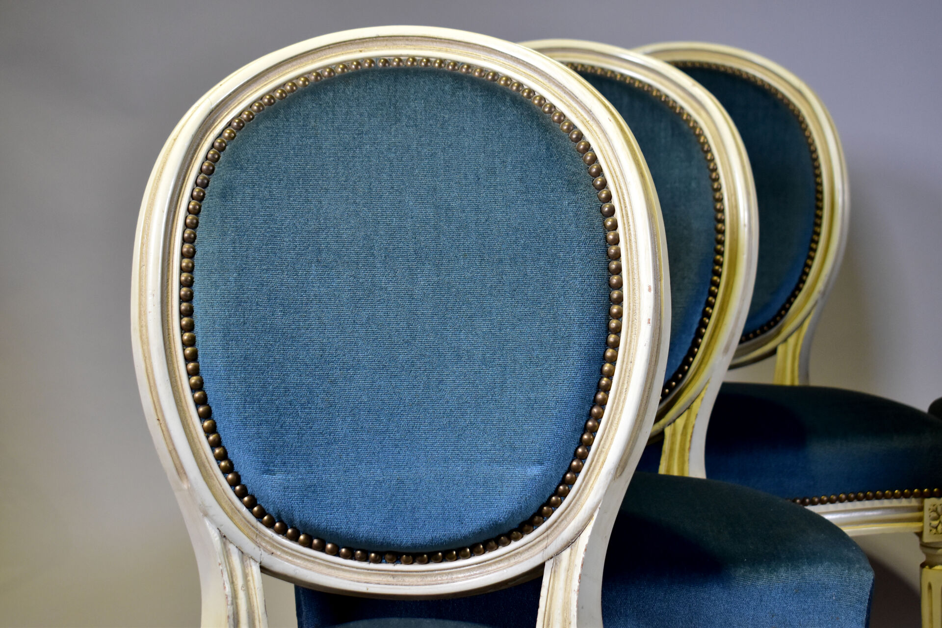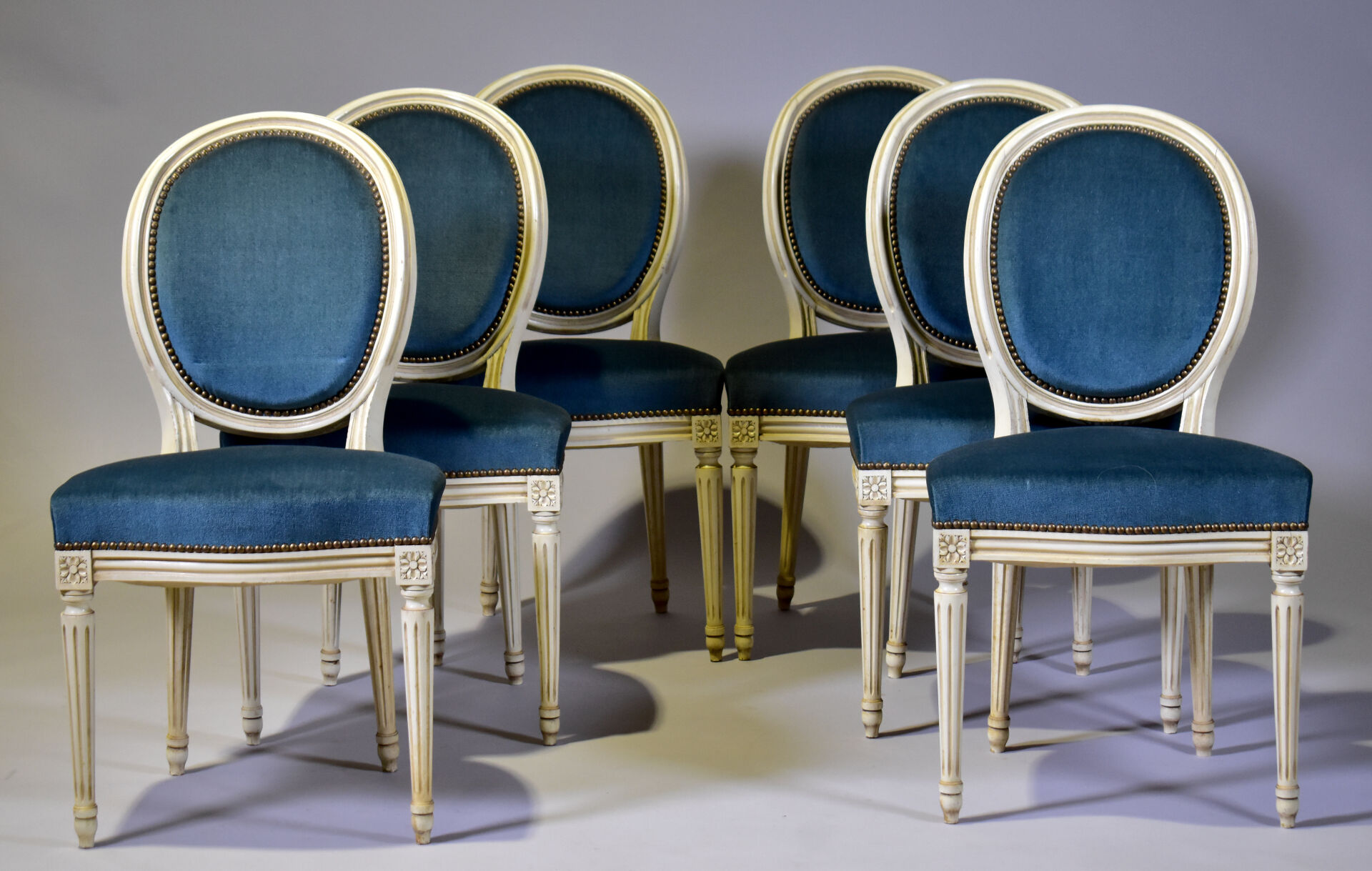 Suite de six chaises à dossier médaillon en bois mouluré laqué crème. Garniture de velours bleu. Style Louis XVI. Haut. : 90,5 cm.