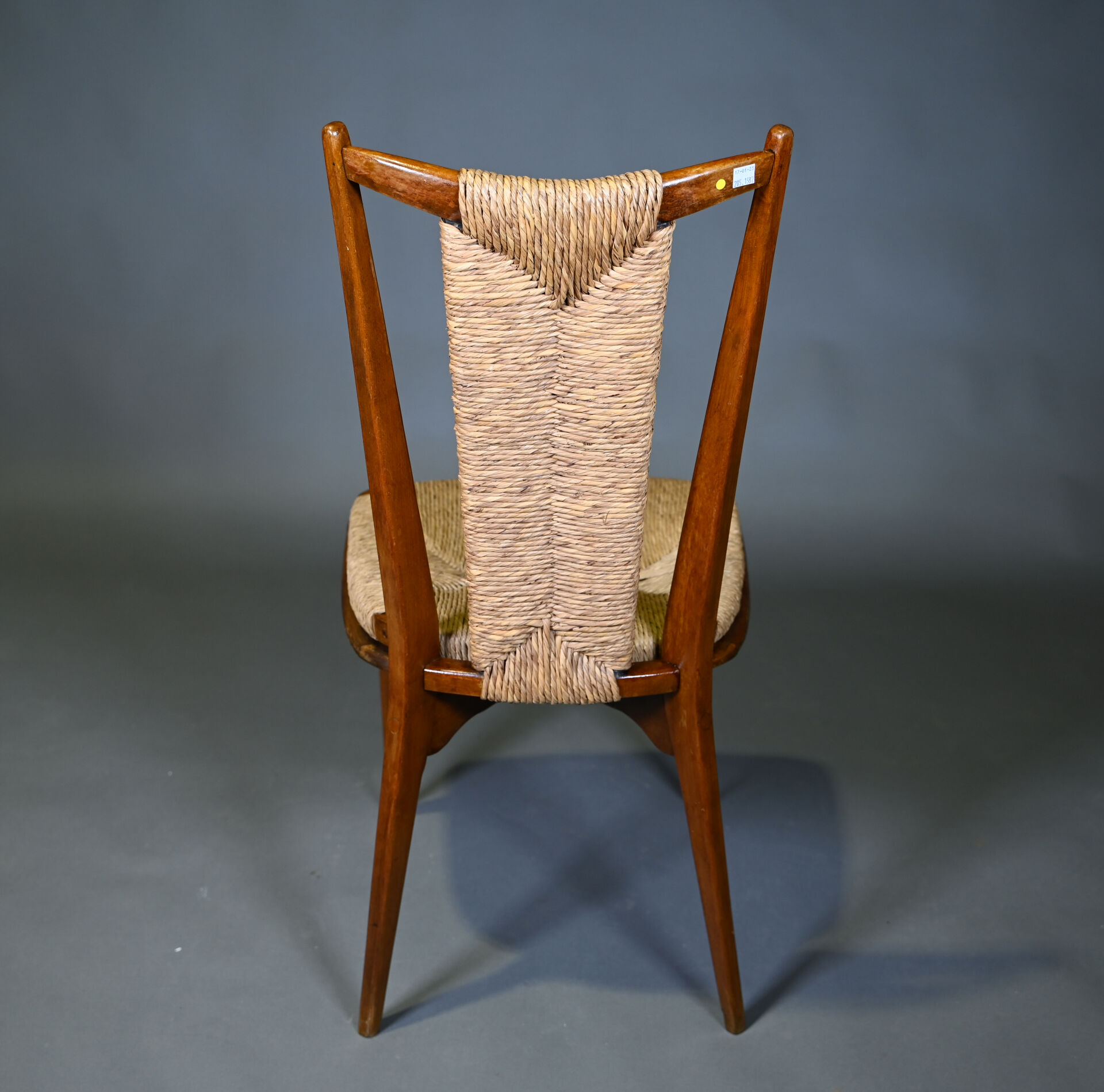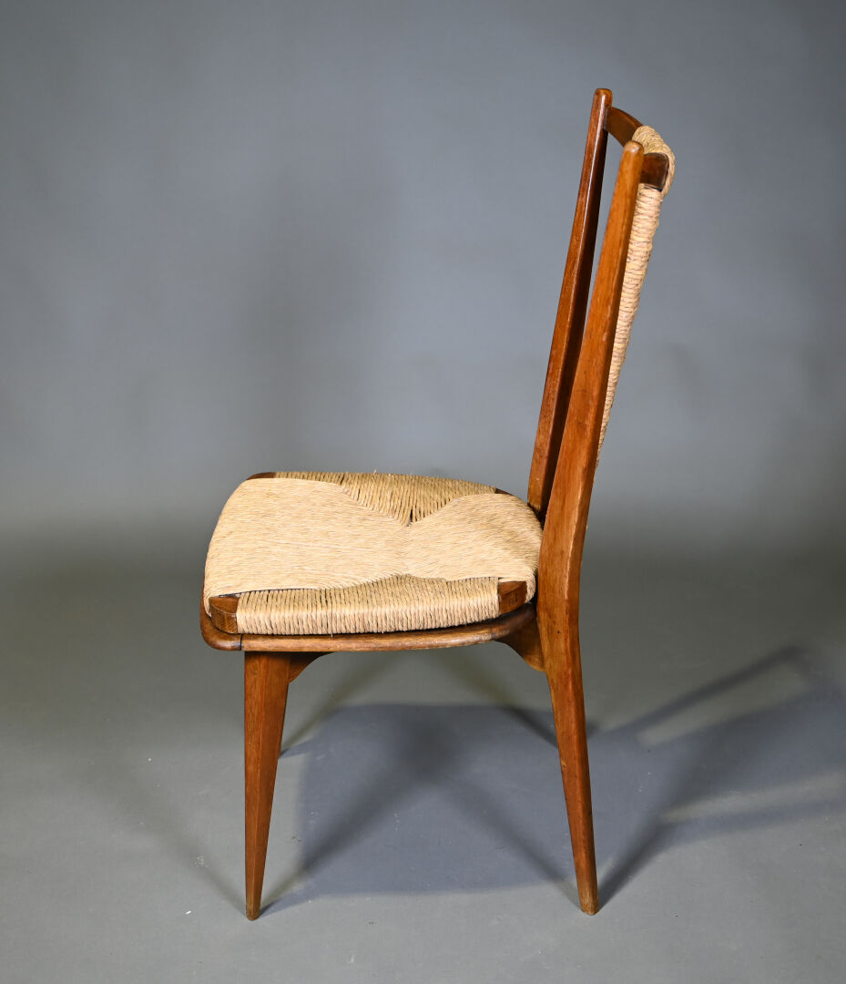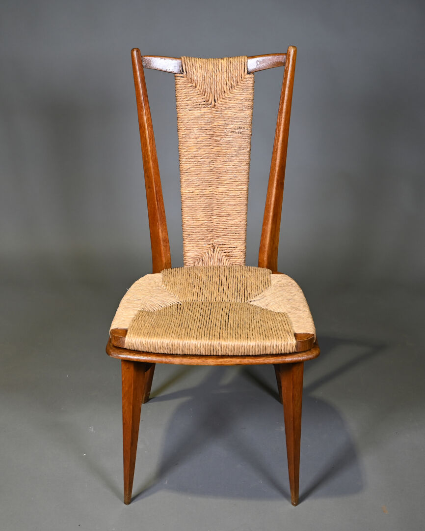 Suite de six chaises en bis teinté à dossier et assise ajourée paillés. Pieds fuselés (usures d’usage). Vers 1960/1970. Haut. : 80 cm.