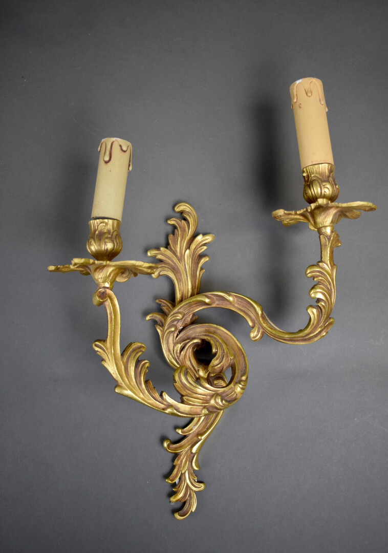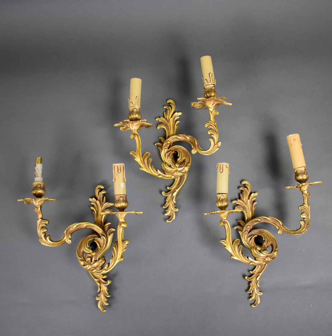 Suite de trois appliques en bronze ciselé doré à deux bras de lumière feuillagés. Style Louis XV. Haut. : 40 cm.