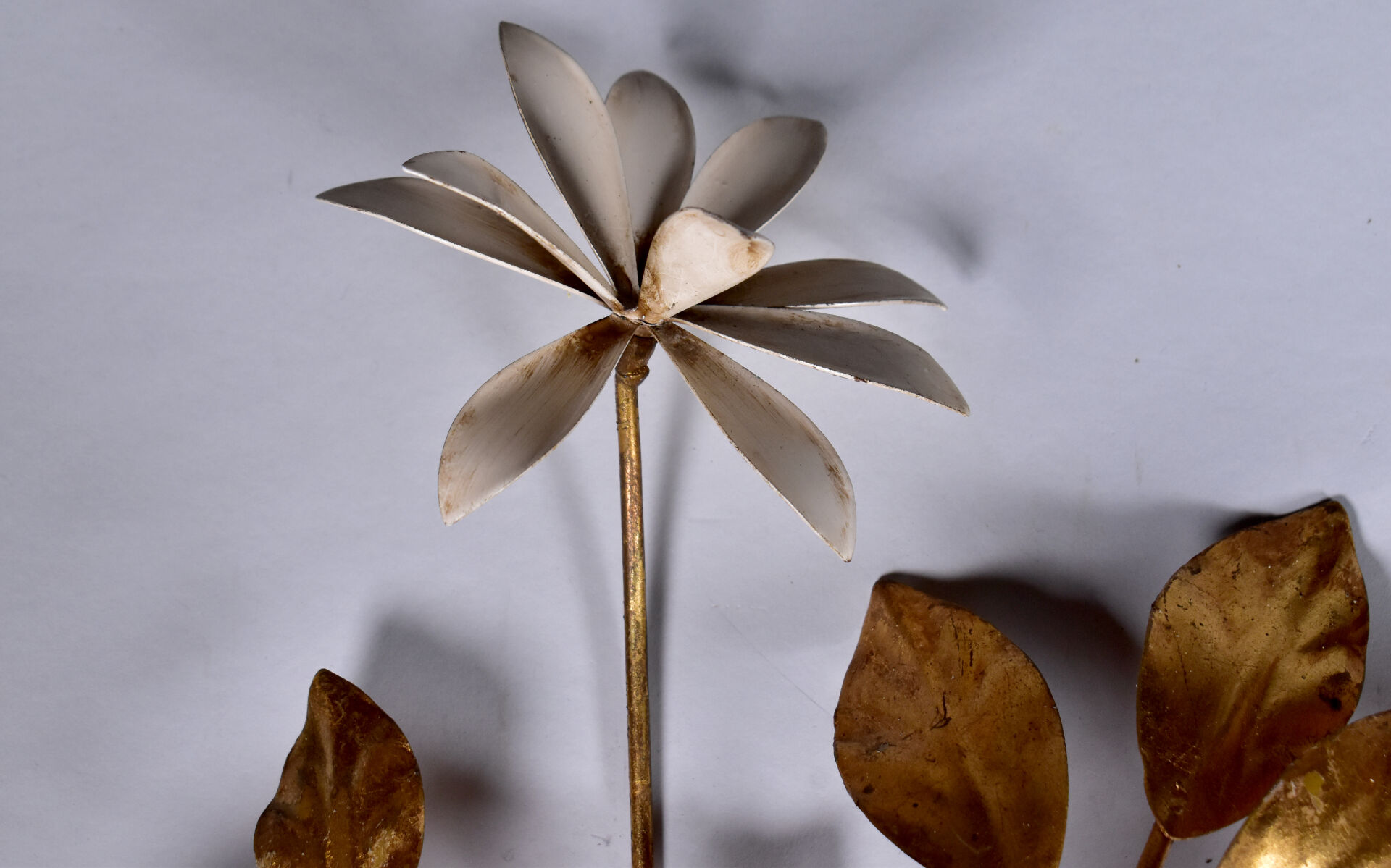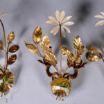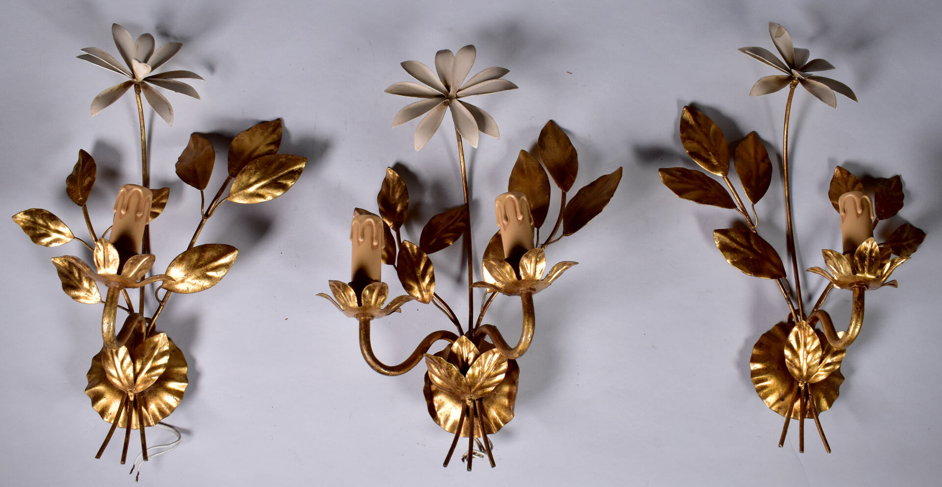 Suite de trois appliques en métal doré et laqué crème, soit une paire à un bras de lumière et une à deux bras de lumière, les trois ornées de fleurs. Haut. : 40 cm.