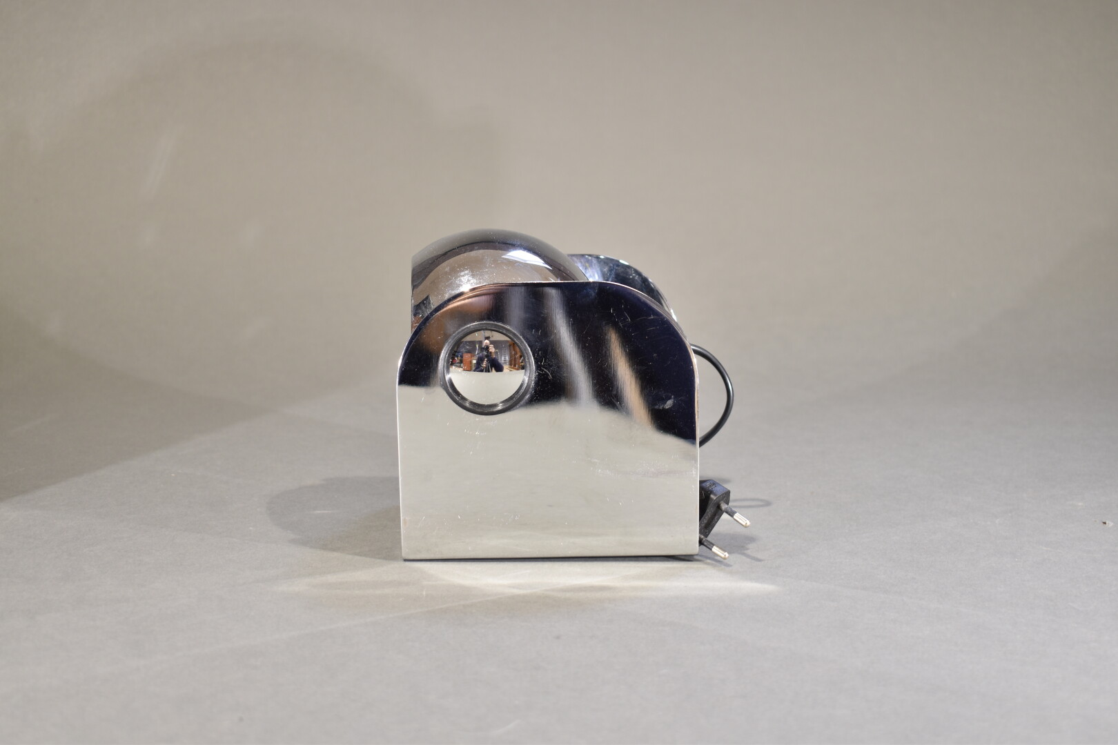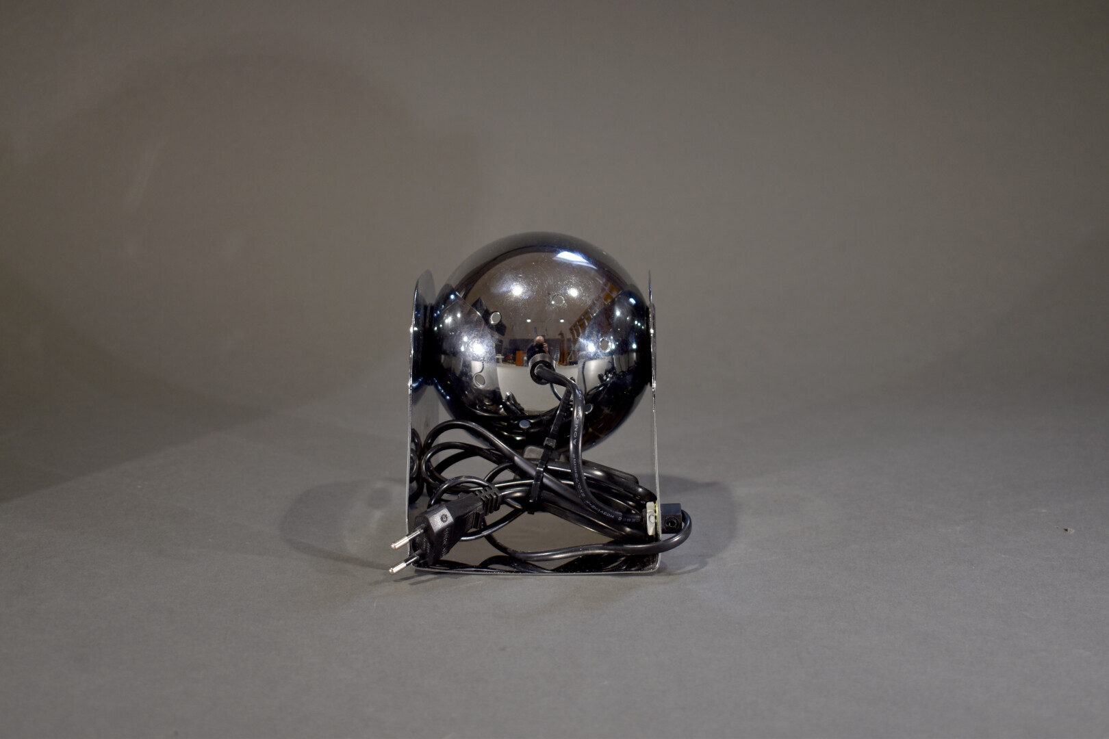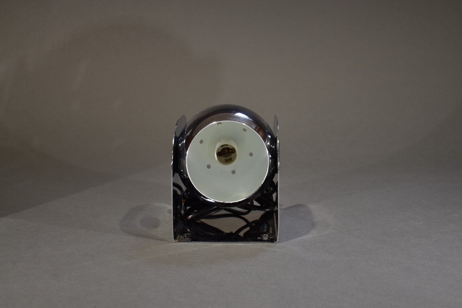 Suite de trois appliques ou lampes à poser sphériques en métal chromé, orientables. Dans le goût des années 1970. Haut. : 16 cm – Larg. : 12 cm – Prof. : 14 cm.