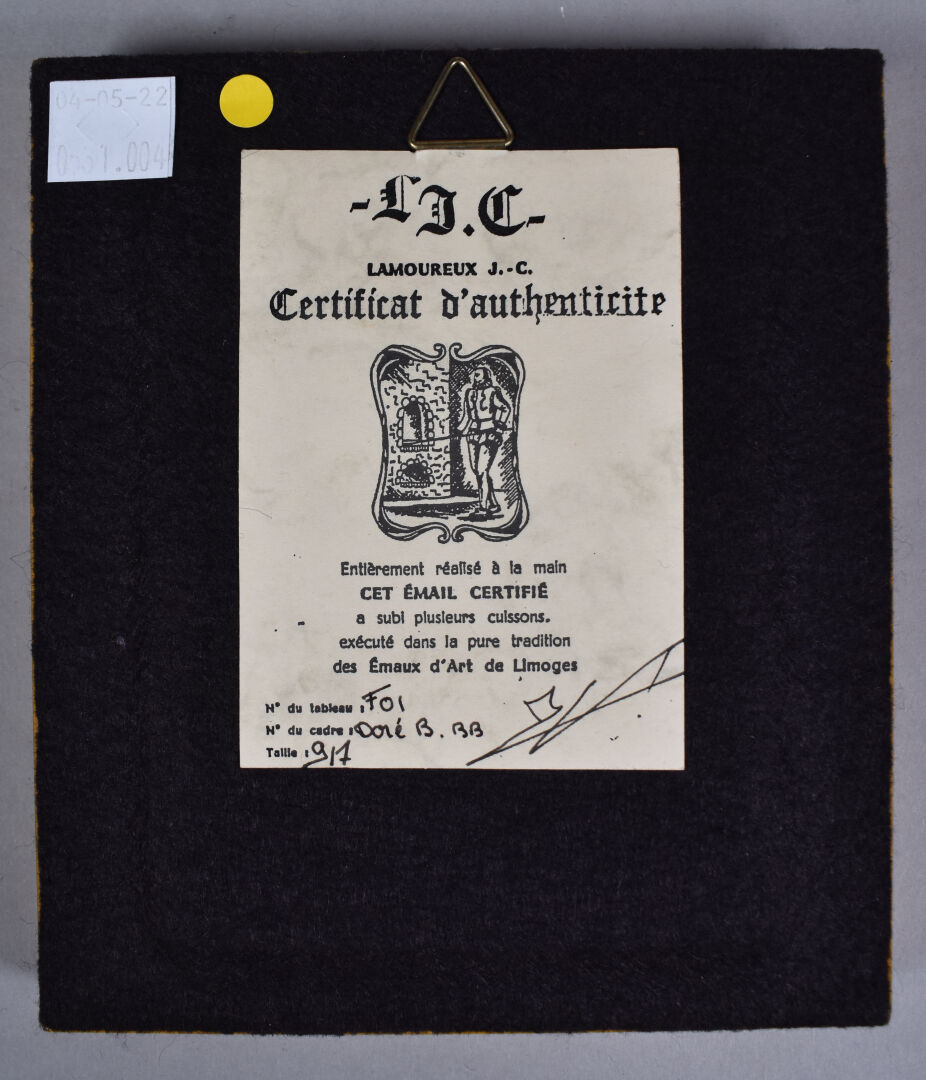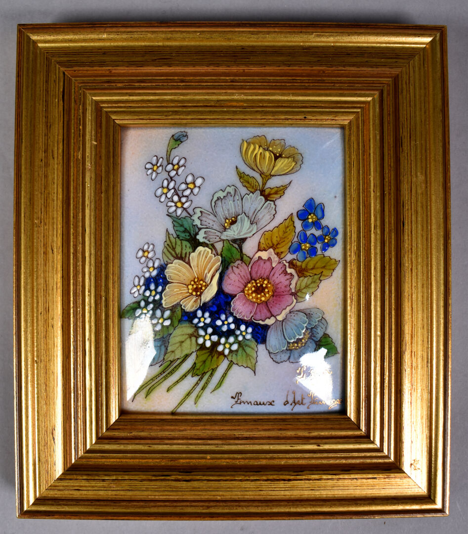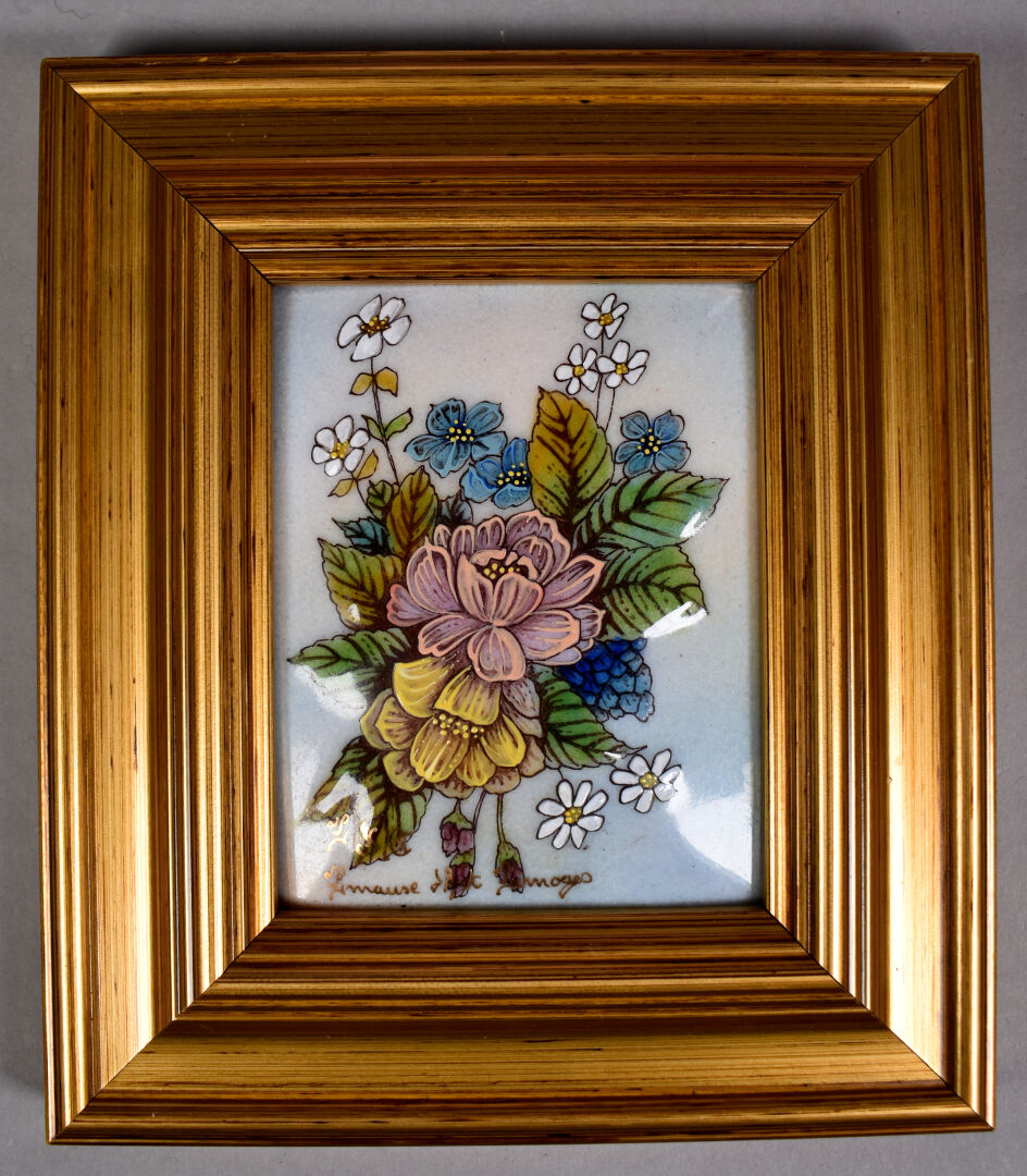Suite de trois plaques émaillée en polychromie, une au colibri et deux aux fleurs. Limoges, milieu du XXe siècle. Dim. de la plus grande : 18 x 12,5 cm.