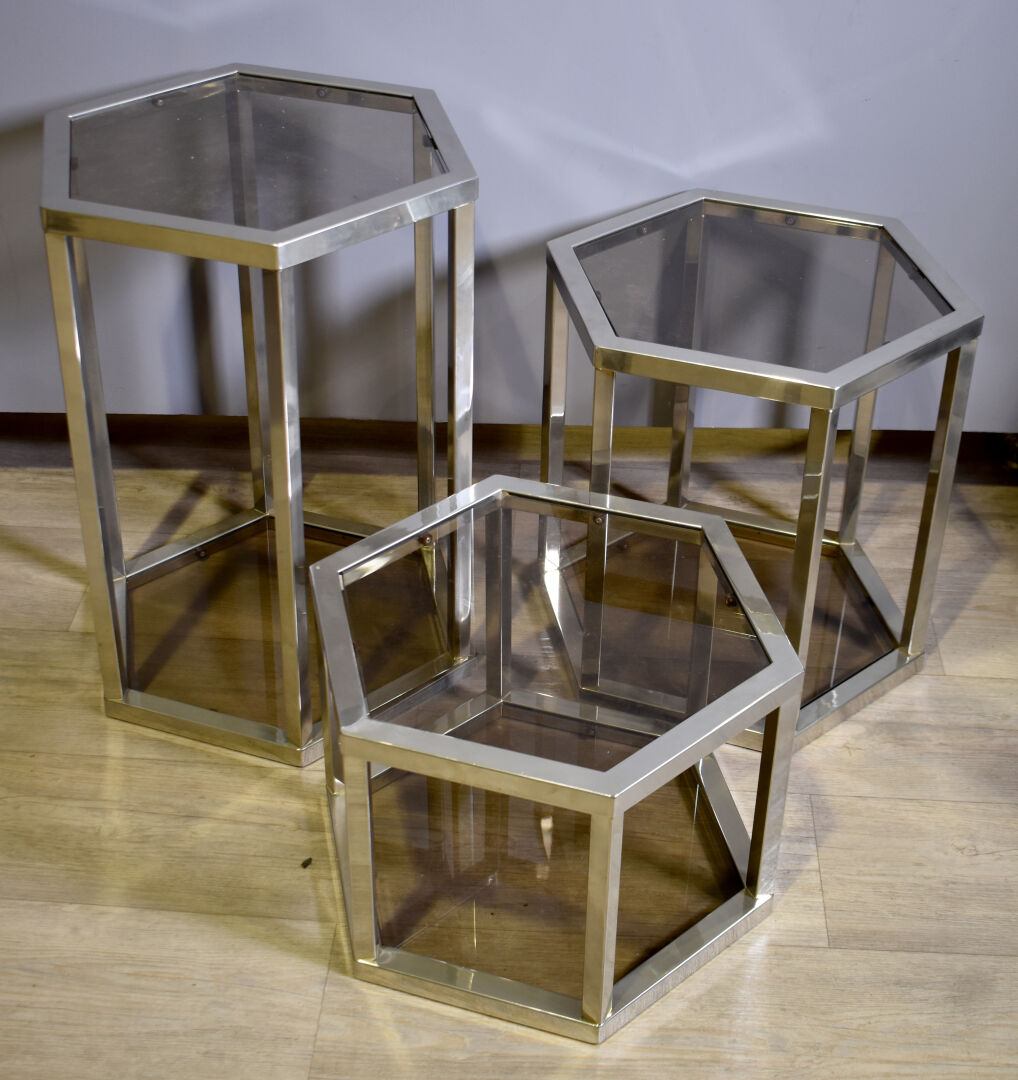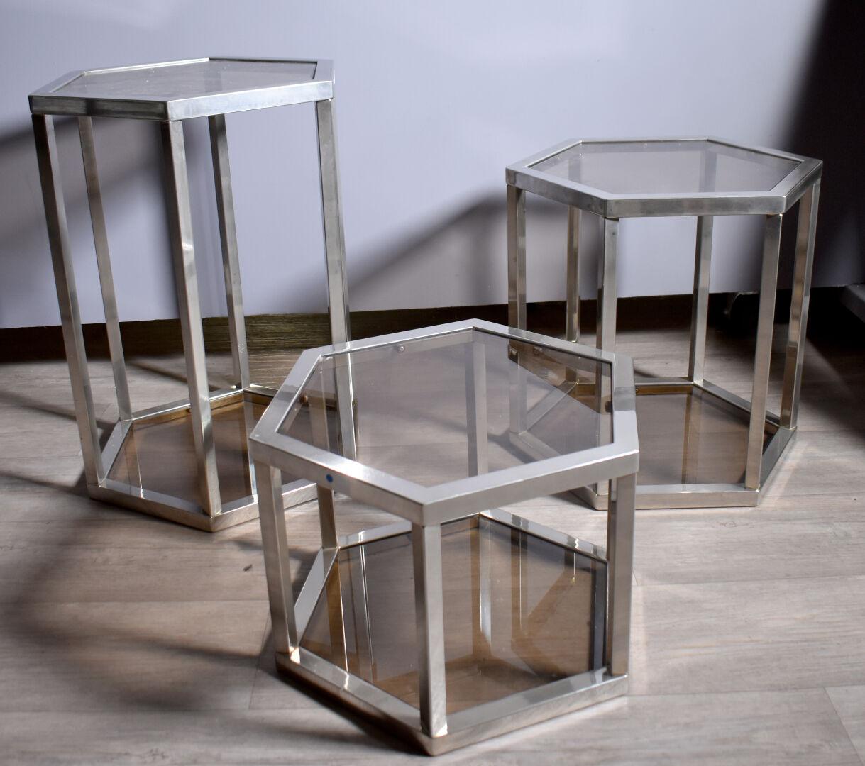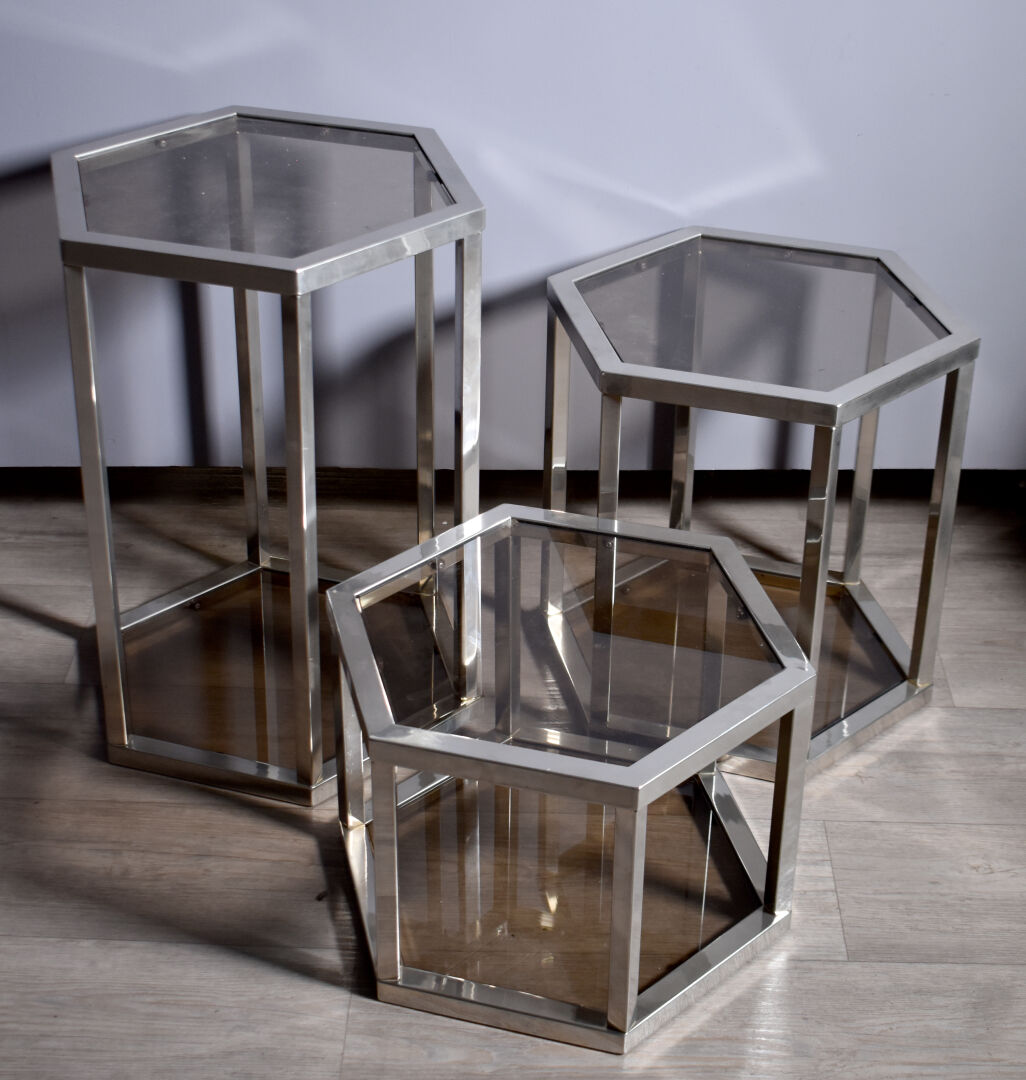 Suite de trois tables d’appoint hexagonales en métal chromé à double plateau de verre fumé (un éclat sur un plateau). Travail des années 1970. Haut. : 60 cm – Haut. : 45 cm – Haut. : 30 cm.