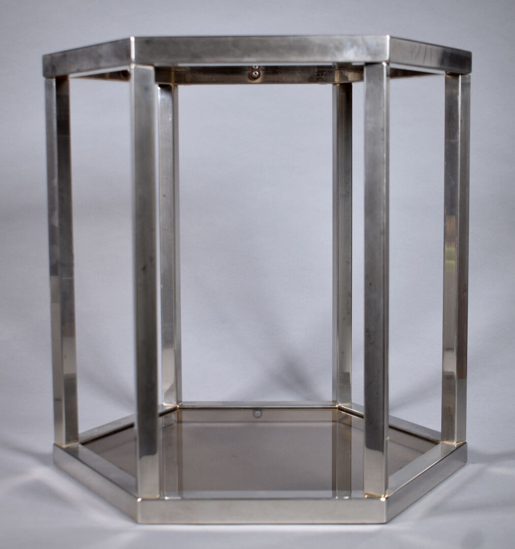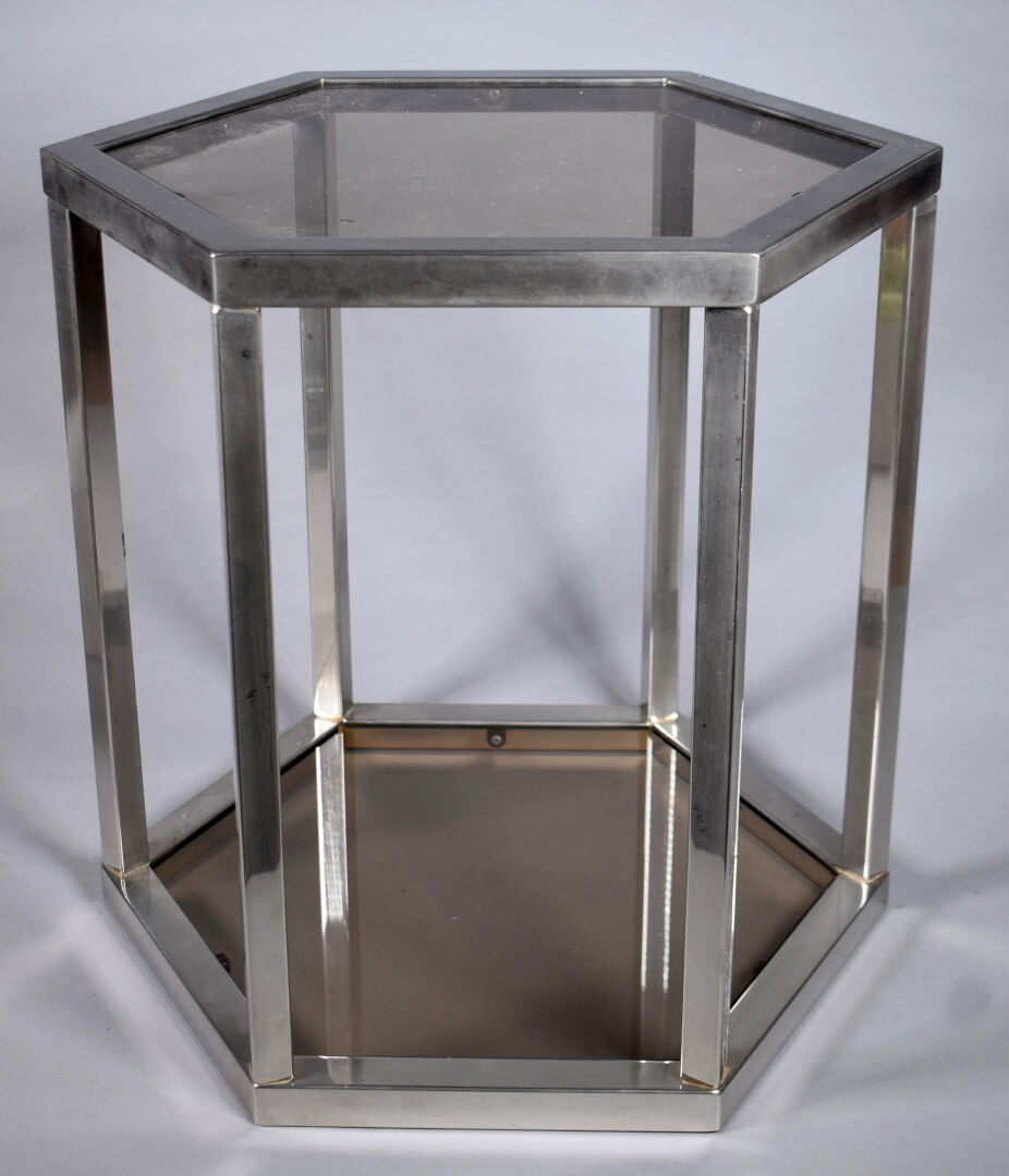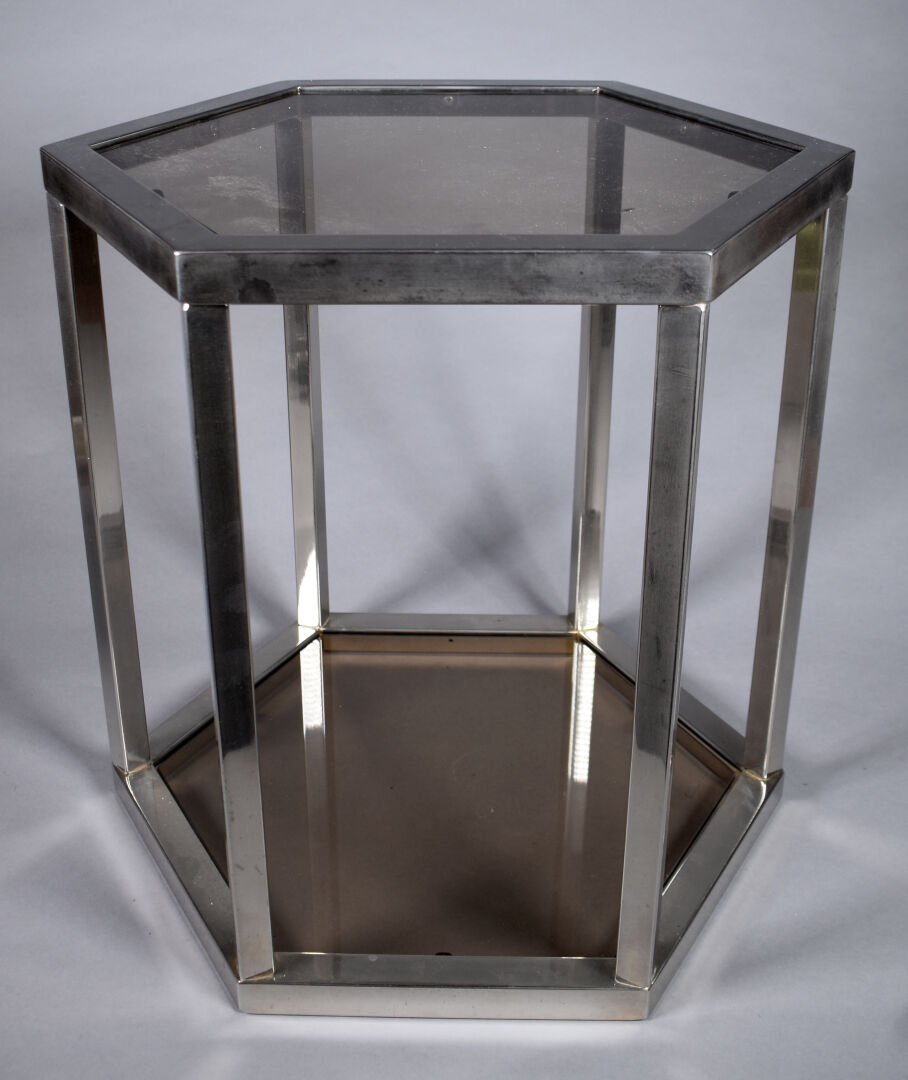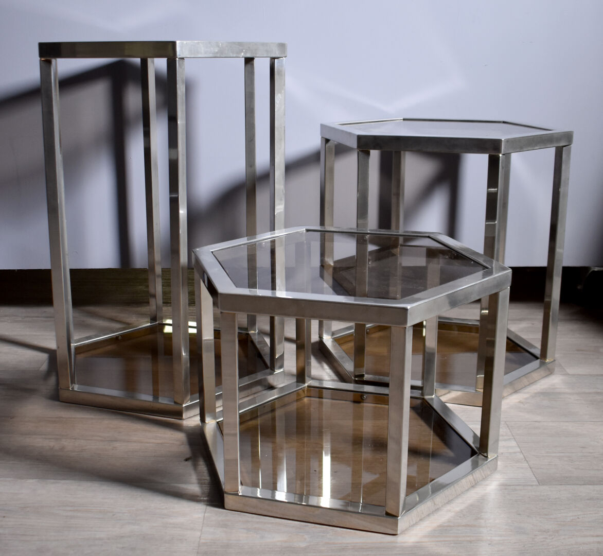 Suite de trois tables d’appoint hexagonales en métal chromé à double plateau de verre fumé (un éclat sur un plateau). Travail des années 1970. Haut. : 60 cm – Haut. : 45 cm – Haut. : 30 cm.