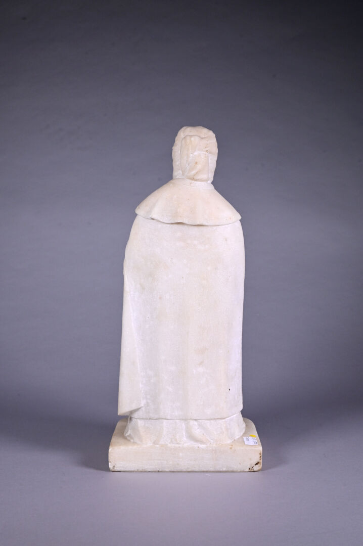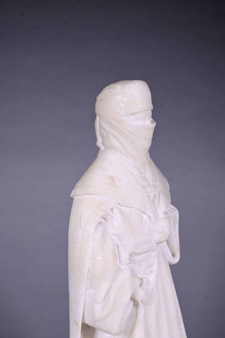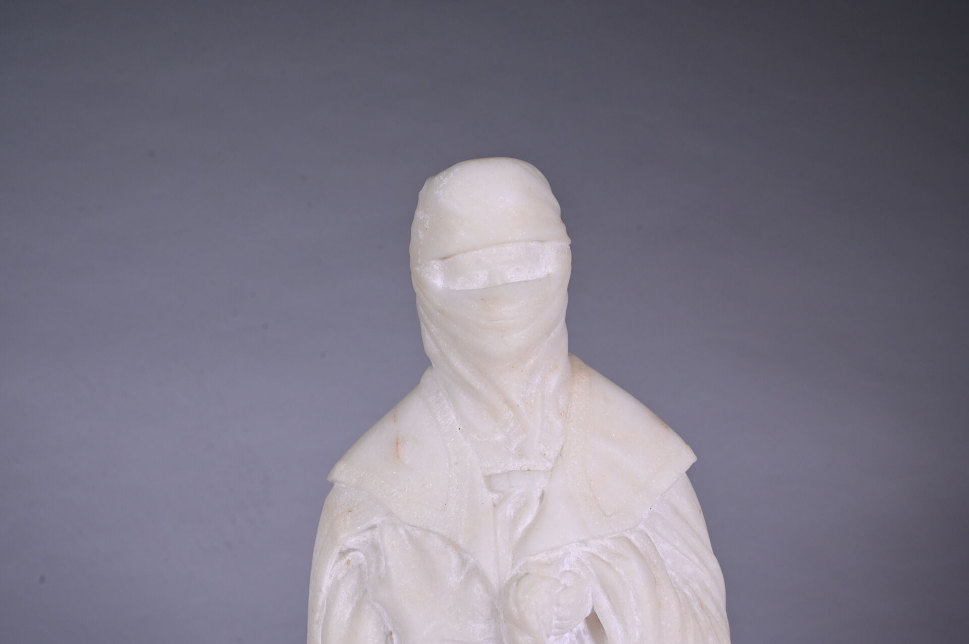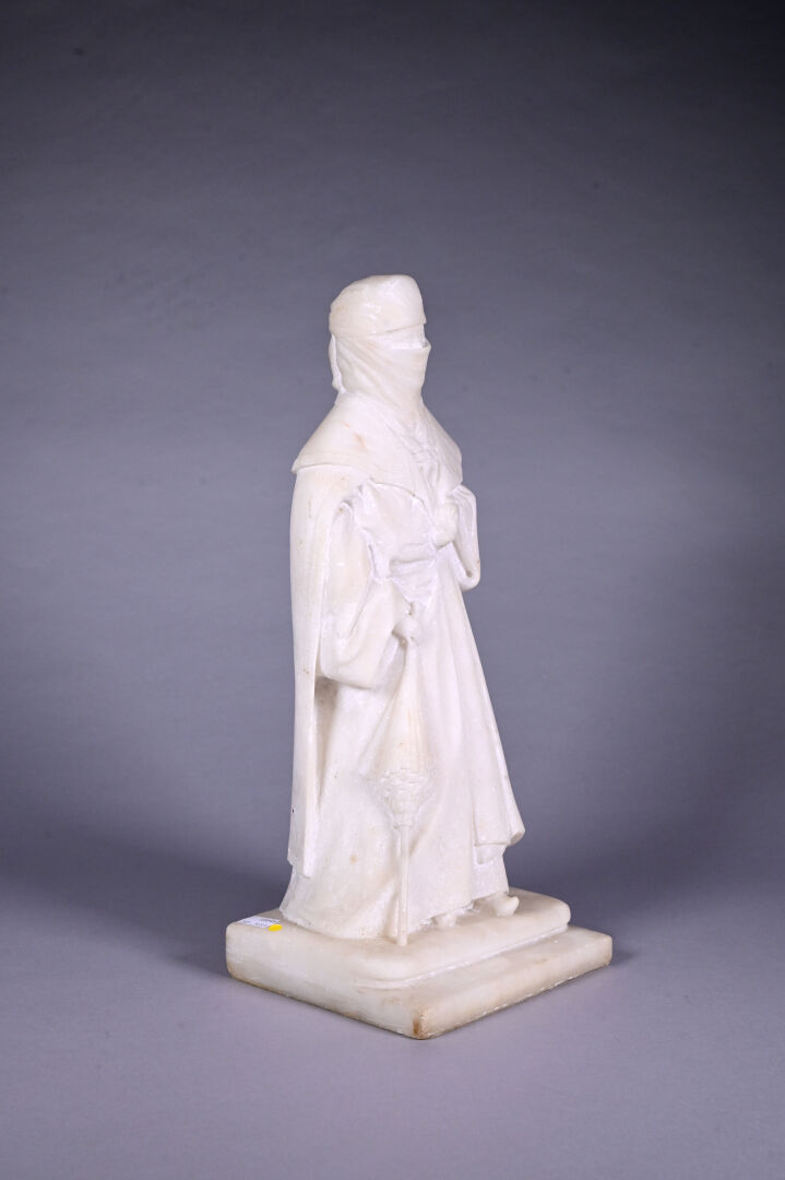 Sujet en albâtre représentant une femme (orientale ?) au visage masqué, tenant une ombrelle. Haut. : 44 cm.