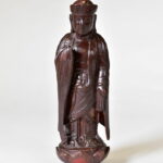 Sujet en bois laquée, représentant la déesse Guanyin debout sur un lotus, la main gauche dans le geste du don (varada mudra). Indochine, fin XIXe siècle. Haut. : 32 cm.