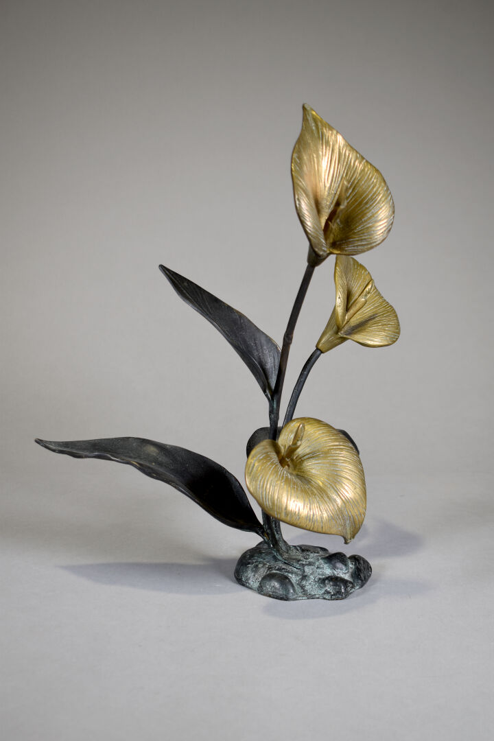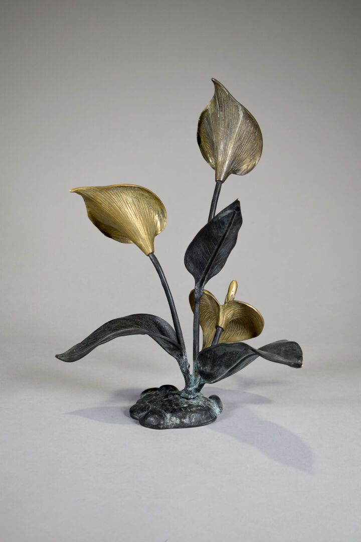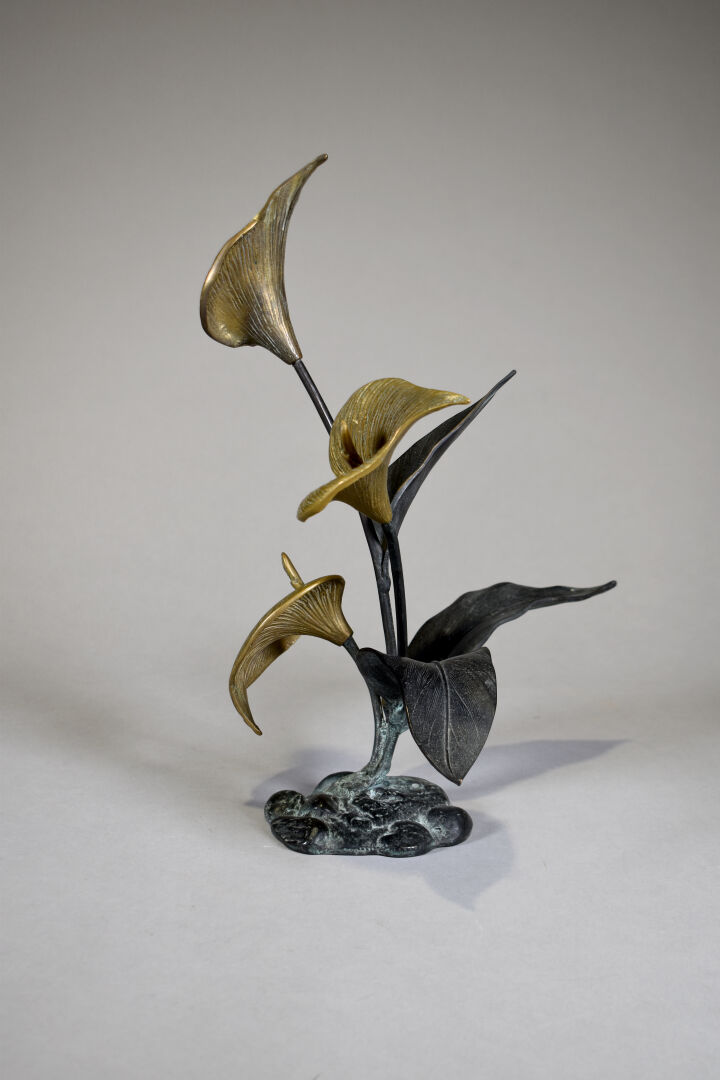 Sujet en bronze à patine brun et doré représentant 3 arûms. XXe siècle. Haut. : 41 cm.