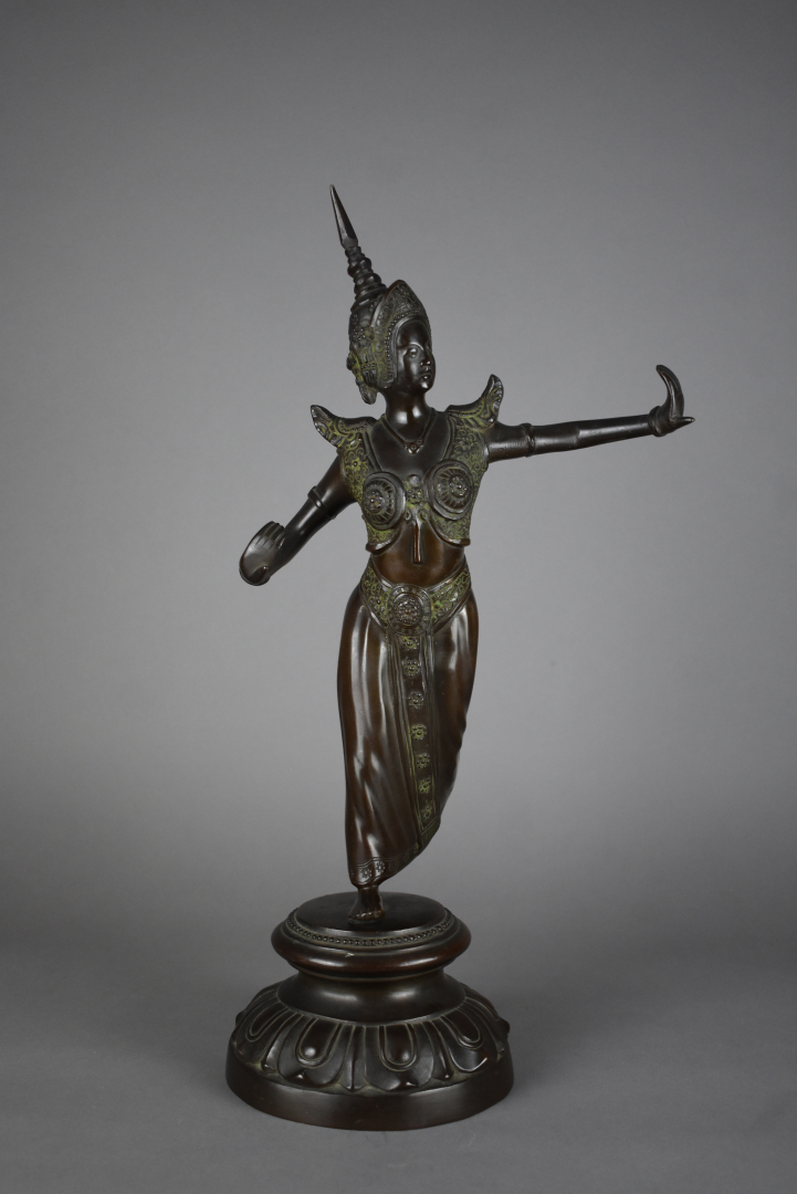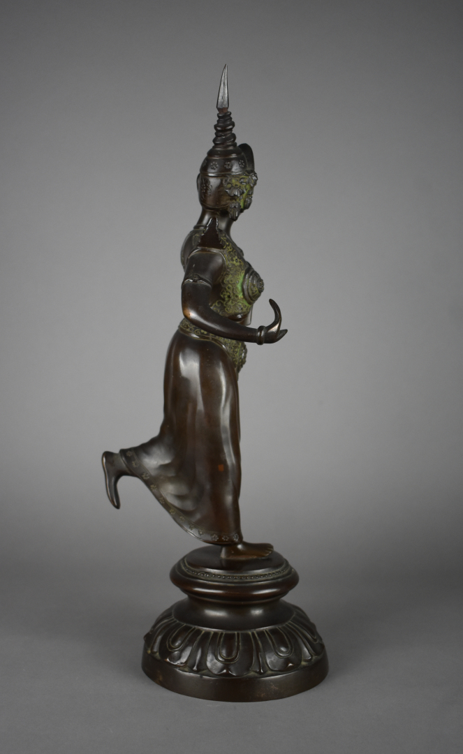 Sujet en bronze à patine brun rouge représentant une danseuse cambodgienne (Ramayana). Sur un socle reprenant la forme d’une fleur de lotus. Cambodge, vers 1920. Haut. : 45 cm.