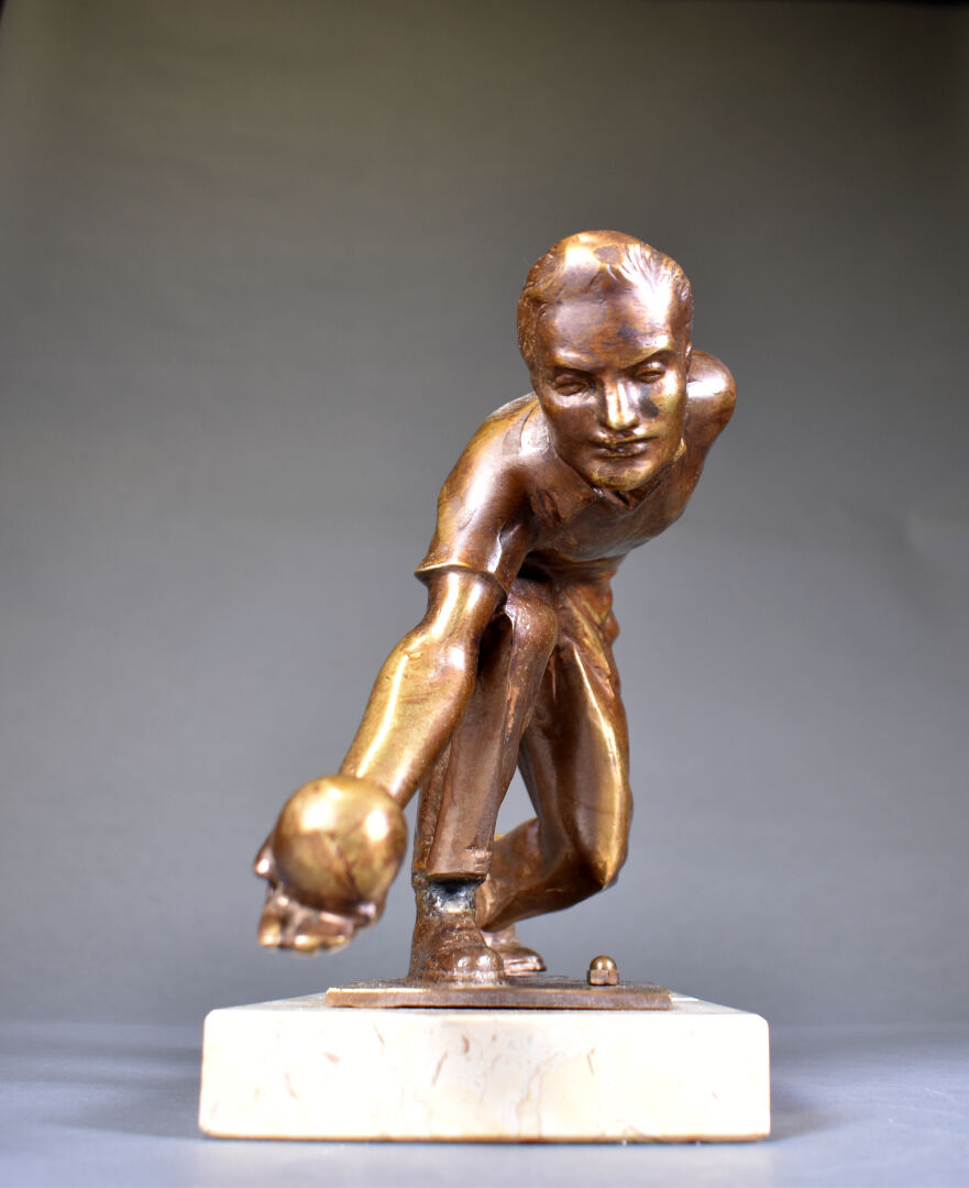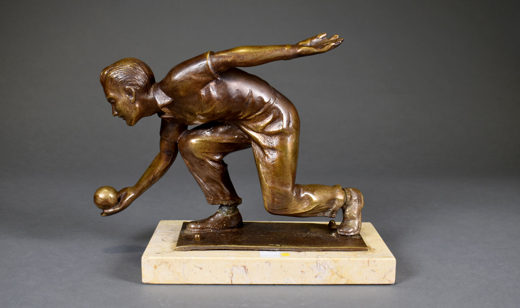 Sujet en bronze patiné or figurant un joueur de pétanque sur un socle de pierre dure jaune. XXe siècle. Haut. : 24,5 cm.