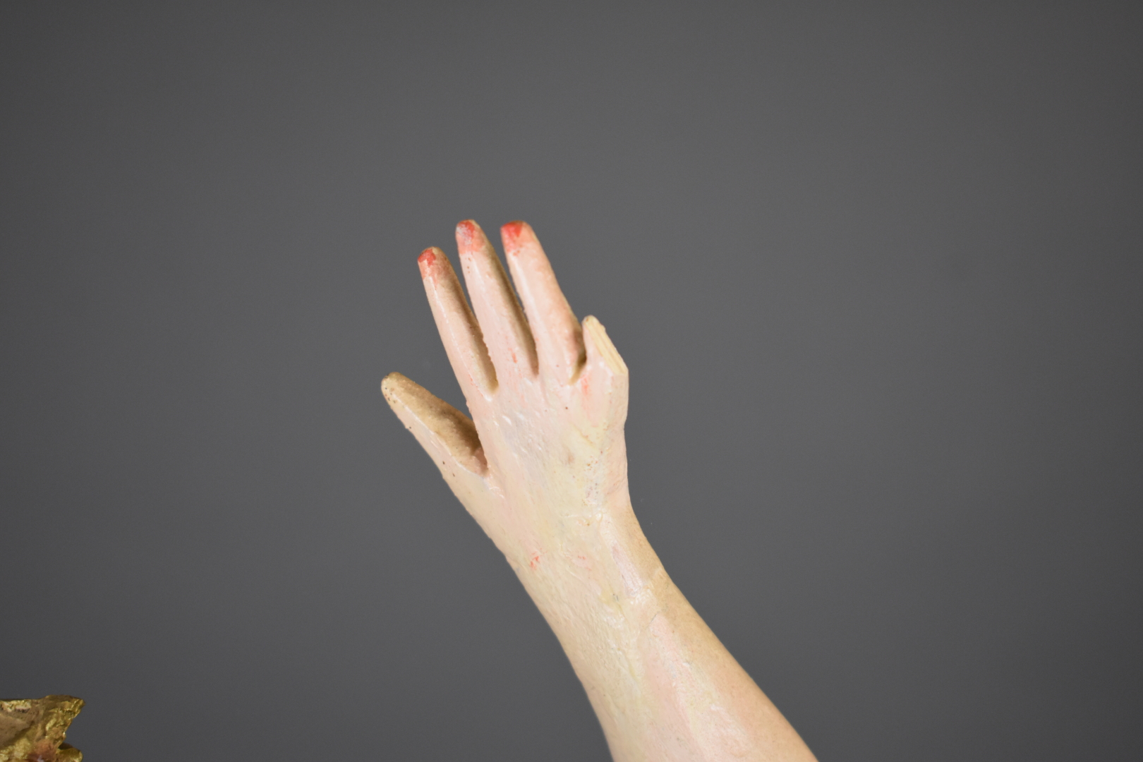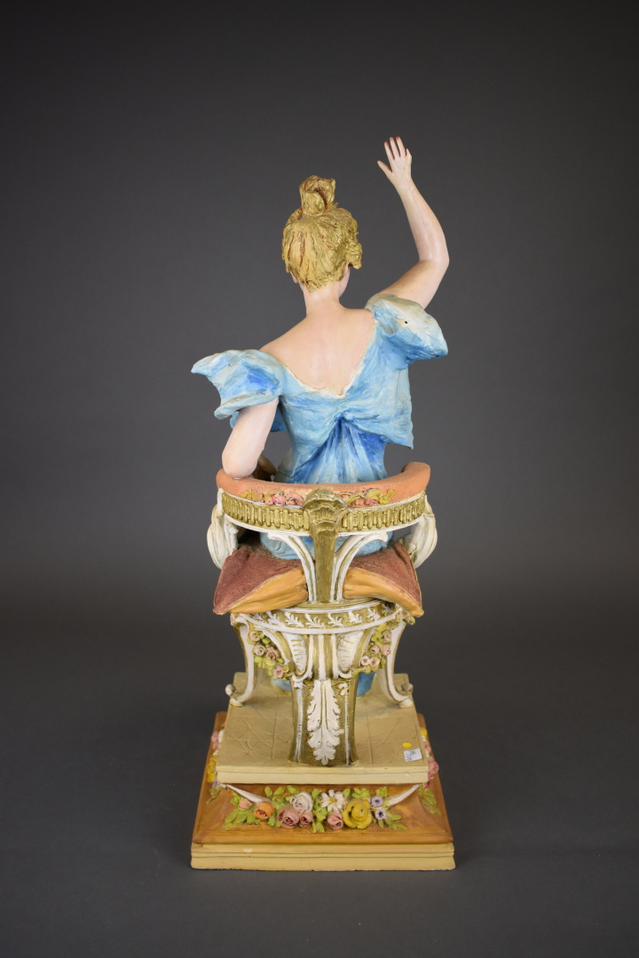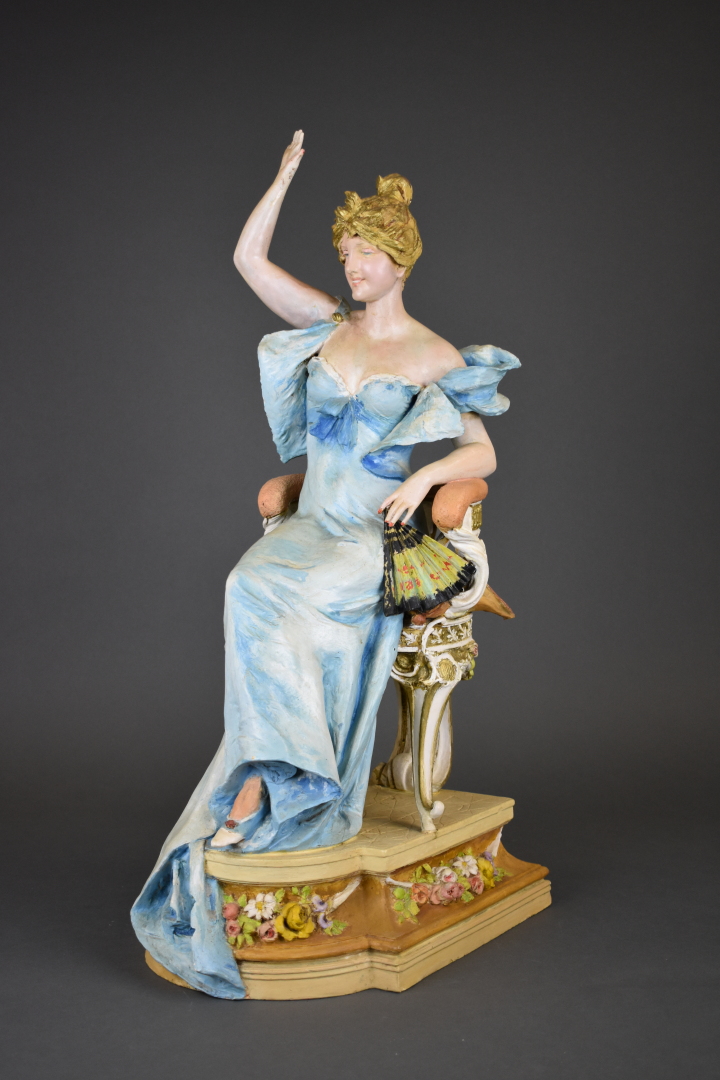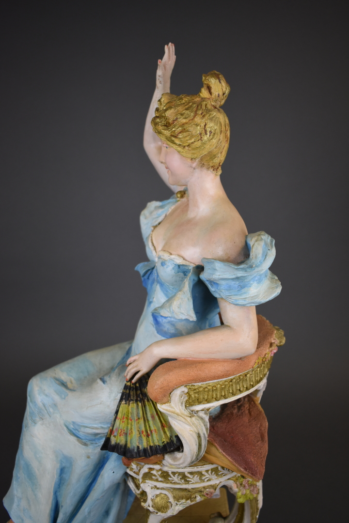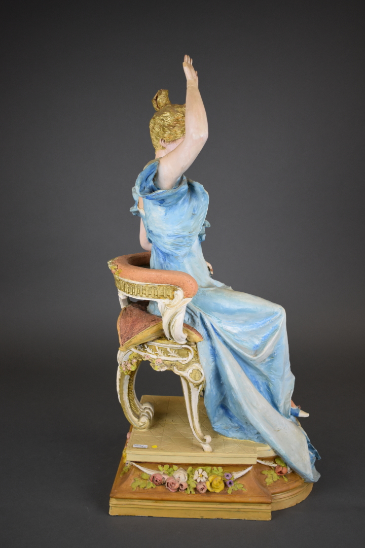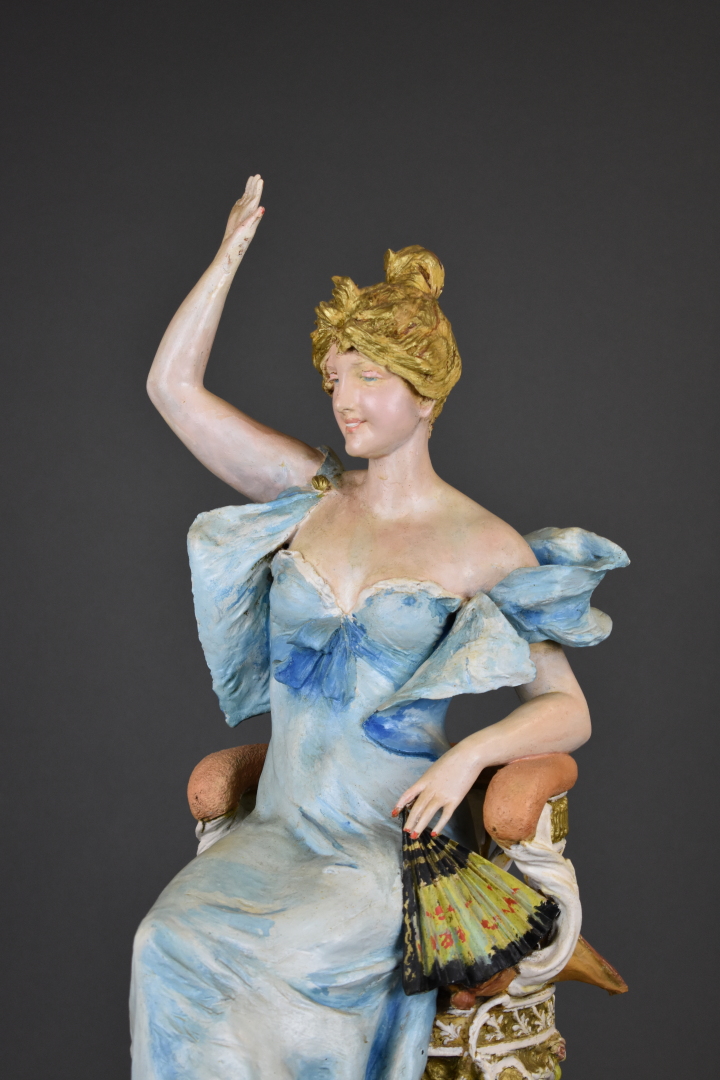 Sujet en céramique peinte représentant une élégante à la robe bleue, assise sur un fauteuil, saluant de la main (manques, restaurations, repeints). Amphora. Marqué RSK au dessous Riessner Stellmacher et Kessel 09 et Austria 1609 et 12. Vers 1900. Haut. : 67 cm.