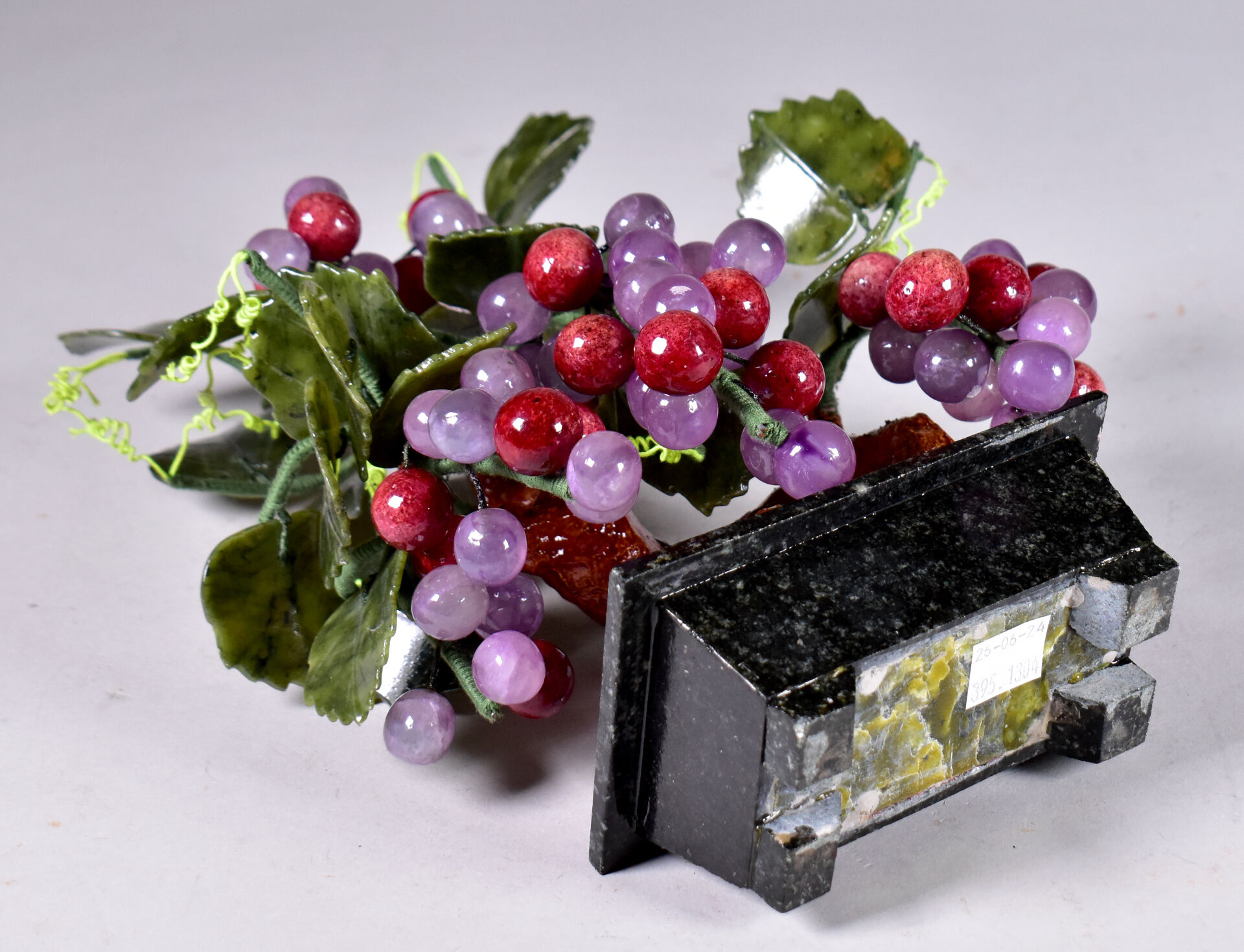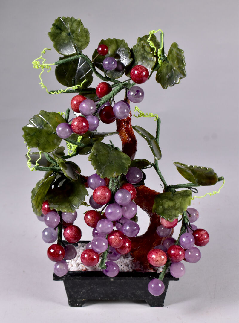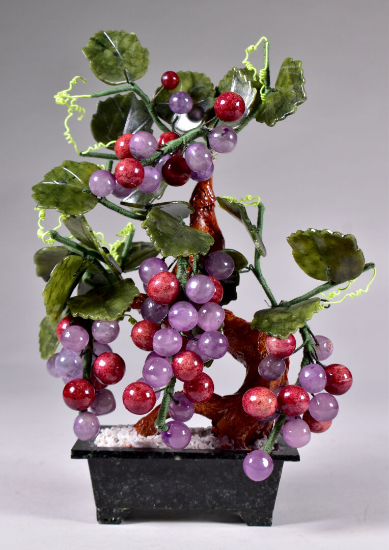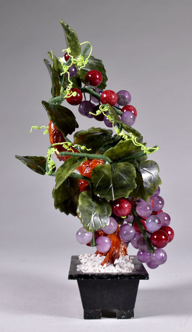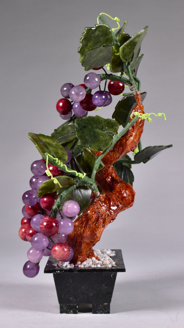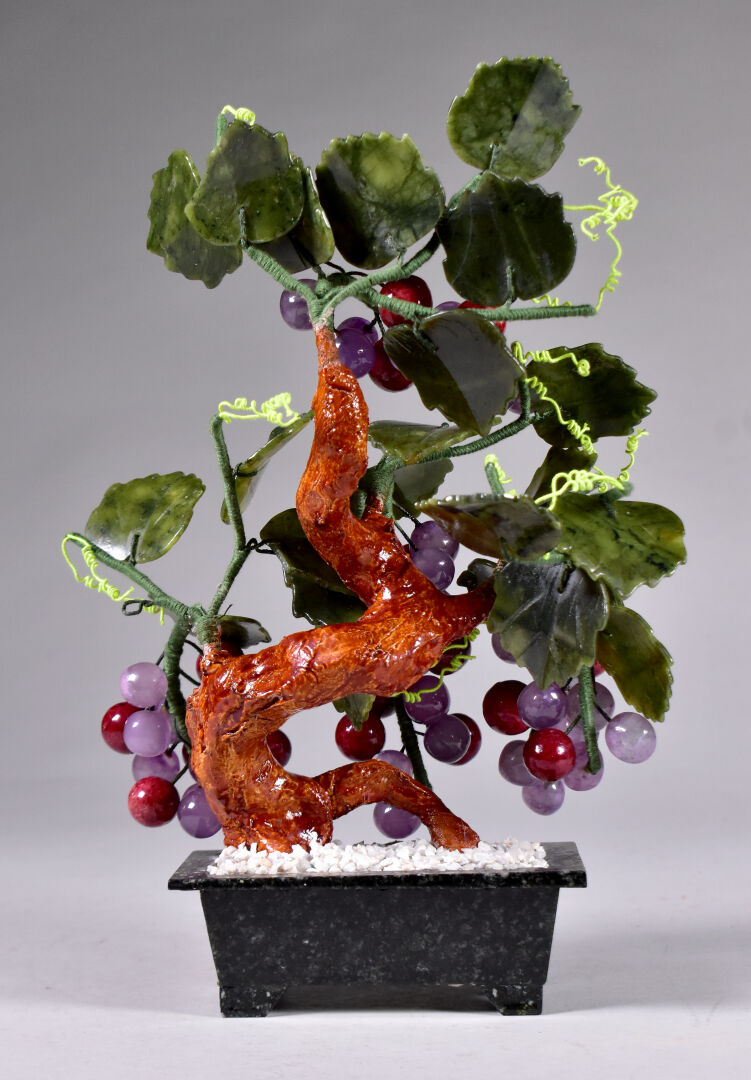 Sujet en céramique, pierre dure et métal représentant un sarment de vigne sortant d’un pot. Travail probablement Chinois, XXe siècle. Haut. : 29 cm.