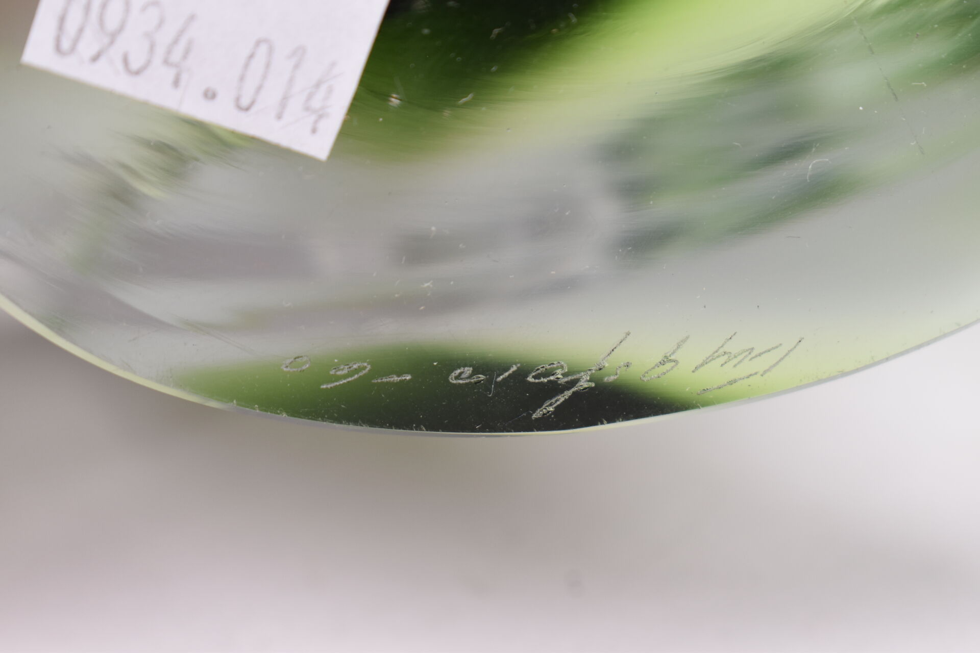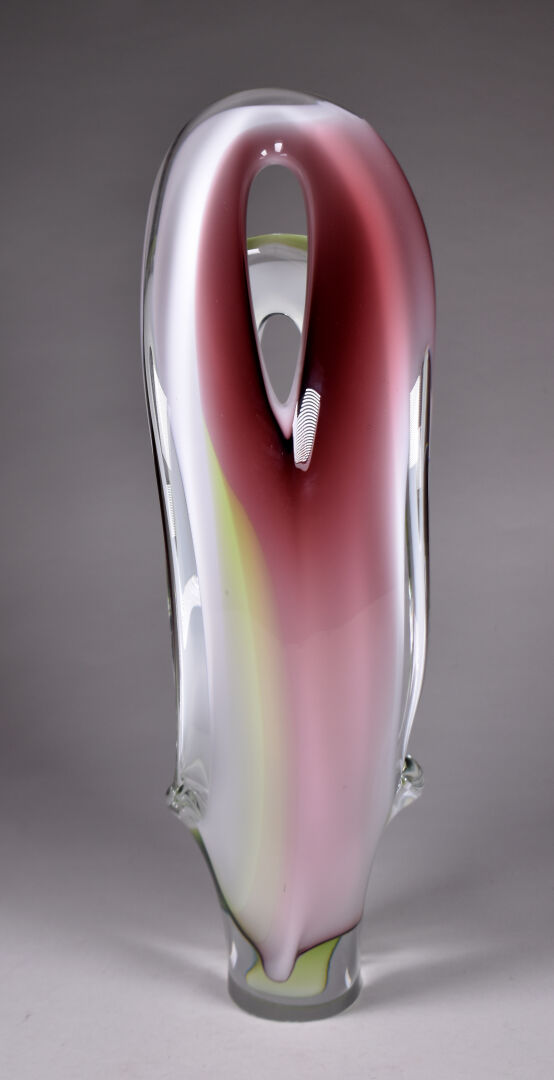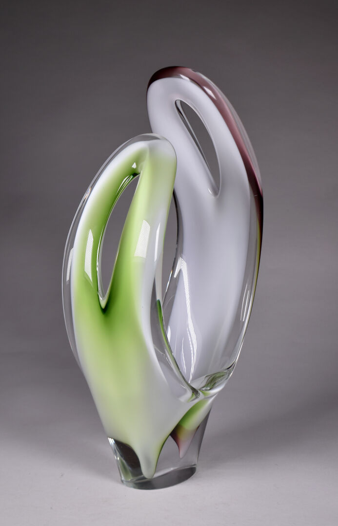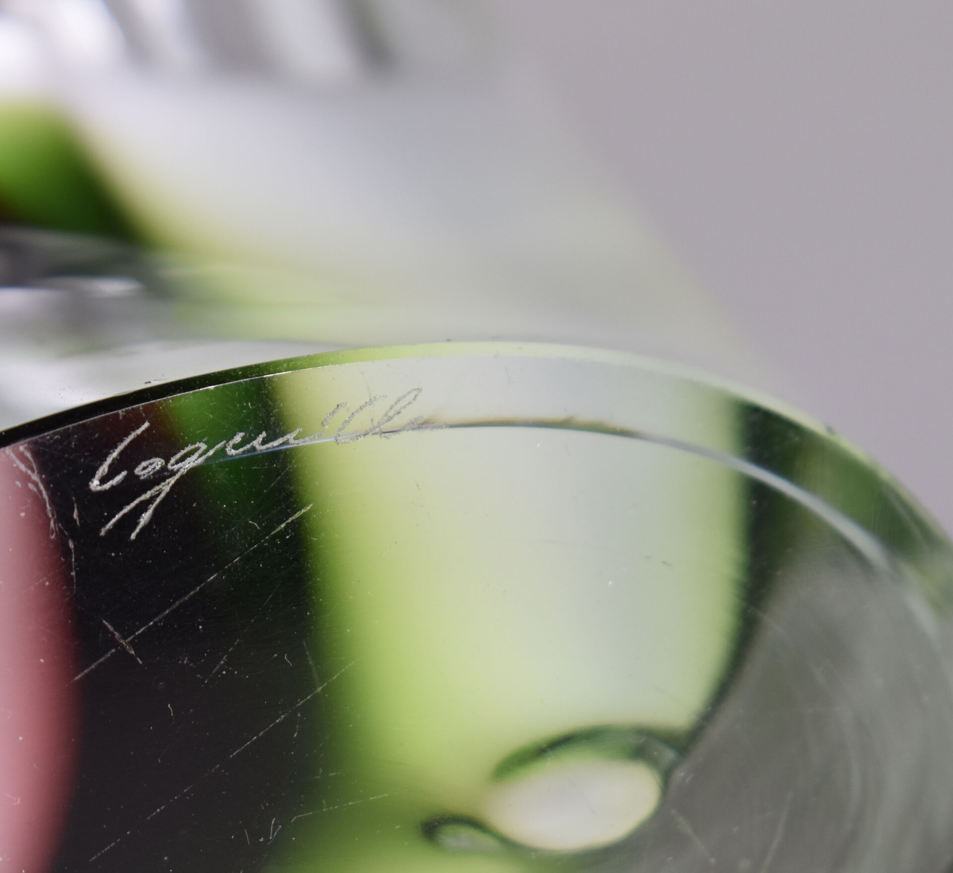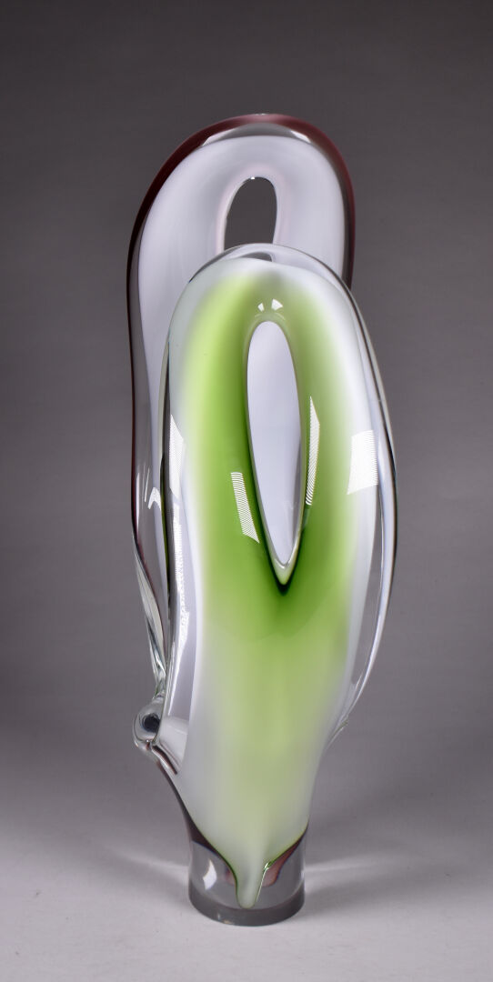 Sujet en cristal multicouche blanc, vert et prune; Signé et daté 2006 au dessous. Haut. : 43 cm.
