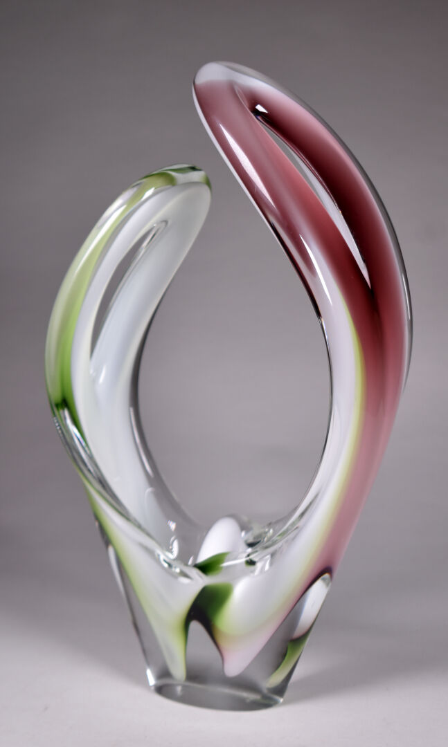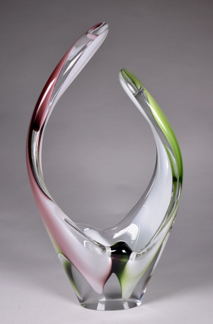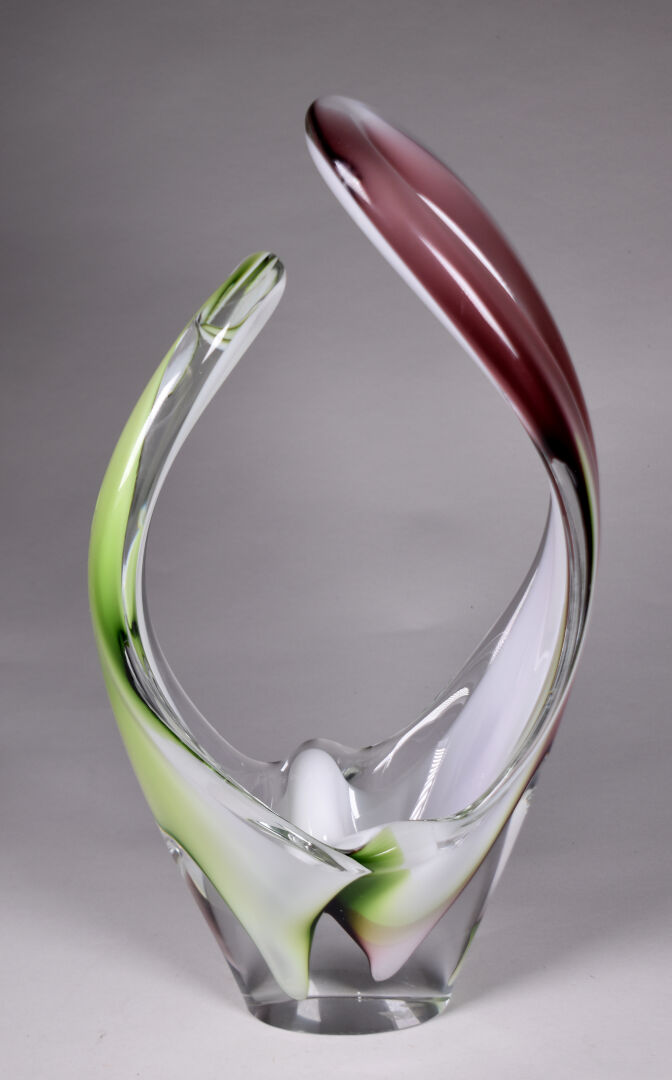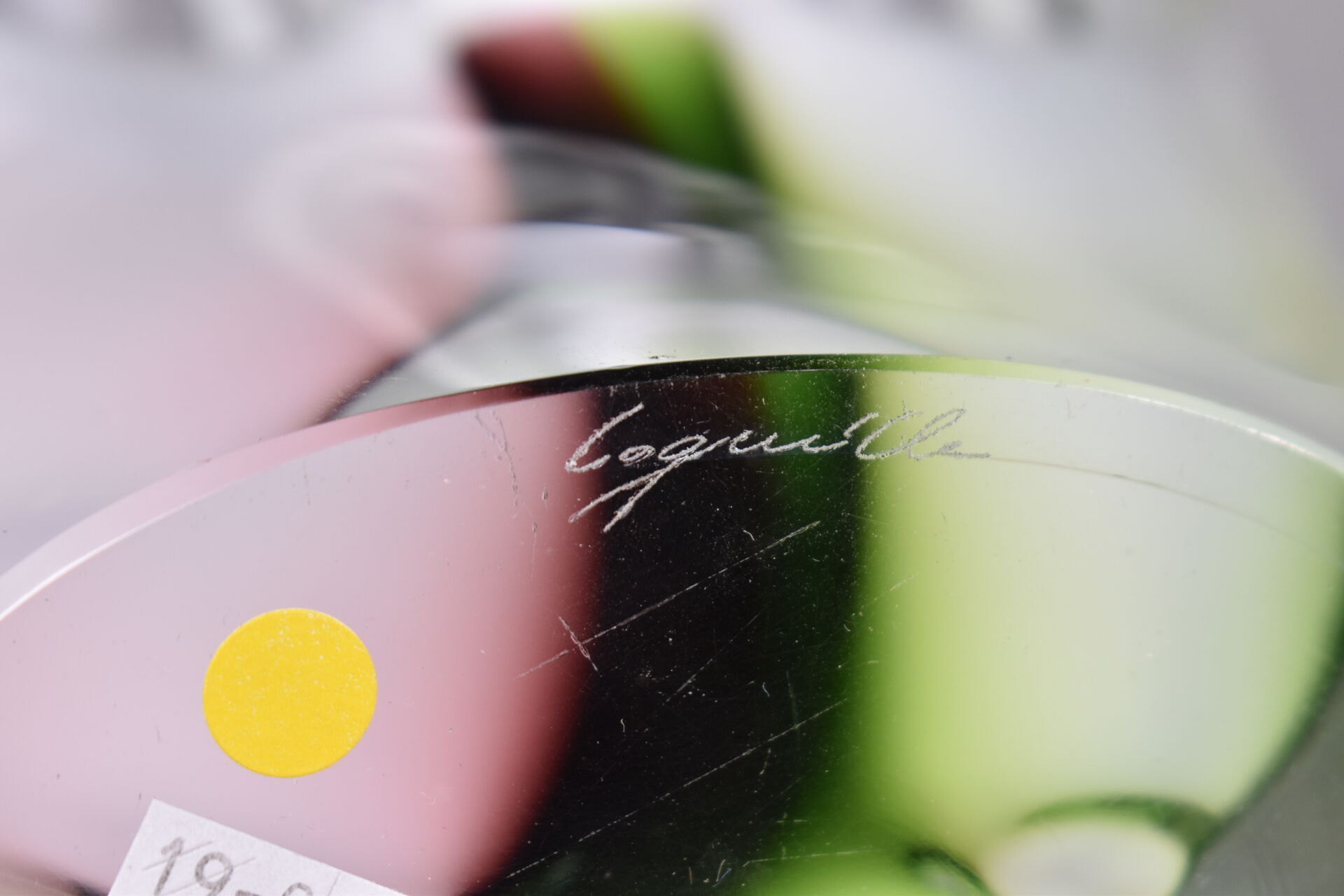 Sujet en cristal multicouche blanc, vert et prune; Signé et daté 2006 au dessous. Haut. : 43 cm.