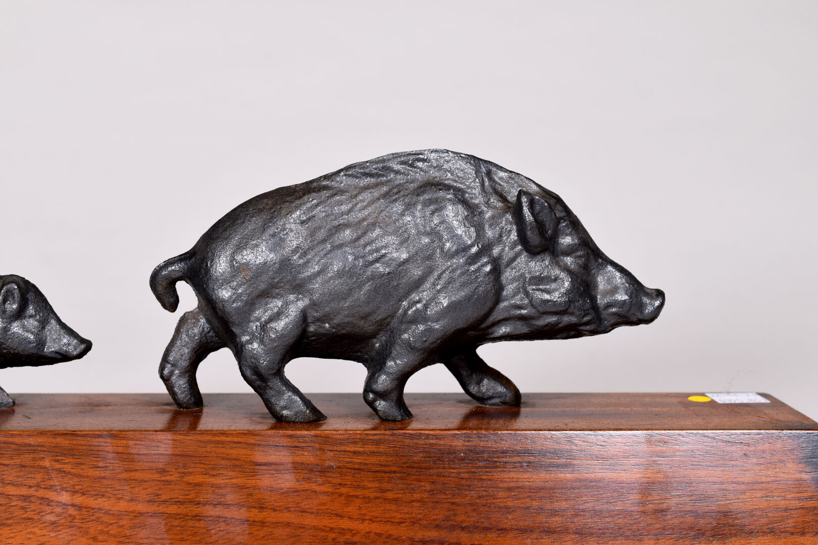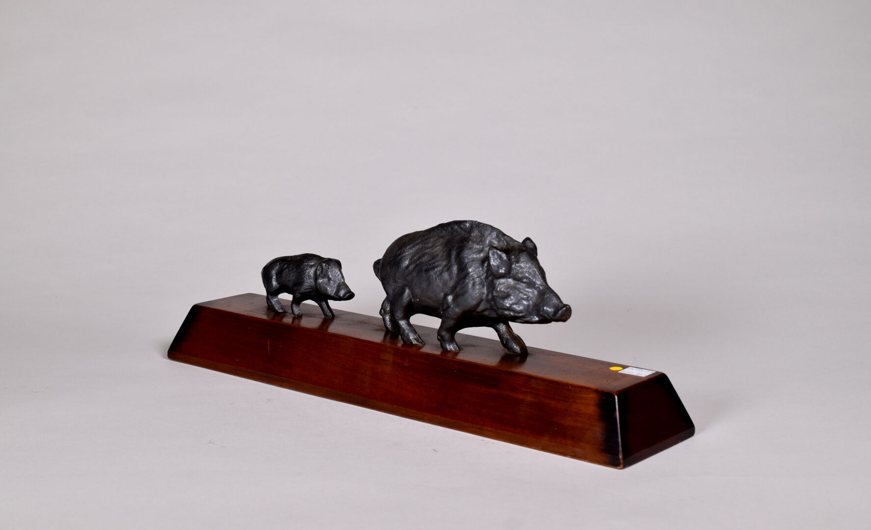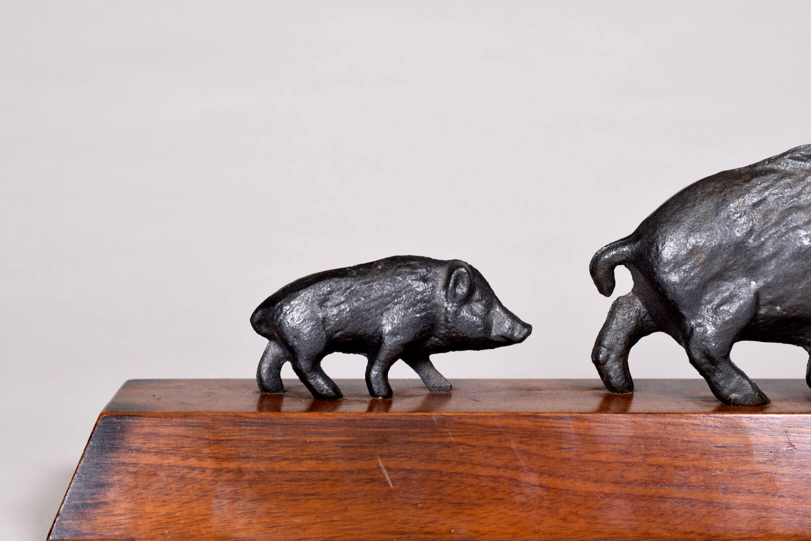 Sujet en fonte représentant un sanglier et un marcassin, la base en acajou. XXe siècle. Haut. : 15 cm – Larg. : 42,5 cm – Prof. : 9,5 cm.