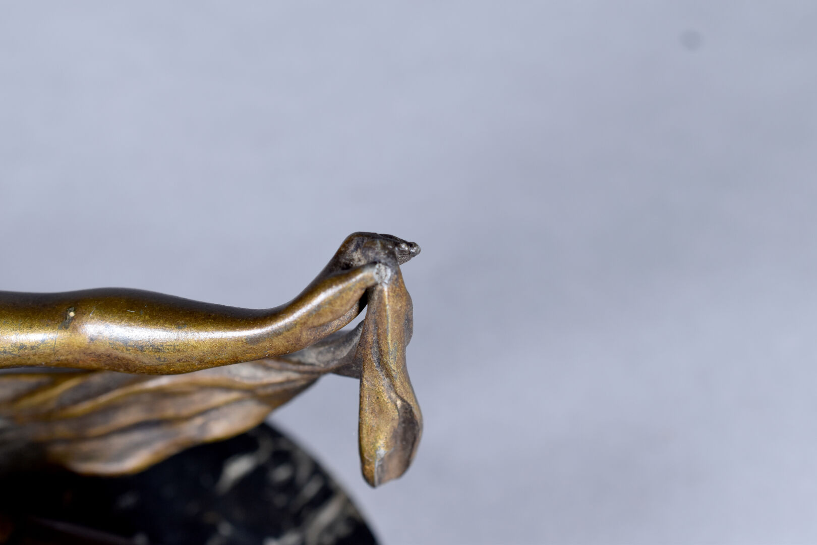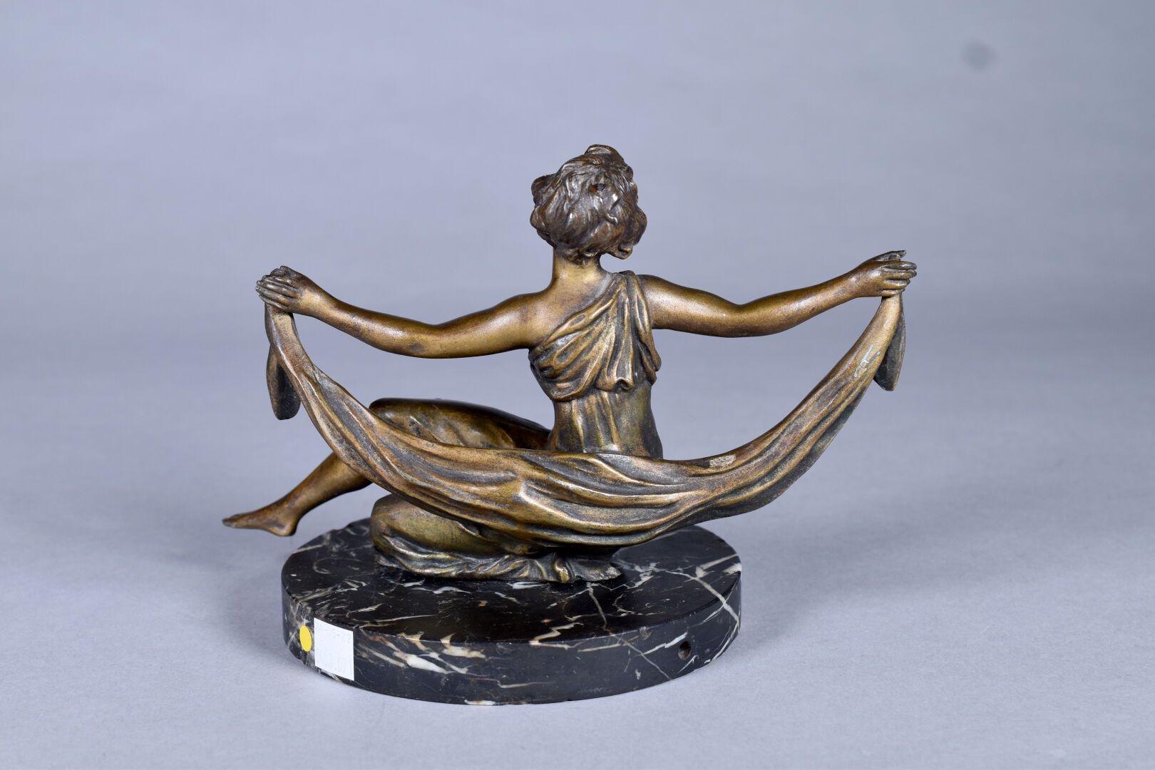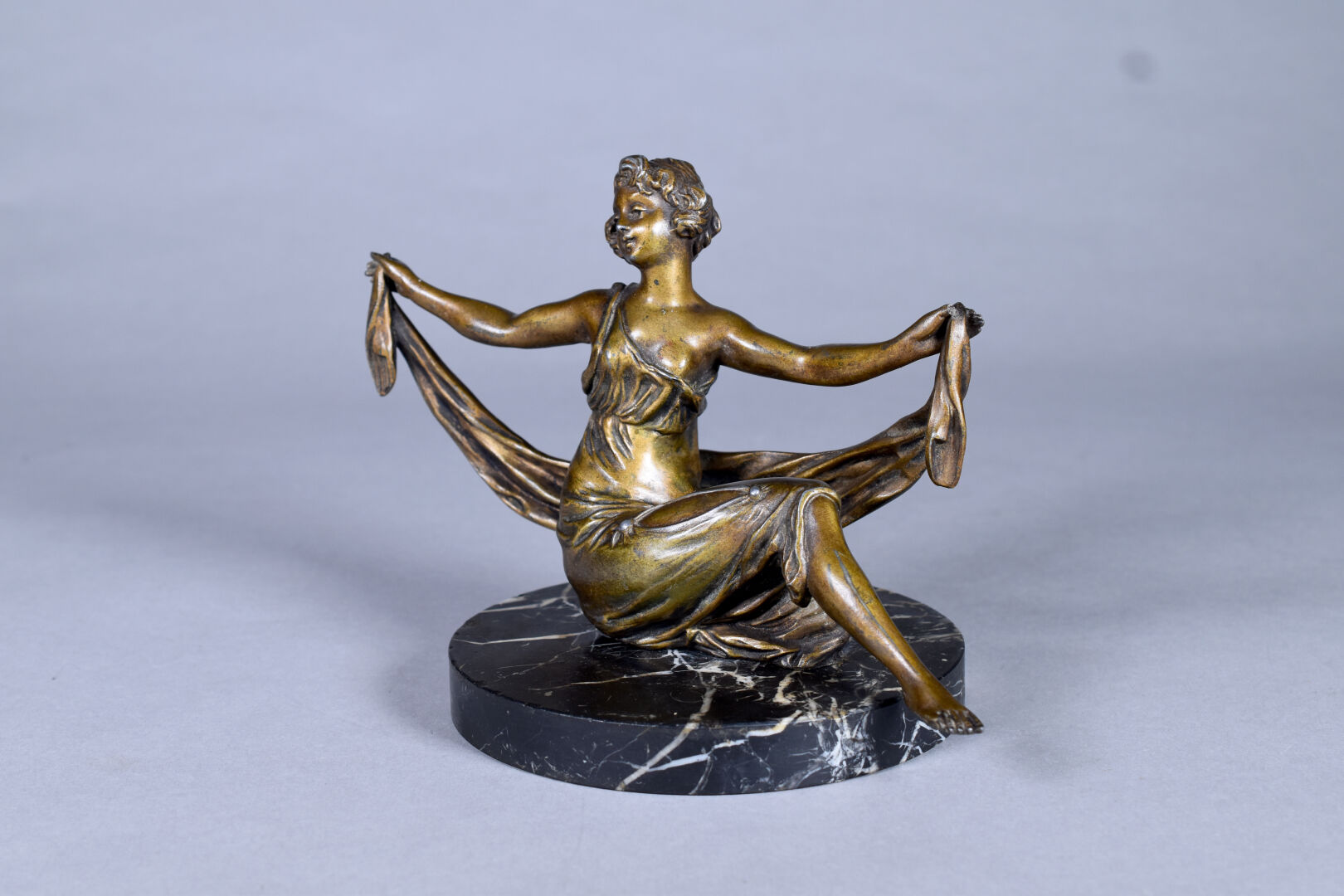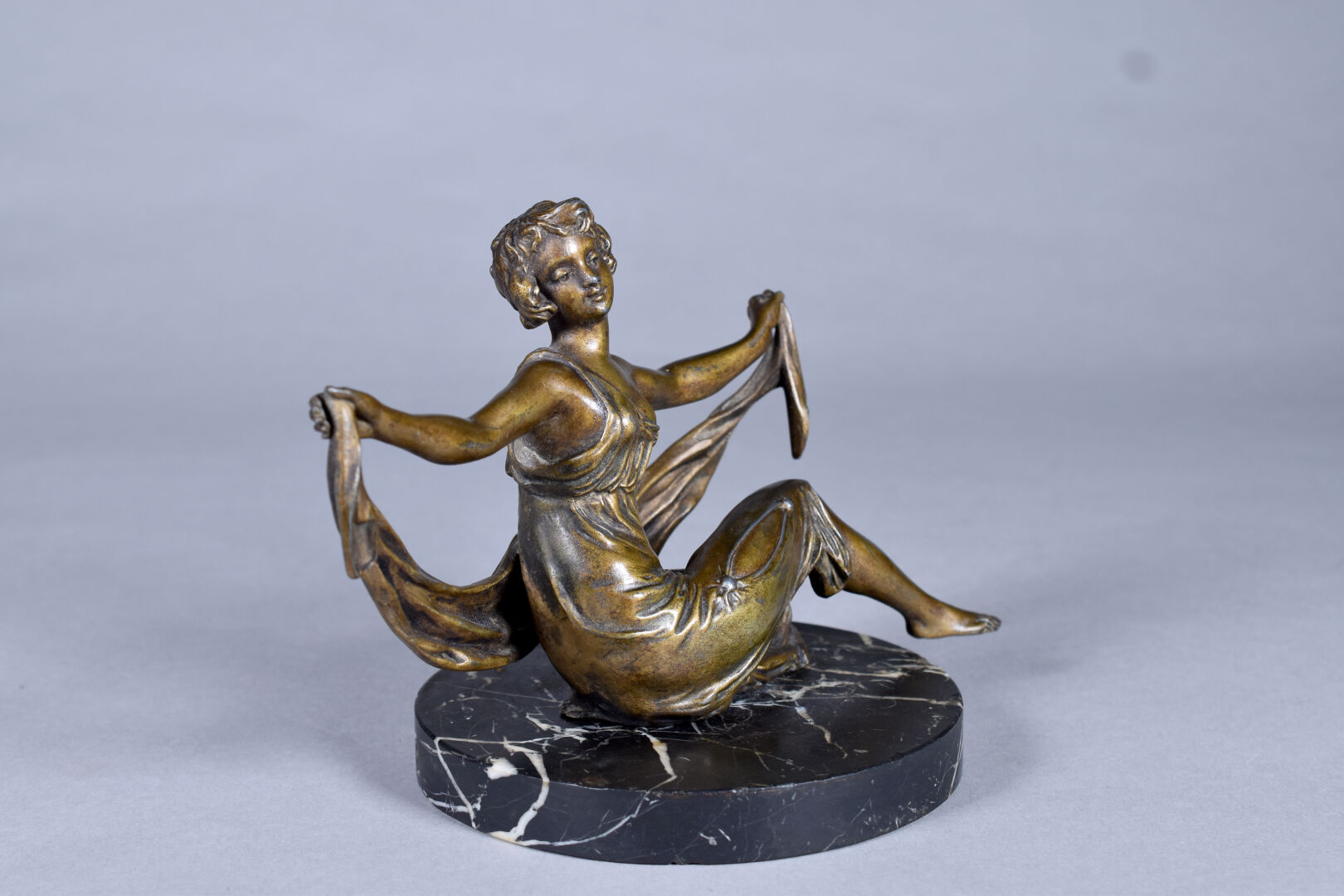 Sujet en régule patiné bronze figurant une femme assise au drapé. Socle de marbre noir veiné blanc (manque un pouce, rapporté ?, une restauration au socle). Vers 1900. Haut. : 17 cm.