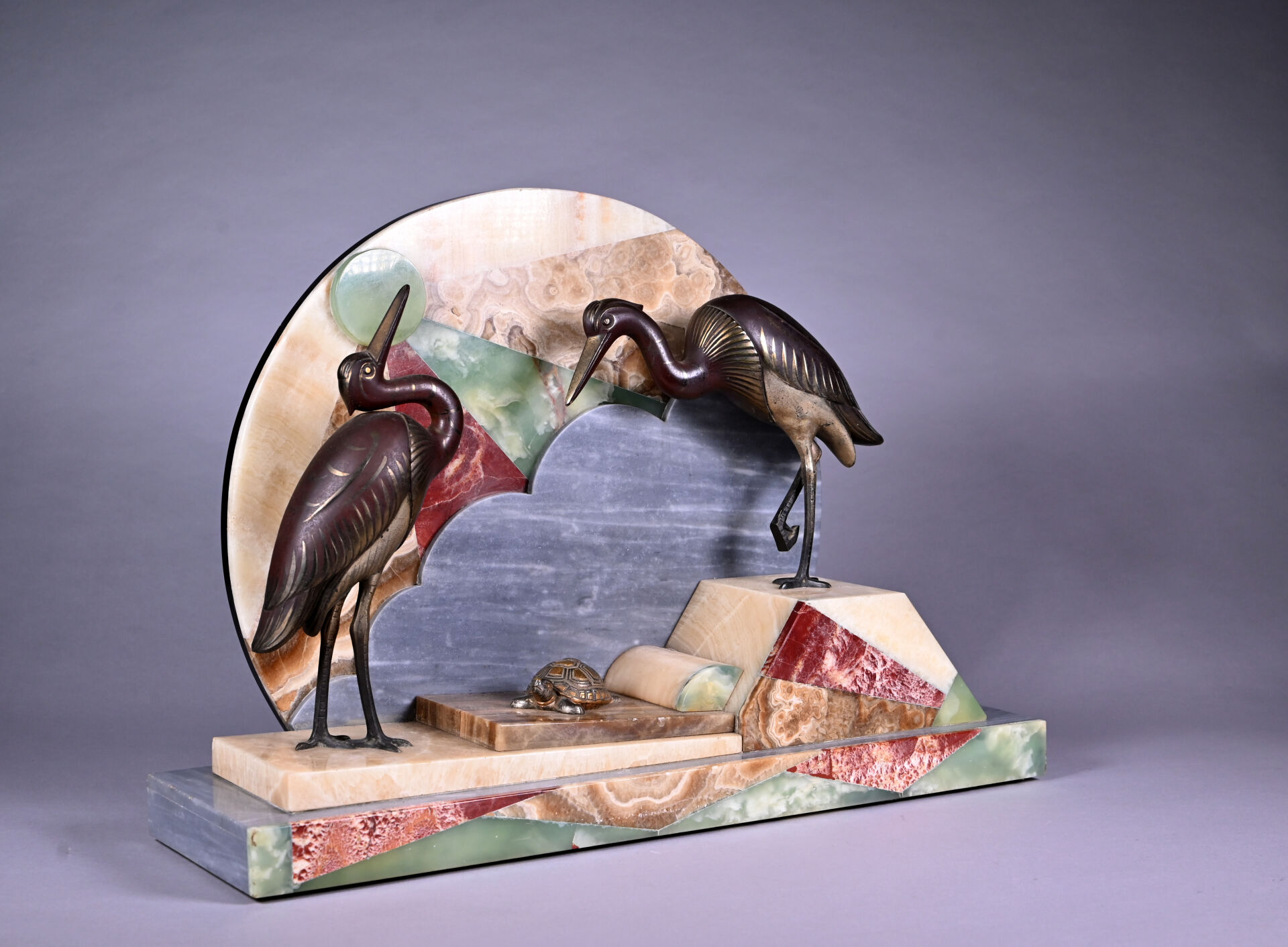 Sujet en régule patiné brun et doré, pierre dure et onyx représentant deux hérons ou grues convoitant une tortue.; Vers 1930. Haut. : 40 cm – Larg. : 56 cm – Prof. : 17,5 cm.