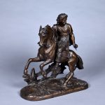 Sujet en régule patiné brun figurant un cavalier gaulois tenant une lance (un accident à la queue du cheval). Fin du XIXe ou début du XXe siècle. Haut. : 29,5 cm.