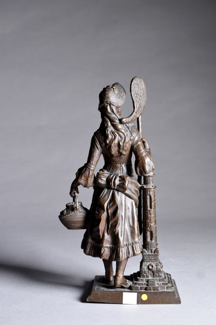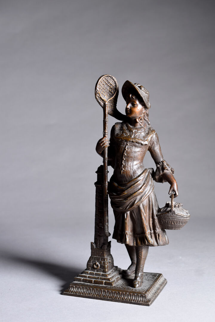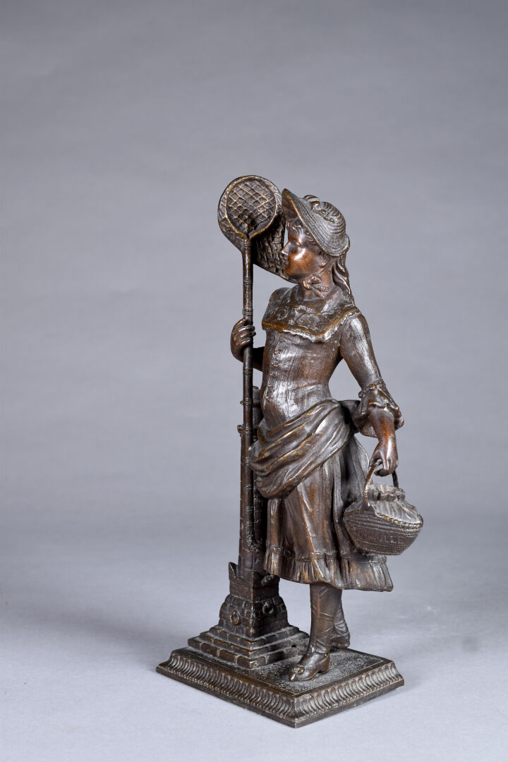 Sujet en régule patiné brun figurant une chasseuse de papillon (un fèle au socle). Fin du XIXe ou début du XXe siècle. Haut. : 33 cm.