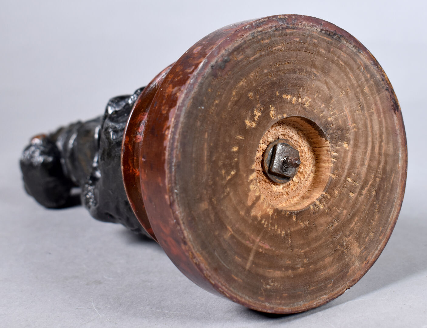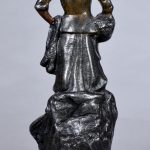 Sujet en régule patiné brun représentant une poissonnière (usures). Socle en bois à l’imitation du marbre. Haut. : 29 cm.