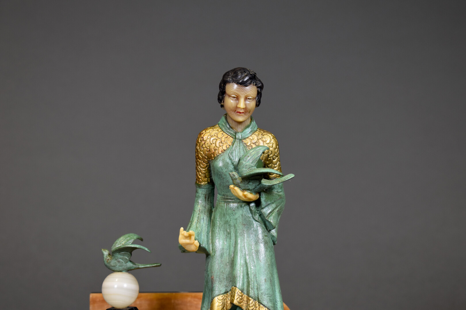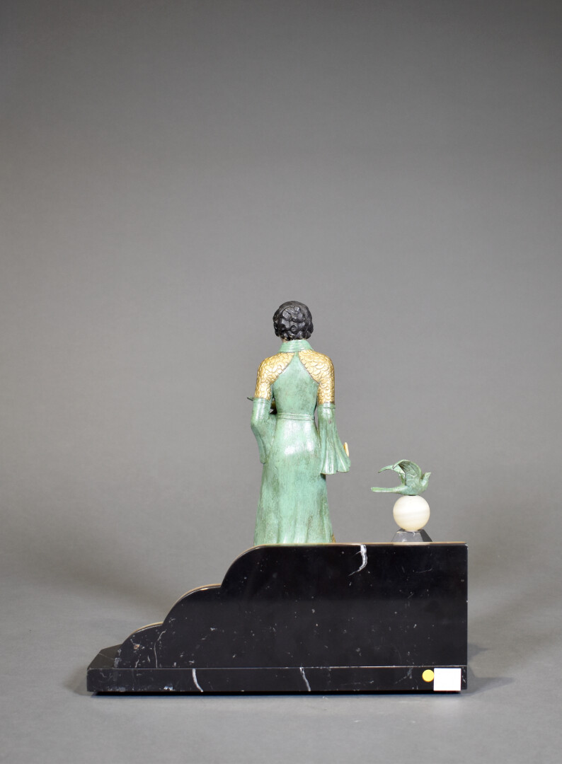 Sujet en régule repatiné vert et or, pierre dure et résine à l’imitation de l’ivoire représentant une femme tenant une colombe dans sa main gauche. Une seconde étant posée sur une colonne terminée par une sphère, à ses côtés. Vers 1930/1940. Haut. : 30,5 cm.