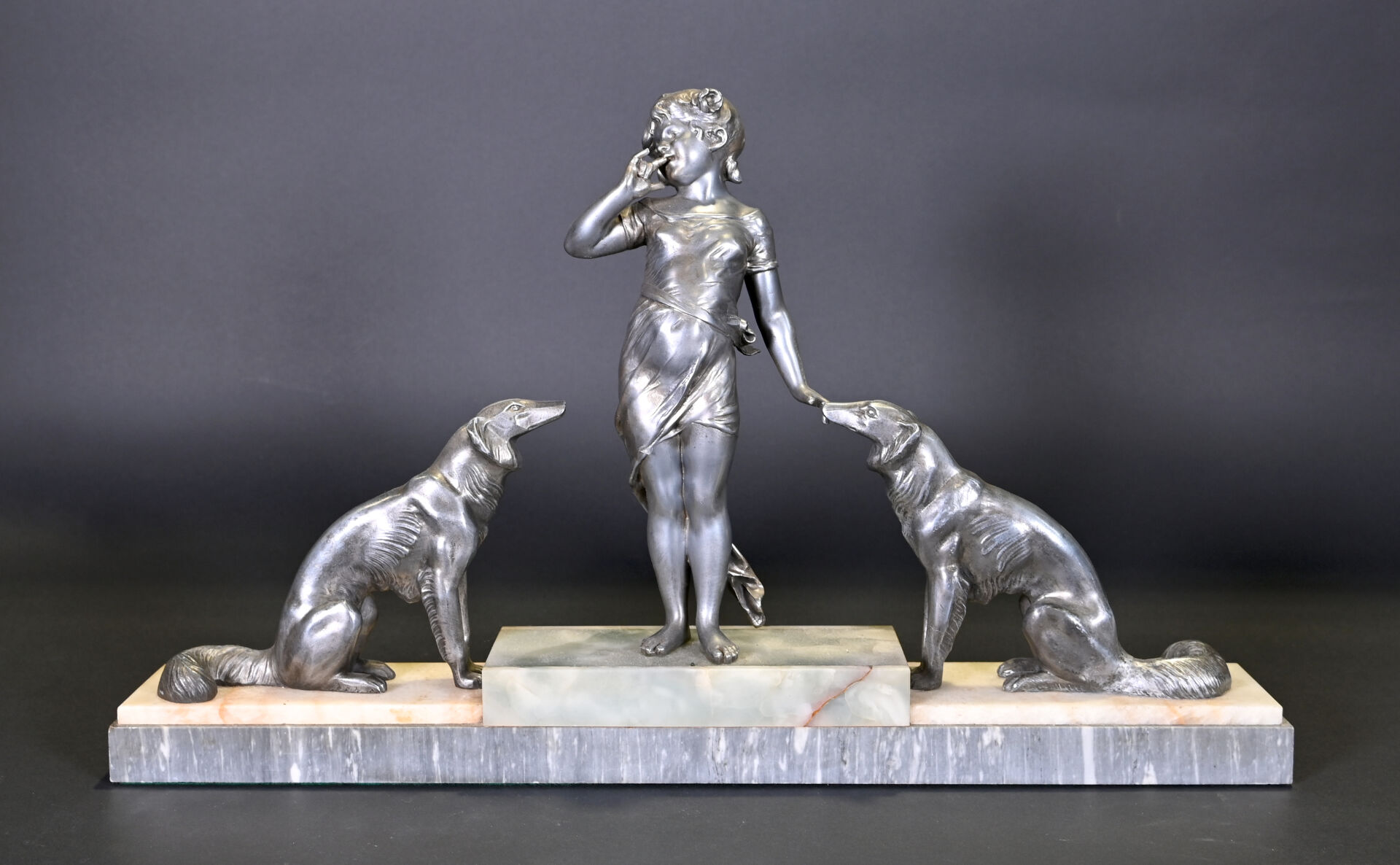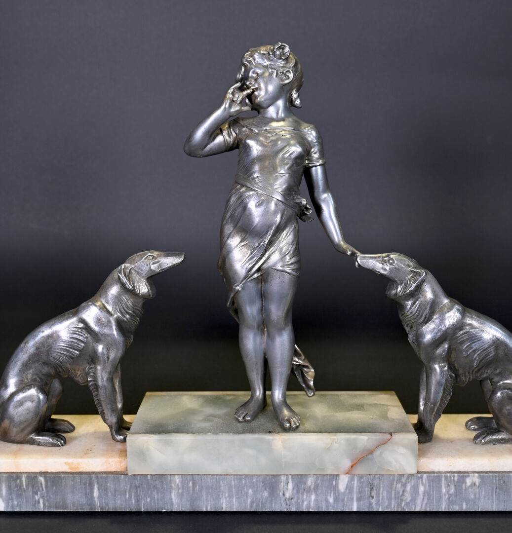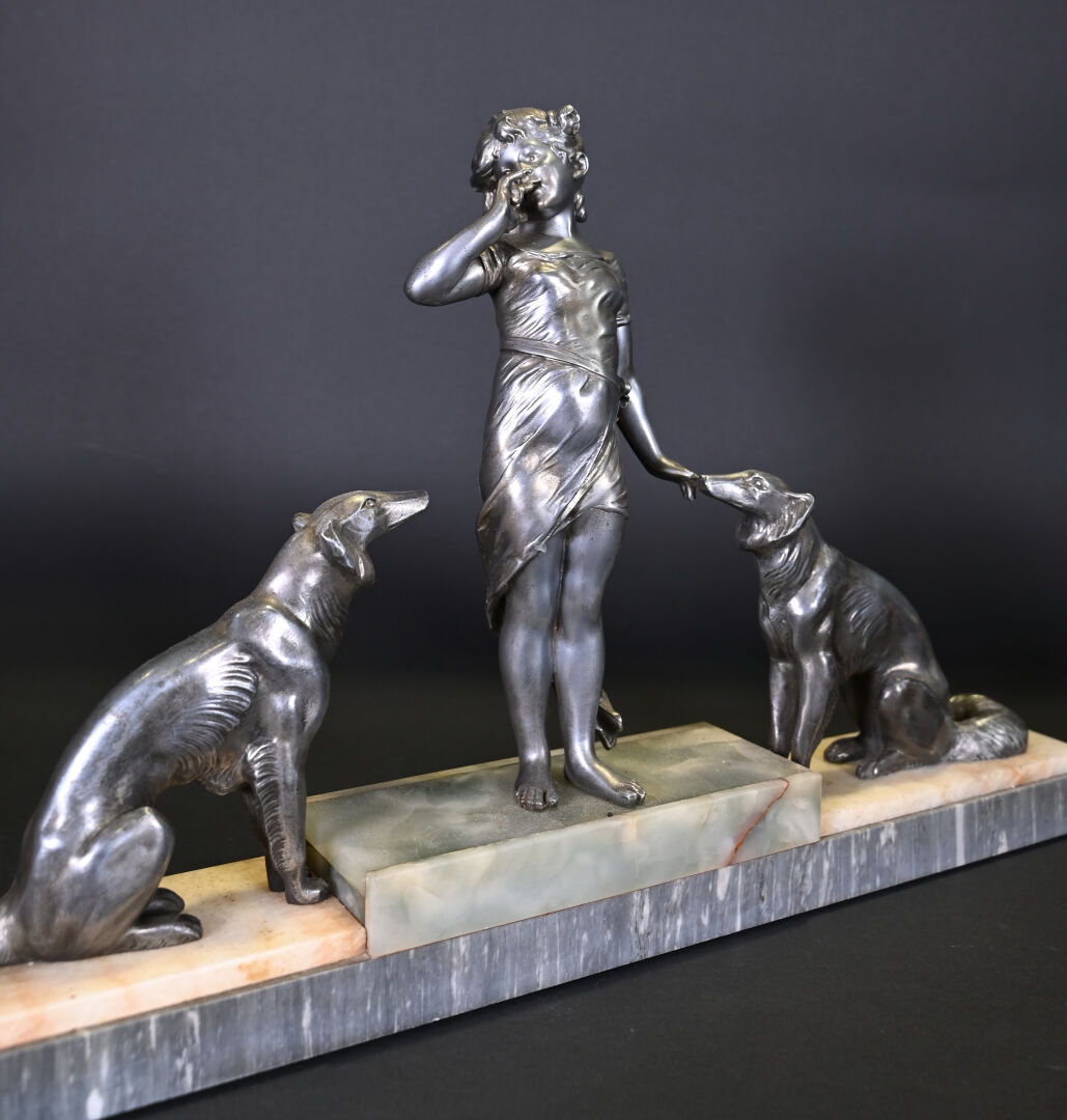 Sujet en régule représentant une jeune fille aux chiens, socle de pierre dure et marbre. Vers 1920. Haut. : 35 cm – Larg. : 59 cm – Prof. : 8,5 cm.