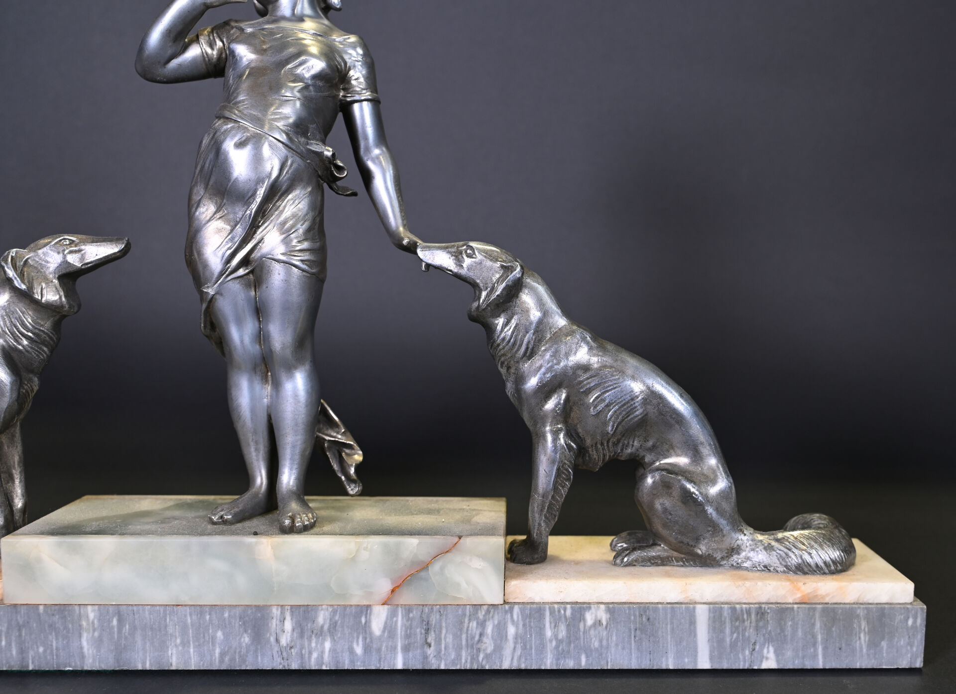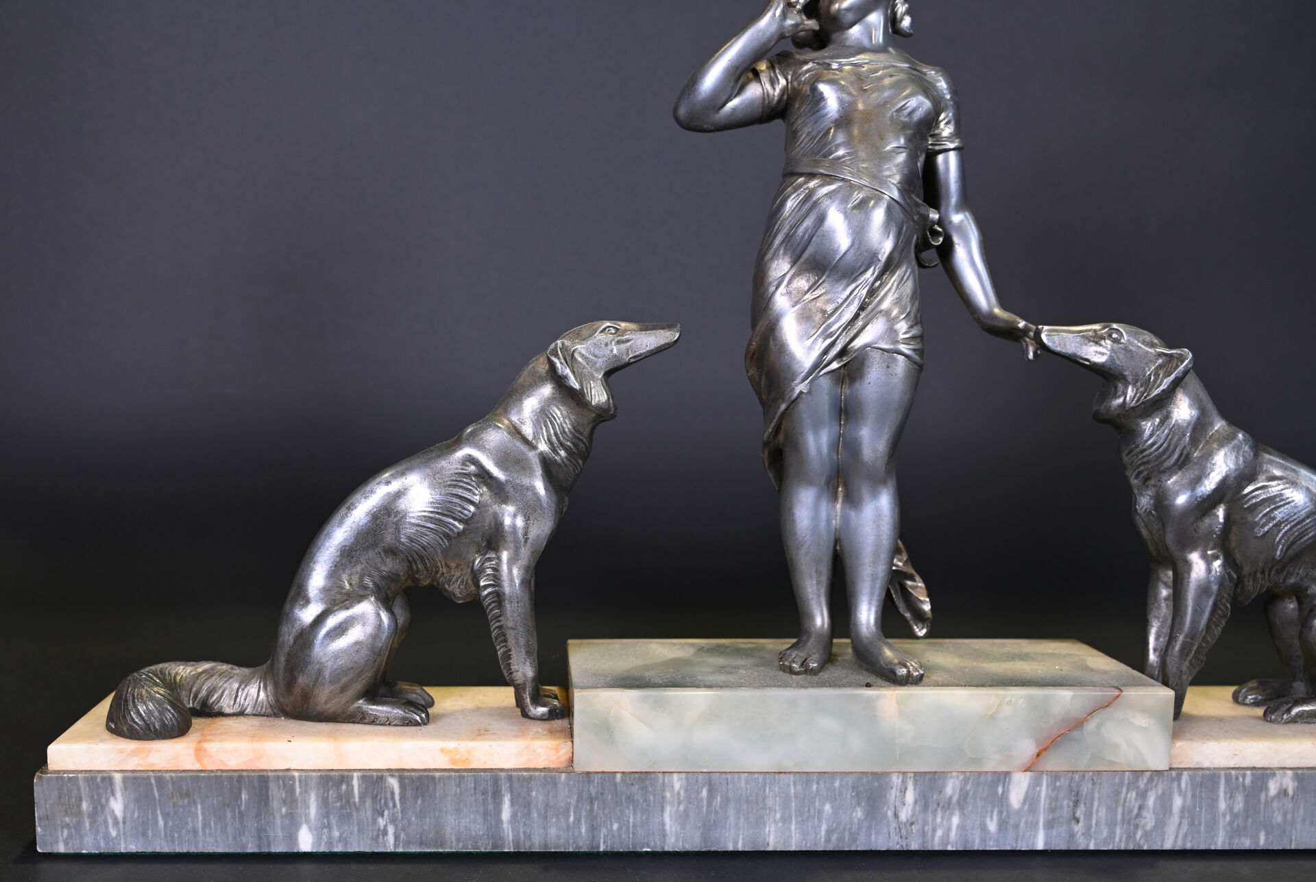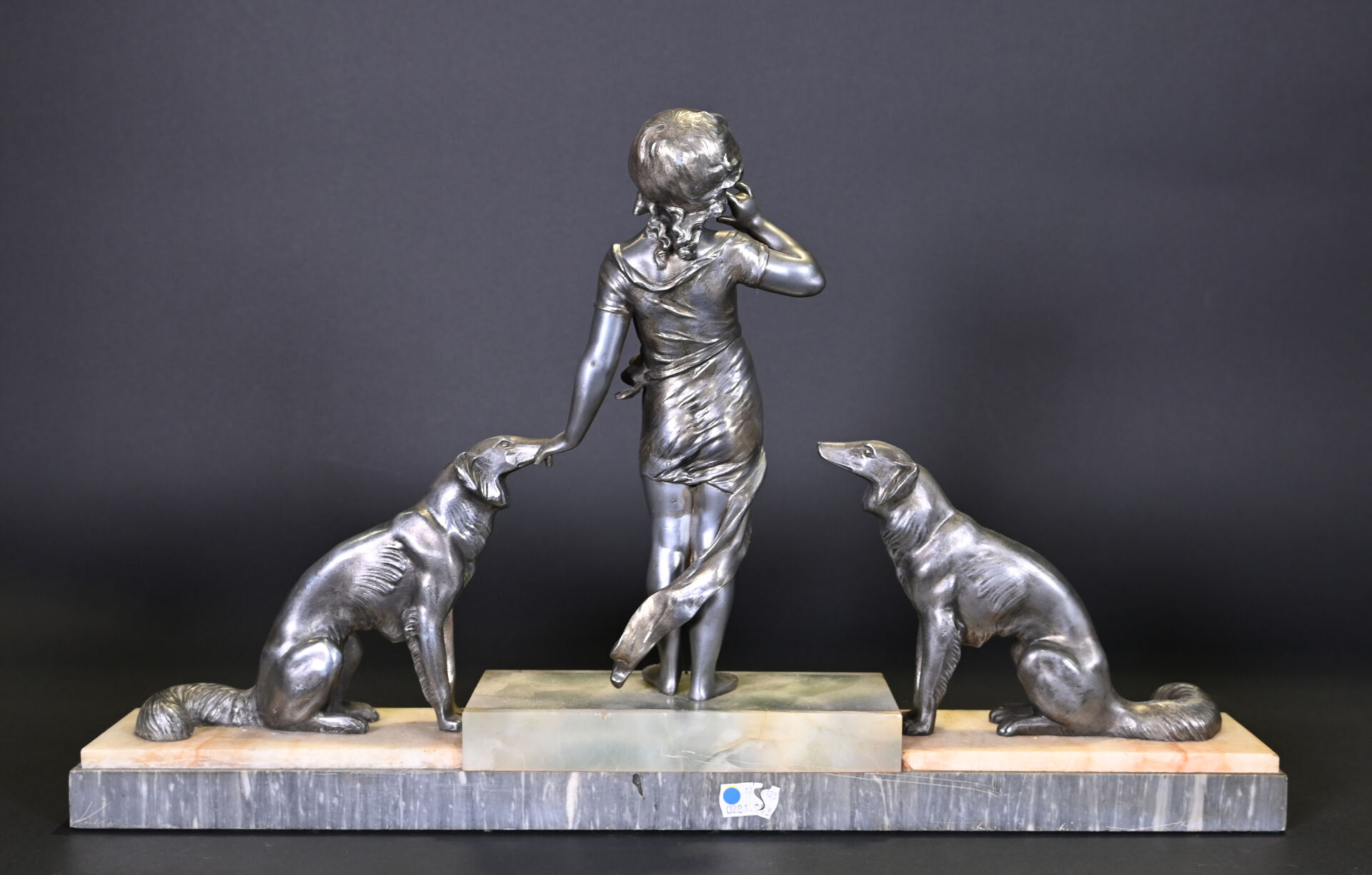 Sujet en régule représentant une jeune fille aux chiens, socle de pierre dure et marbre. Vers 1920. Haut. : 35 cm – Larg. : 59 cm – Prof. : 8,5 cm.