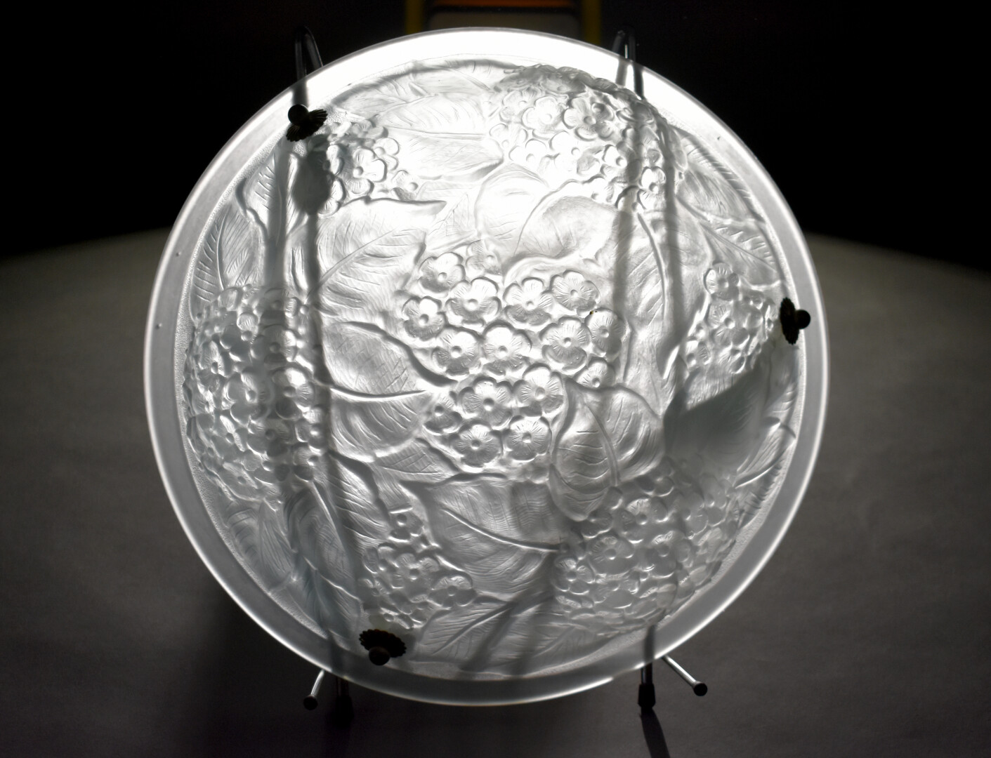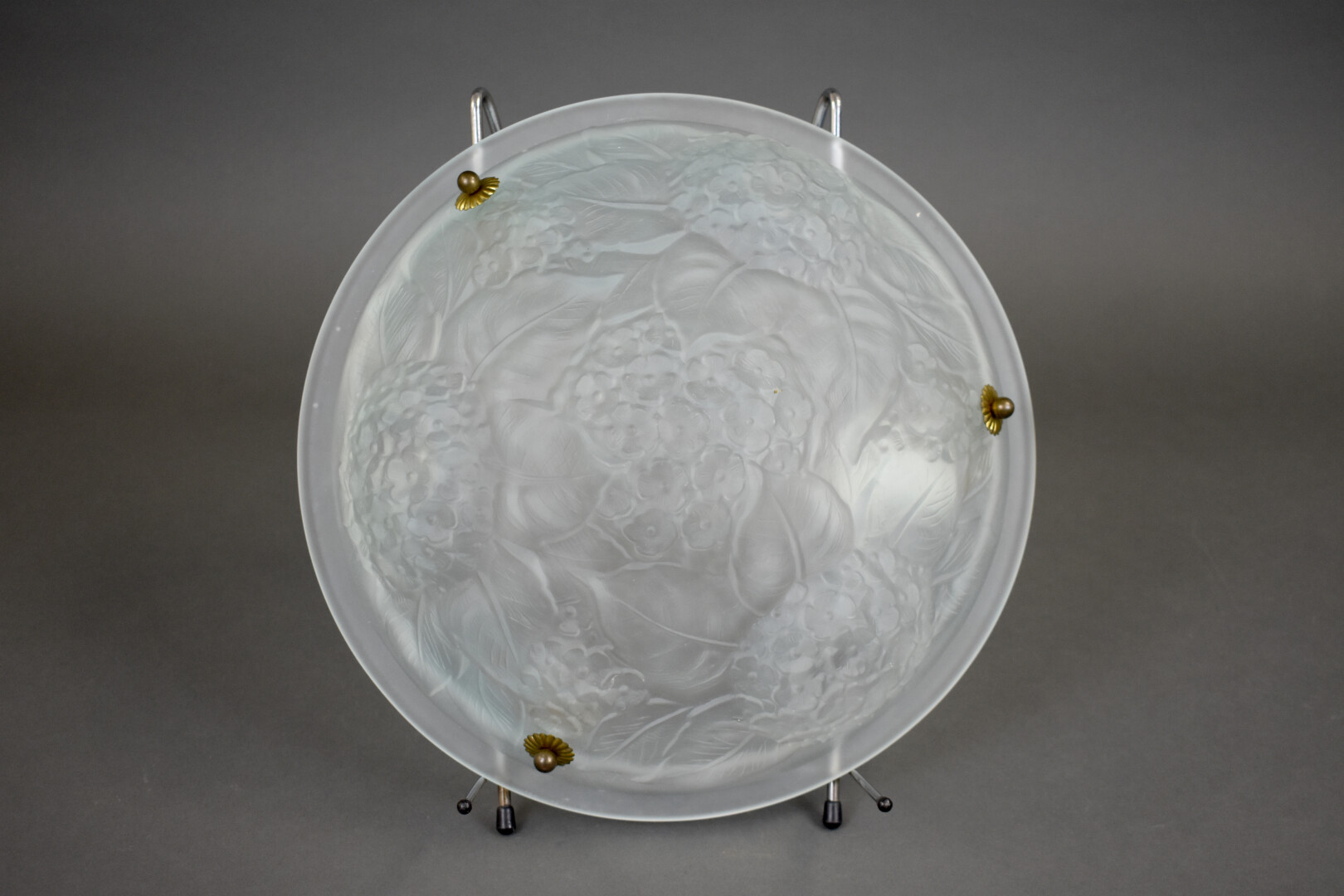 Suspension à vasque en verre moulé légèrement bleuté à décor d’hortensias. Signée. Début du XXe siècle. Haut. : 63 cm – Diam. : 35 cm.
